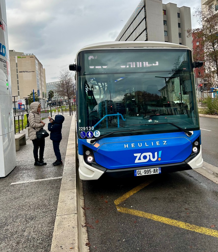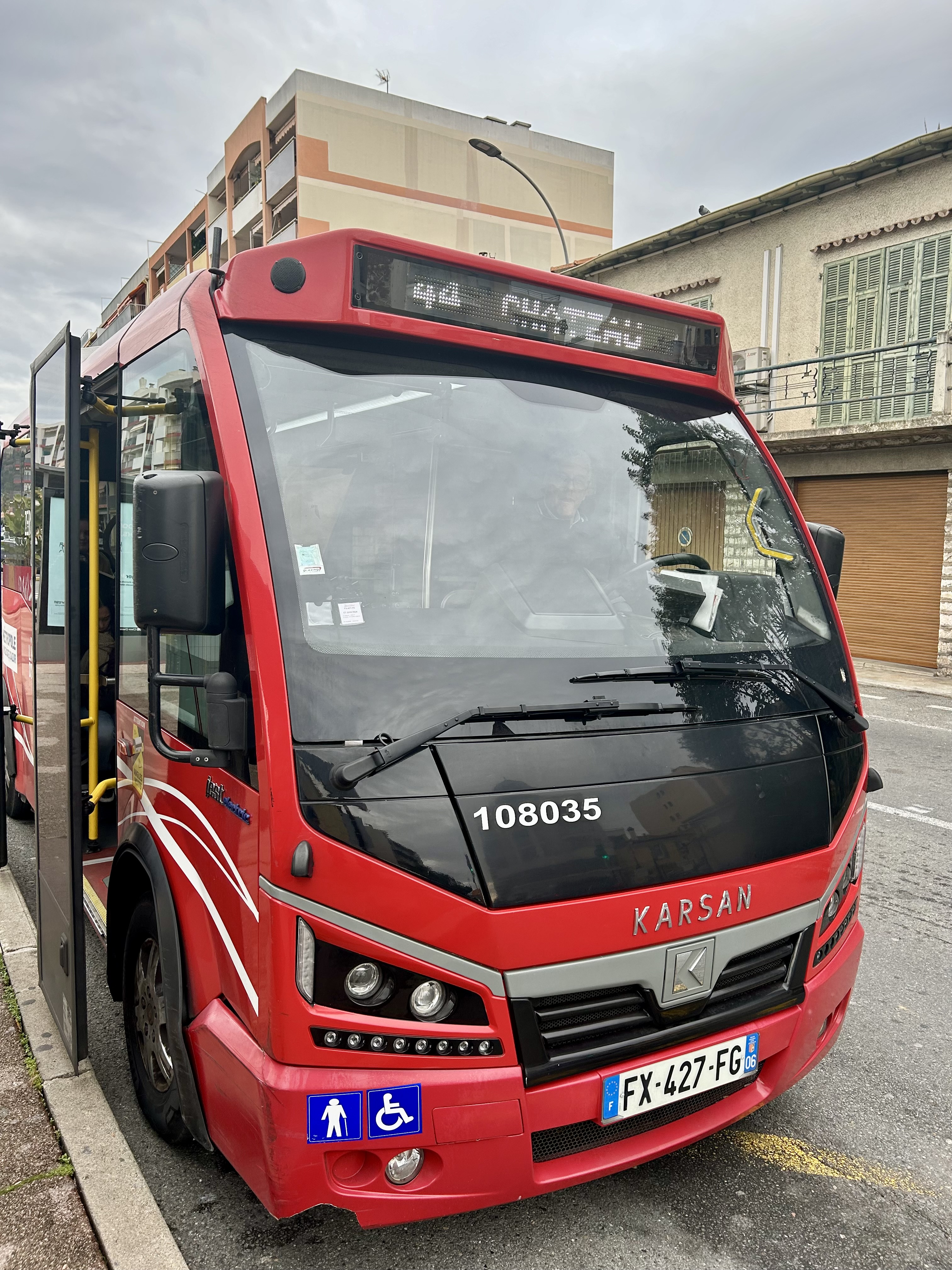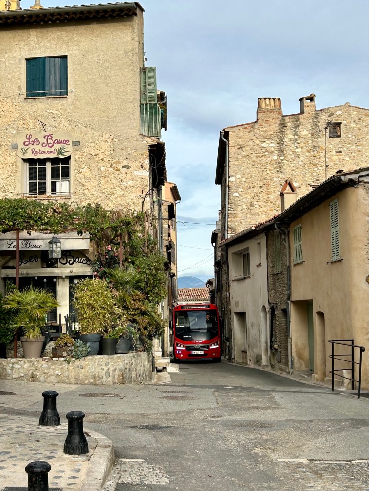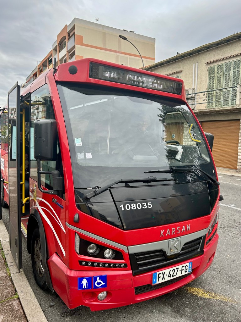 Bem próximo, praticamente junto, fica a parada de um pequeno ônibus elétrico vermelho que vai até o topo da colina. Esse ônibus é circular, funciona diariamente e é gratuito. A viagem é super rápida e surpreende porque o ônibus circula em vielas bem estreitas. A parada em Haut é próximo do Castelo Grimaldi.