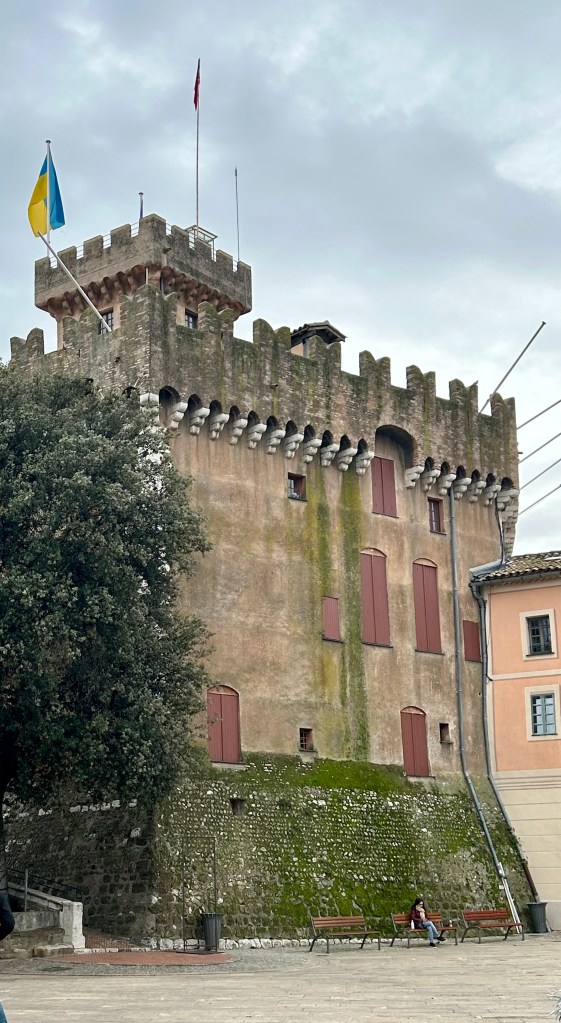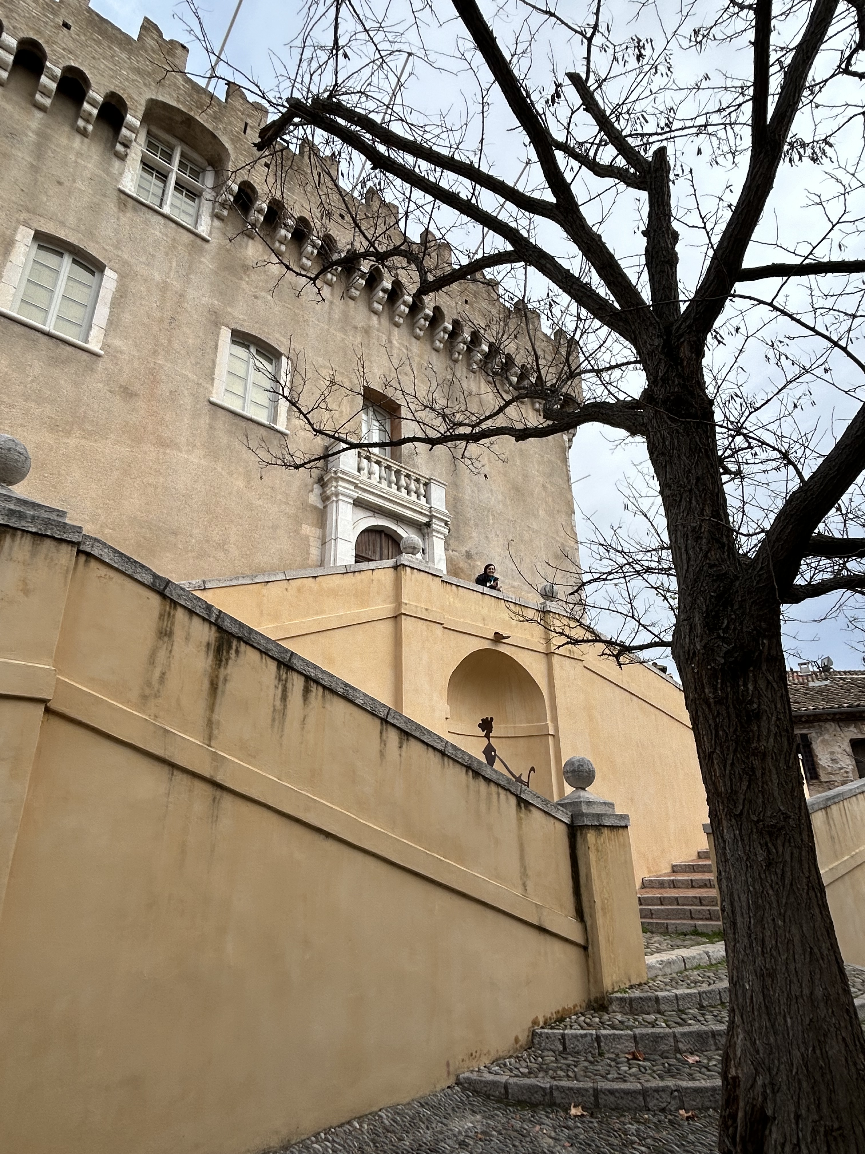O Castelo Grimaldi, que está no ponto mais alto da colina, de onde pode-se avistar o Mar Mediterrâneo, fica fechado nas terças-feiras , dia em que visitamos o local e, portanto, não pudemos entrar. Há vários pequenos restaurantes no entorno do castelo, mas apenas um estava aberto, o que nos possibilitou uma pausa para um vinho da região.