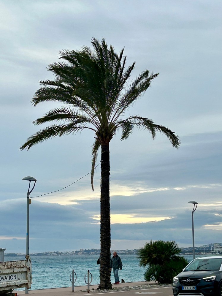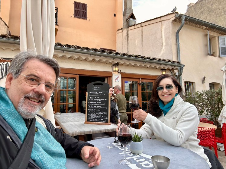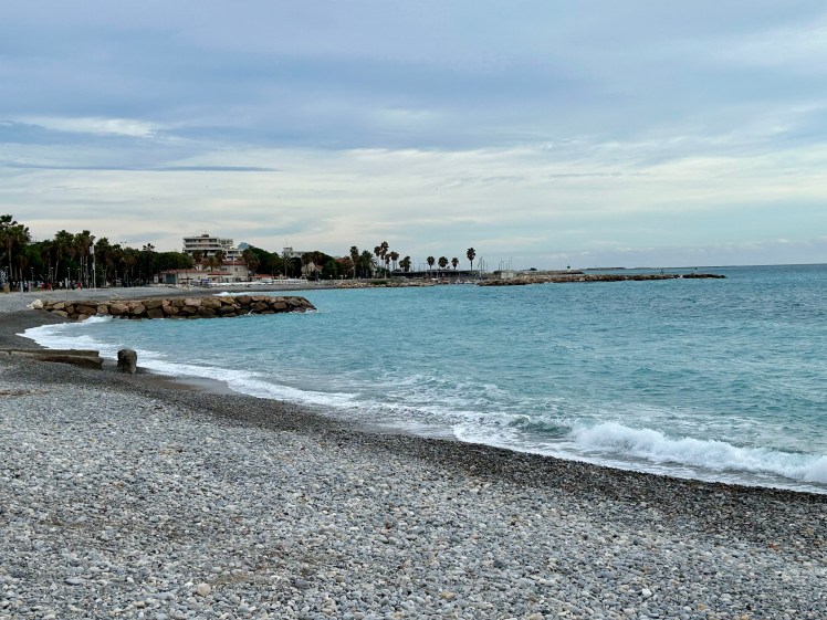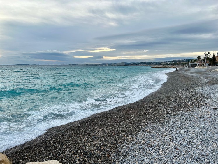 São mais de 3,5 quilômetros de praia também de pedras arredondadas em vez de areia, como a maioria das praias da região. Mesmo no inverno, o mar tem um tom de azul profundo, incomparável. No caminho de volta até o ponto de ônibus, paramos em um café, que pelo que notamos é muito frequentado pelos locais, e degustamos algumas delícias francesas.