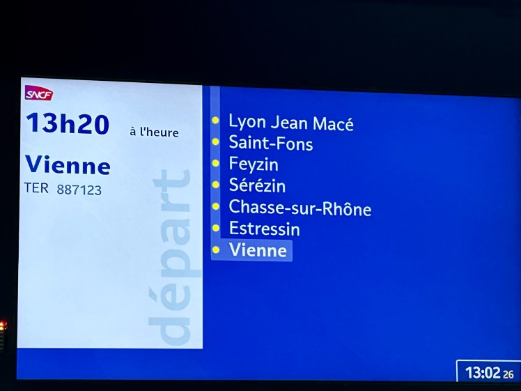A visita a Lyon, onde estivemos alguns anos atrás, tinha o propósito de conhecermos duas novas cidades: Vienne e a Cidadela Medieval de Pérouges, as duas a menos de uma hora de viagem de trem regional. A passagem ida e volta para Vienne custou 29,80 Euros para o casal.
