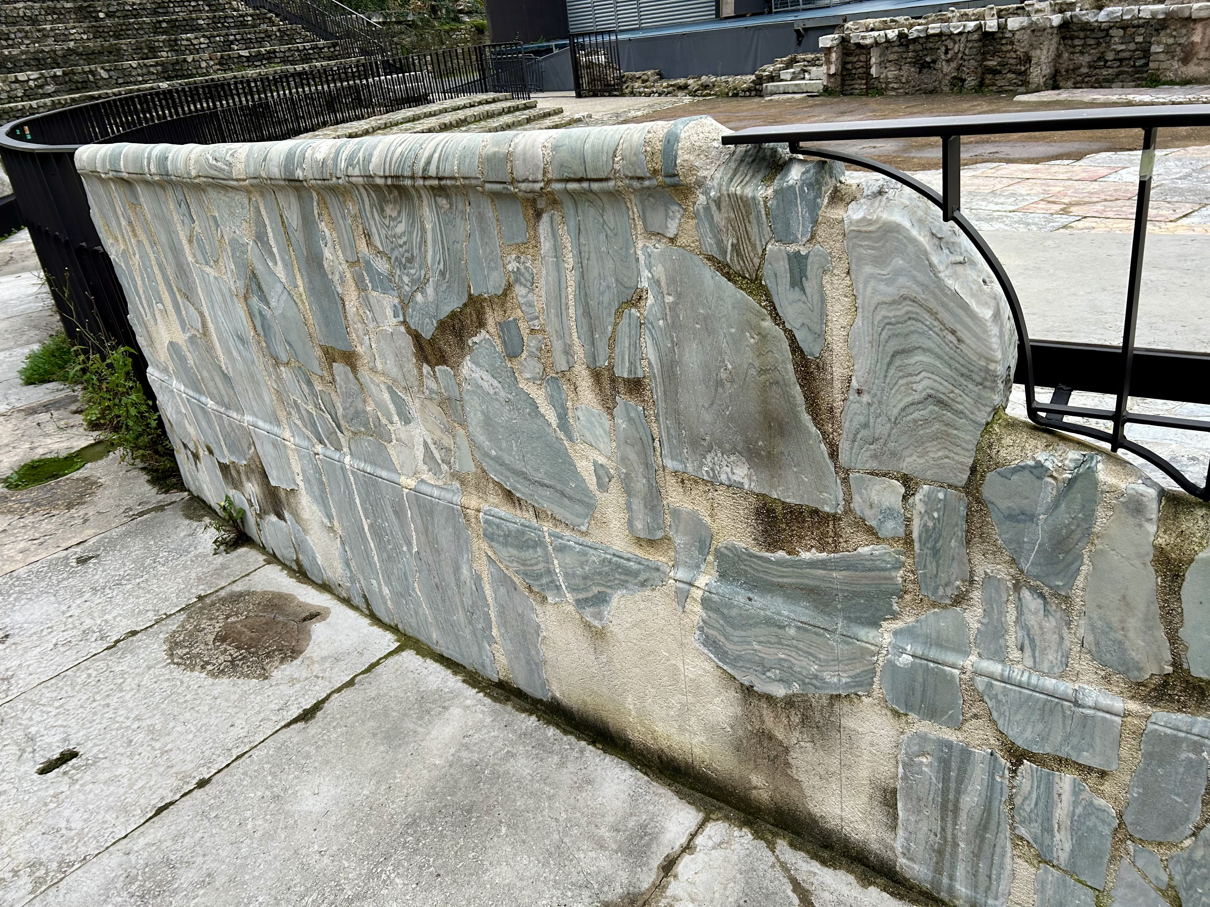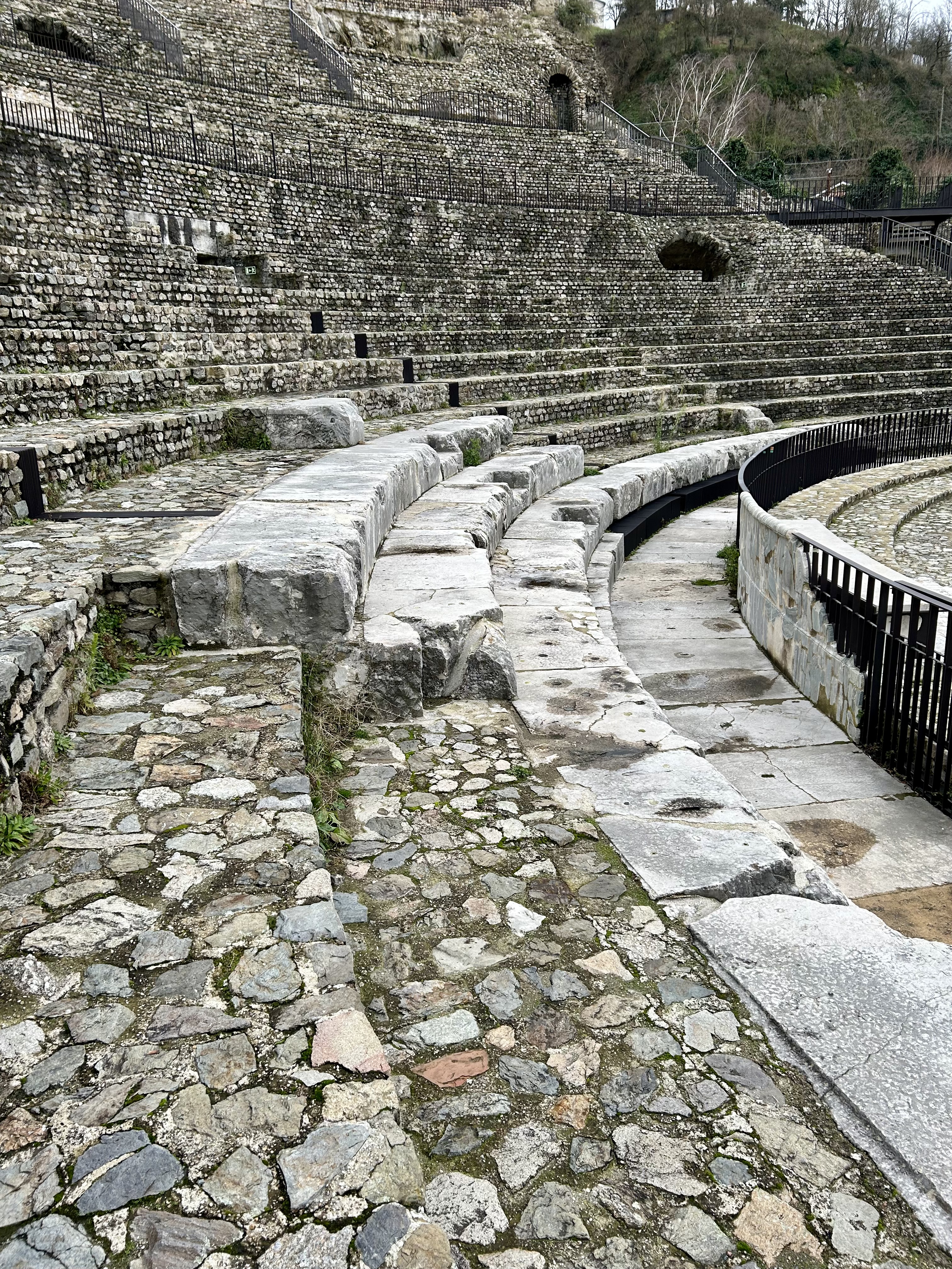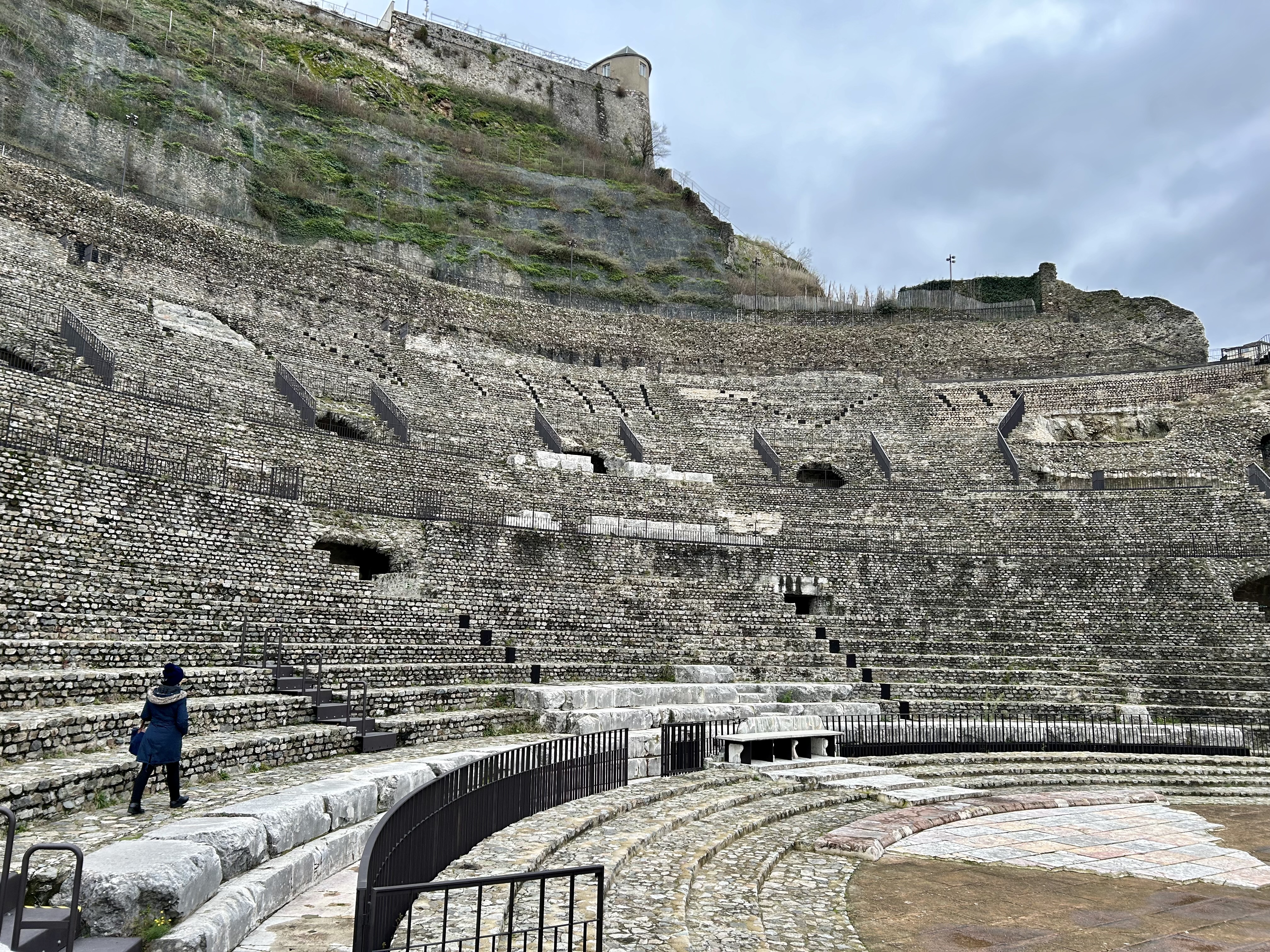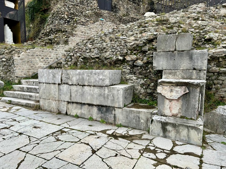Com jeito de abandonado, quase perdemos a oportunidade de entrar no Teatro Romano, porque não havia nenhuma placa informando sobre o funcionamento. A Rossani, curiosa, foi caminhando à frente e descobriu uma entrada, onde uma solitária recepcionista informou que um domingo por mês a entrada era gratuita e foi justamente o dia da nossa visita. Tivemos o privilégio de visitar o teatro milenar gratuitamente, sem pressa imaginando todos os espetáculos que aconteceram ali, bem diferentes do atuais.