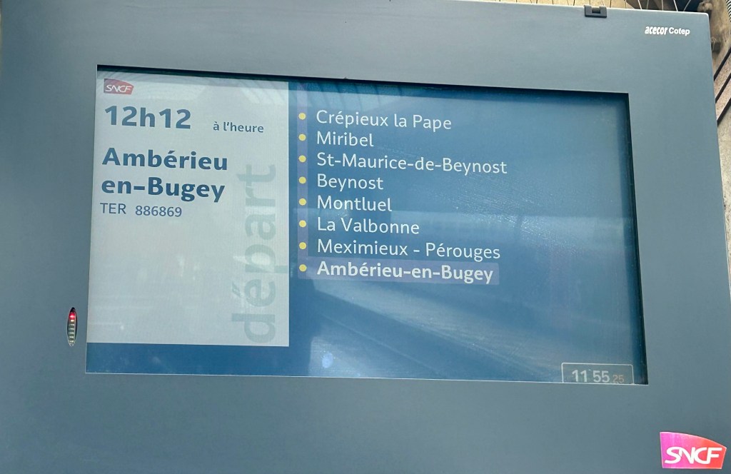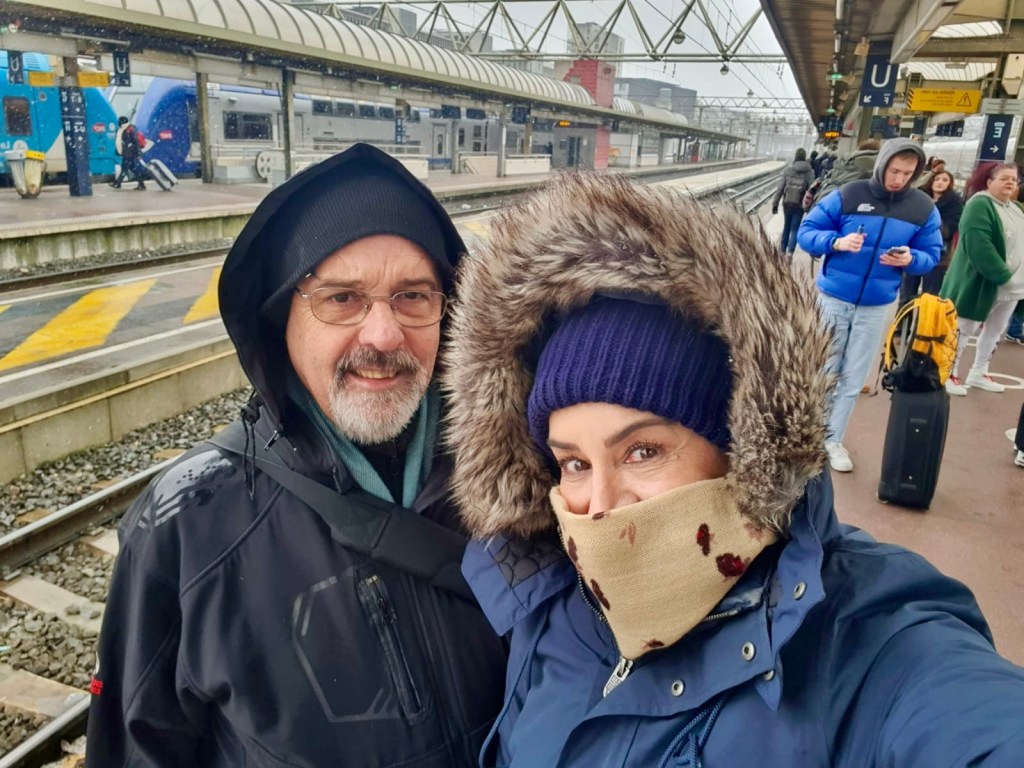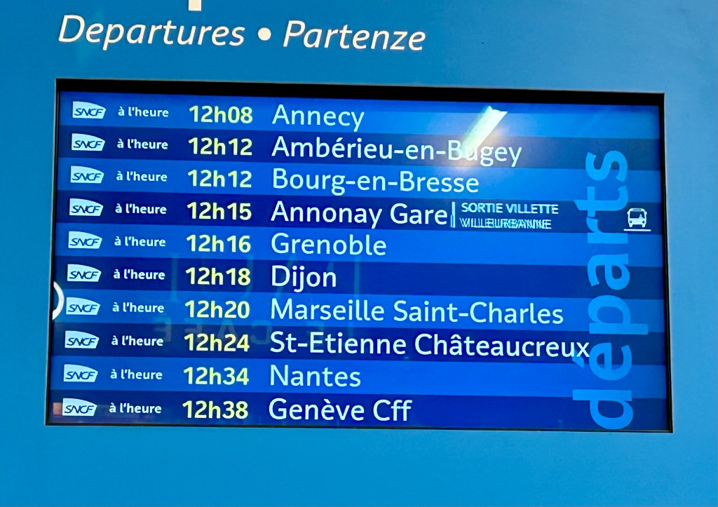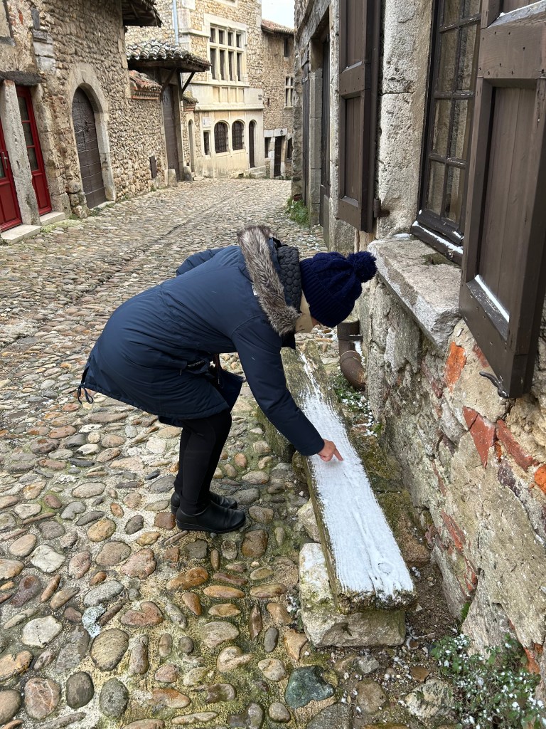 Frio e neve no amanhecer em Lyon, dia 8 de janeiro de 2024, e mesmo o vento fraco fazia a sensação térmica se tornar ainda mais gelada. Os termômetros marcavam 0º grau e a sensação térmica deveria estar em torno de -4°, mas nem por isso deixamos de seguir a nossa programação. Fomos de metrô da Estação Lyon Perrache, bem próxima do nosso hotel, até a Estação de Lyon-Part-Dieu, de onde partiria nosso trem para nova aventura de conhecer mais uma cidadela medieval francesa totalmente preservada e ainda habitada.