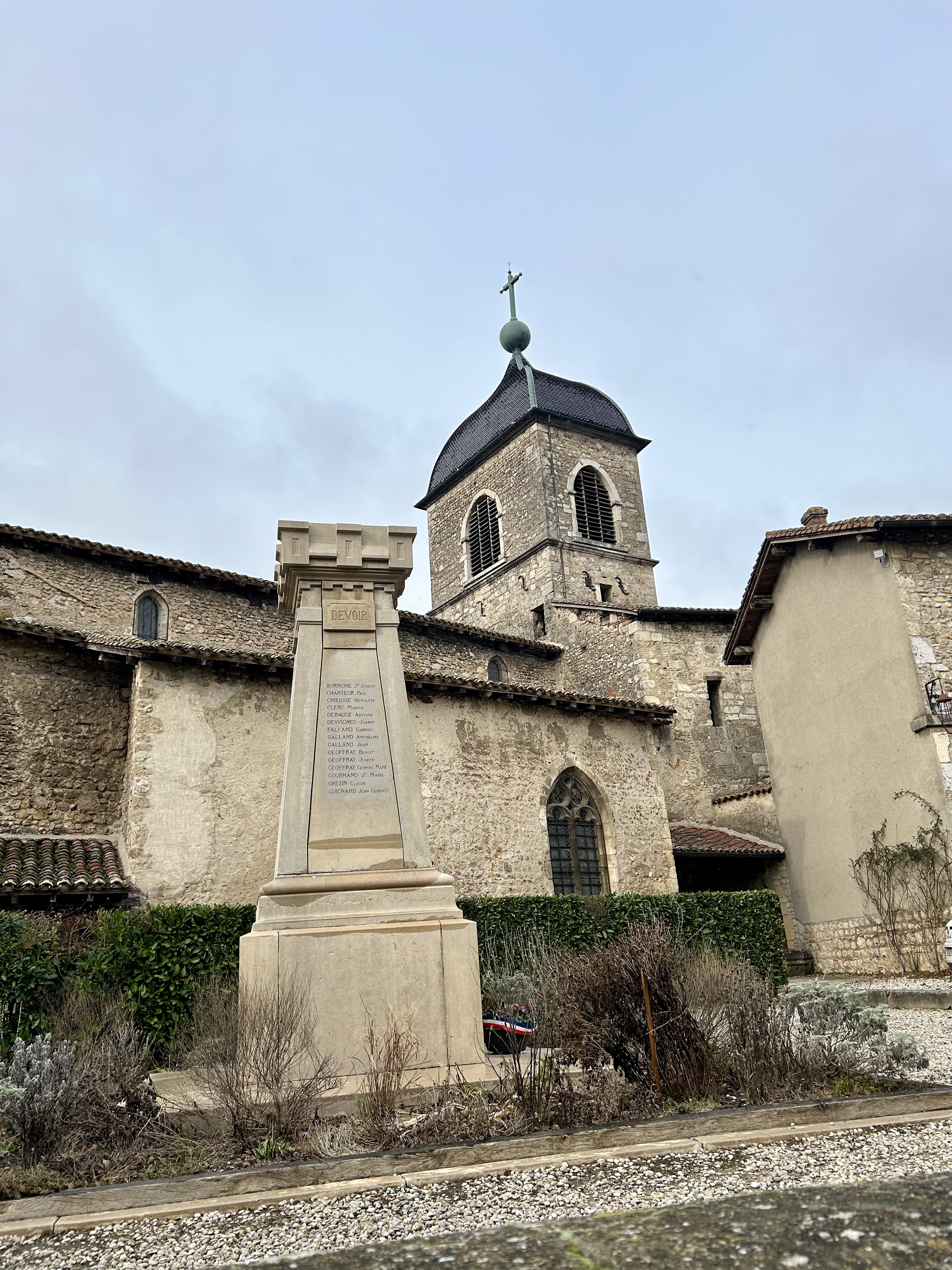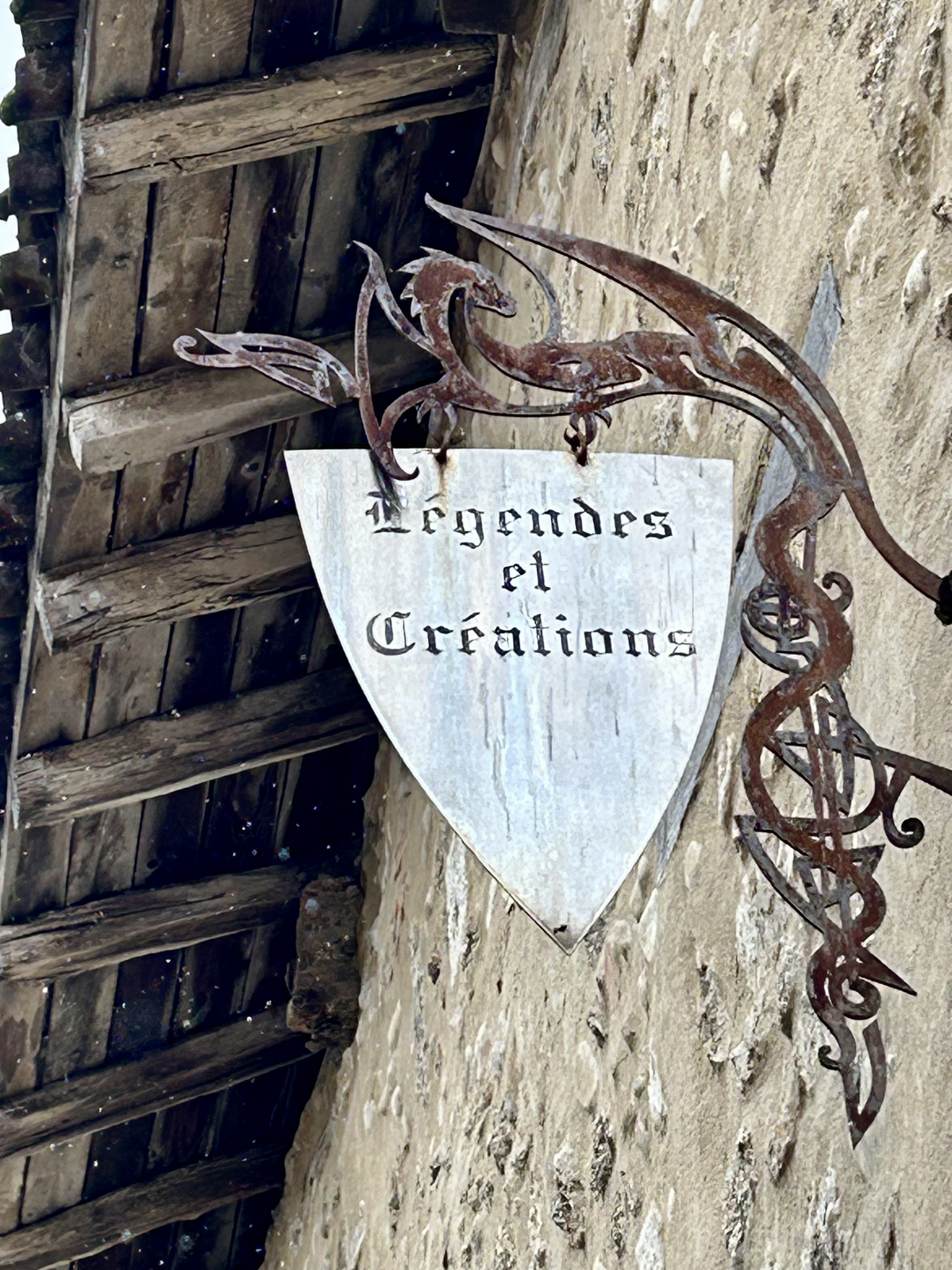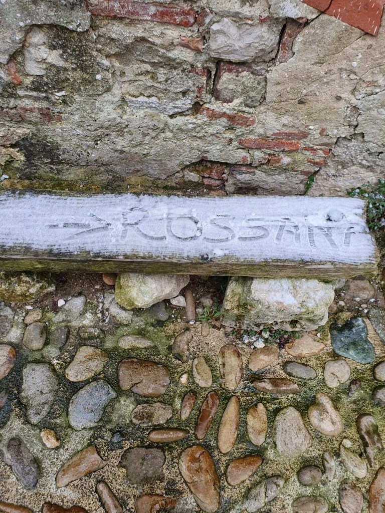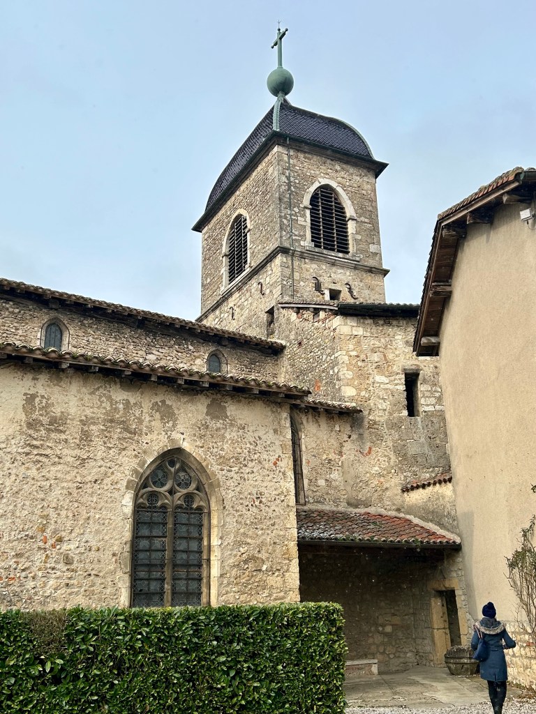 Nós não demoramos duas horas para percorrer a cidadela, porque estava realmente muito frio e praticamente tudo fechado, inclusive a Igreja de Santa Maria Madalena, que já serviu de fortaleza local. Havia um pouco de neve acumulada num tronco de madeira, o que permitiu que a Rossani Thomas deixasse o seu nome brevemente eternizado até o degelo ou compactado sobre novas camadas de neve, o que provavelmente aconteceu já que nos dias seguintes a formação de neve foi intensa em praticamente toda a França.