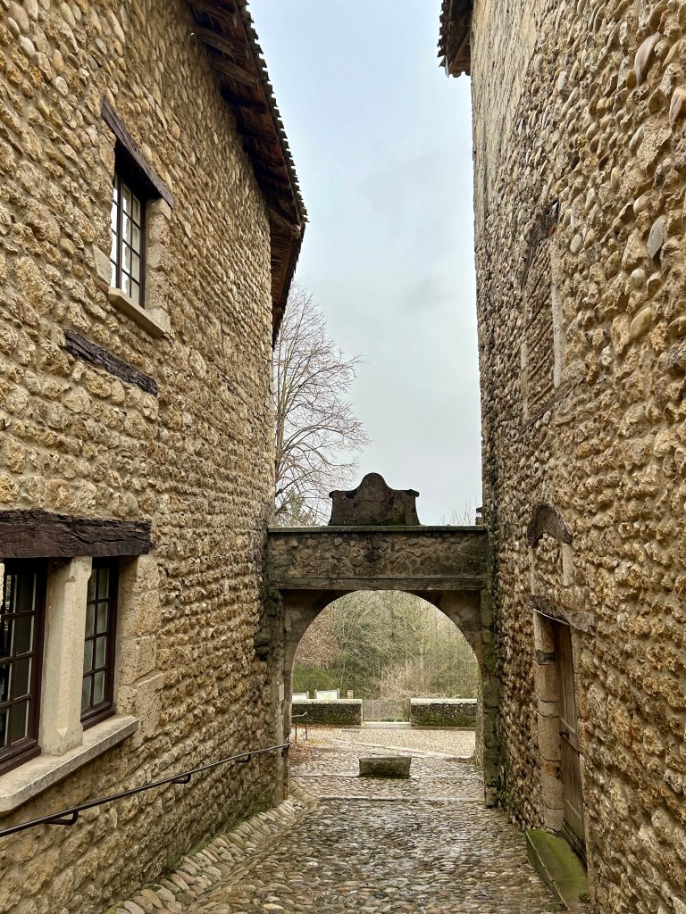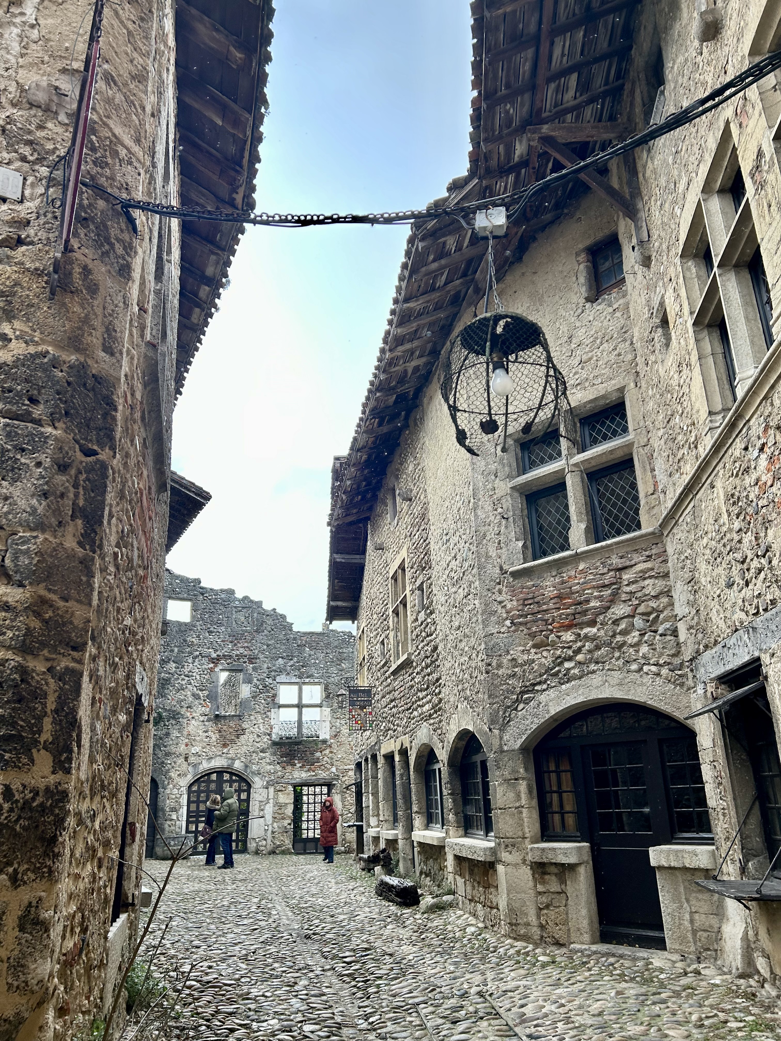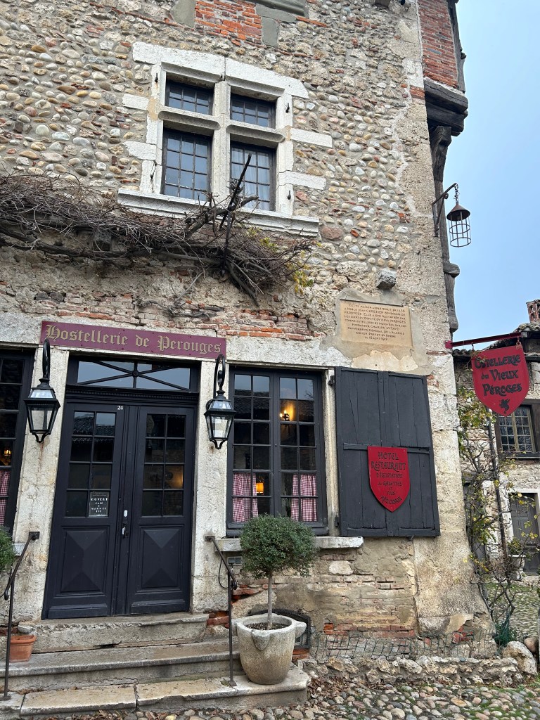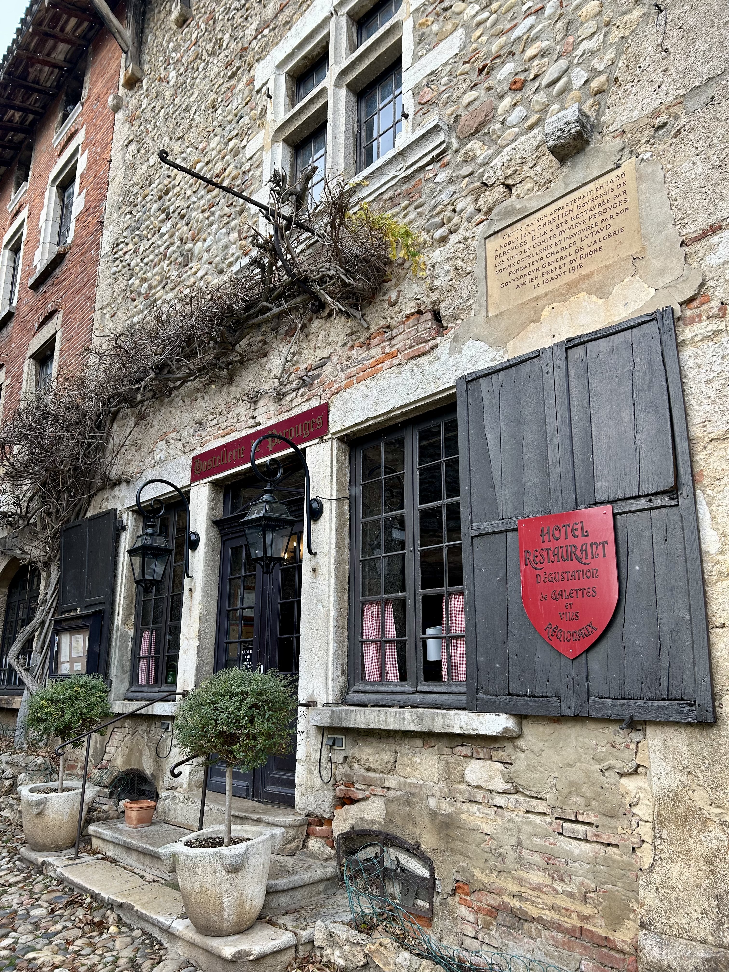 Em Pérouges, é surpreendente a preservação da maioria das casas. A sensação é de que o visitante está fazendo parte de um filme e isso é verdadeiro, porque uma das versões de Os Três Mosqueteiros teve a cidadela como cenário. A aldeia tem 19 quilômetros quadrados e o ponto central é a Place du Tilleul, a principal praça de Pérouges e bem próxima da Hostellerie du Vieux Pérouges, o único restaurante aberto no dia da nossa visita.