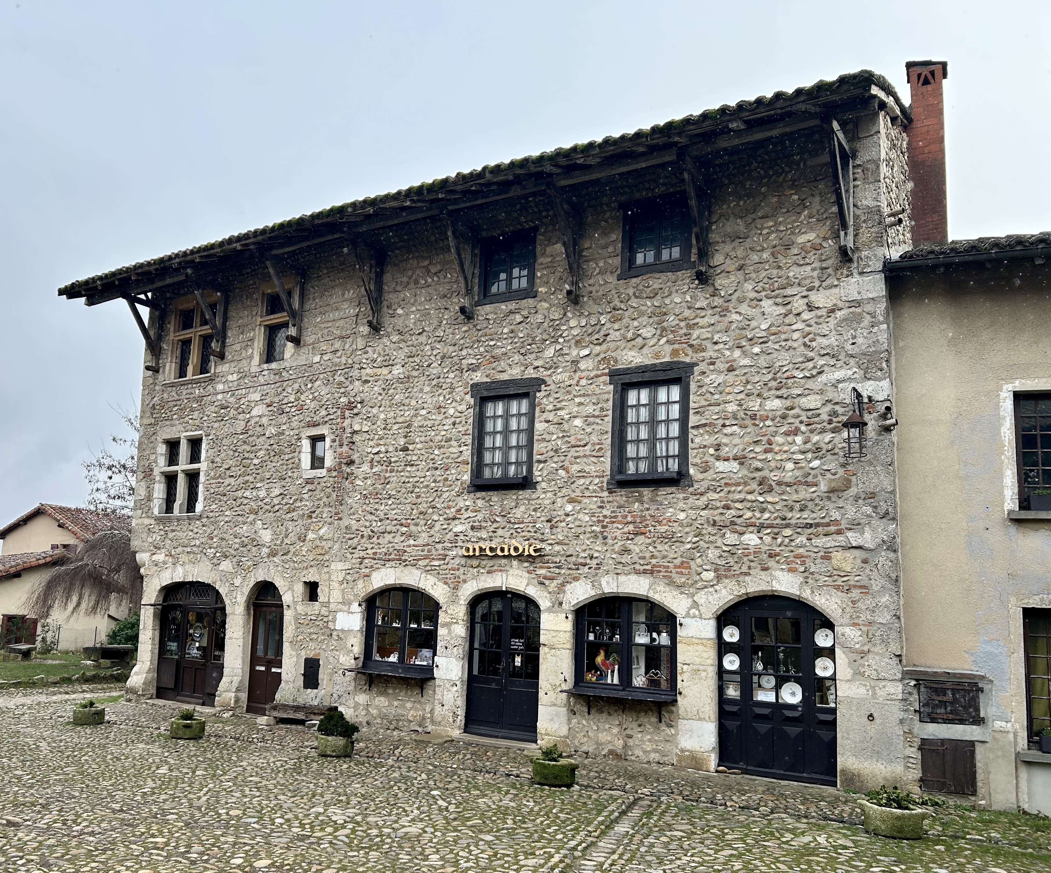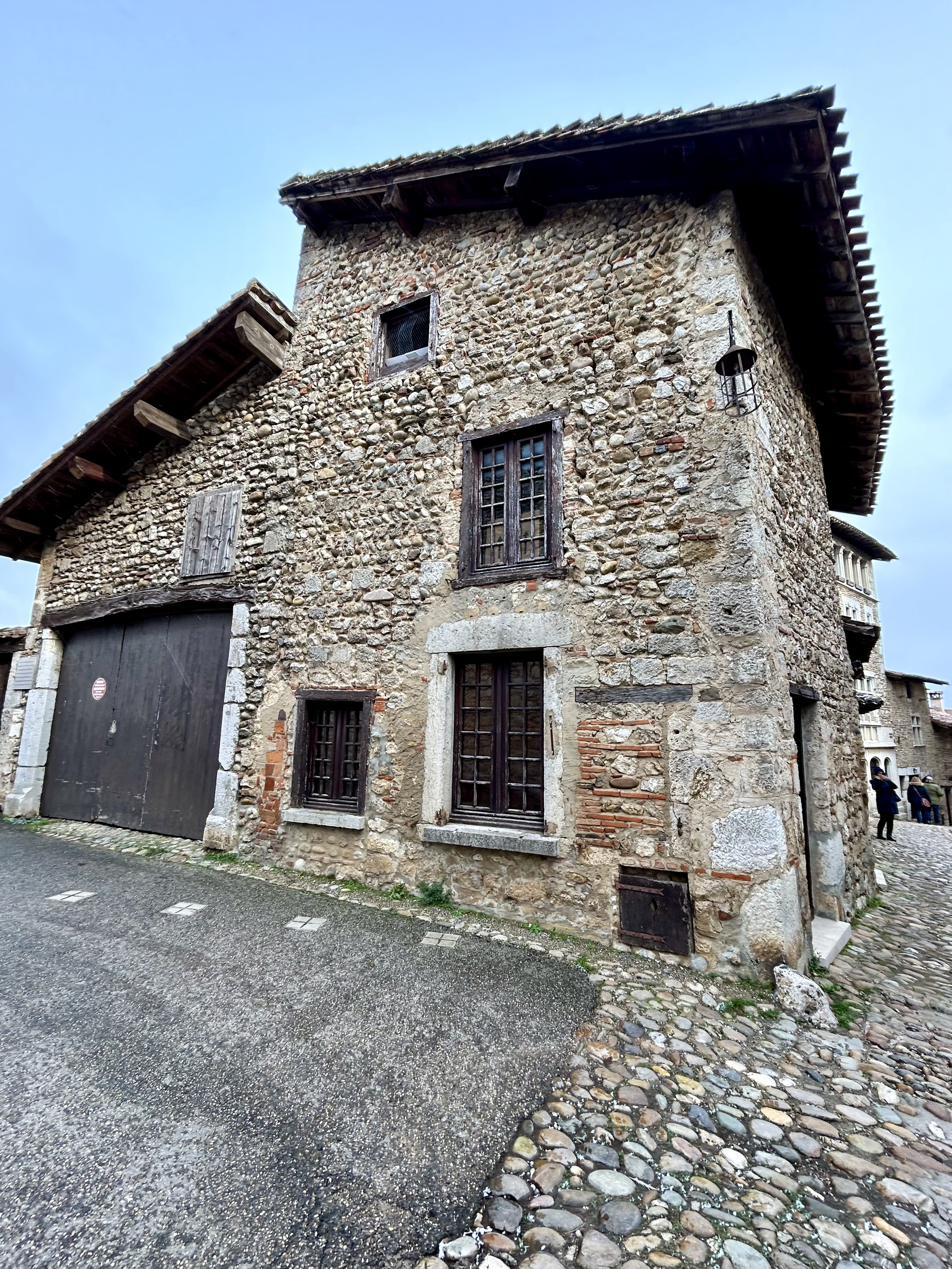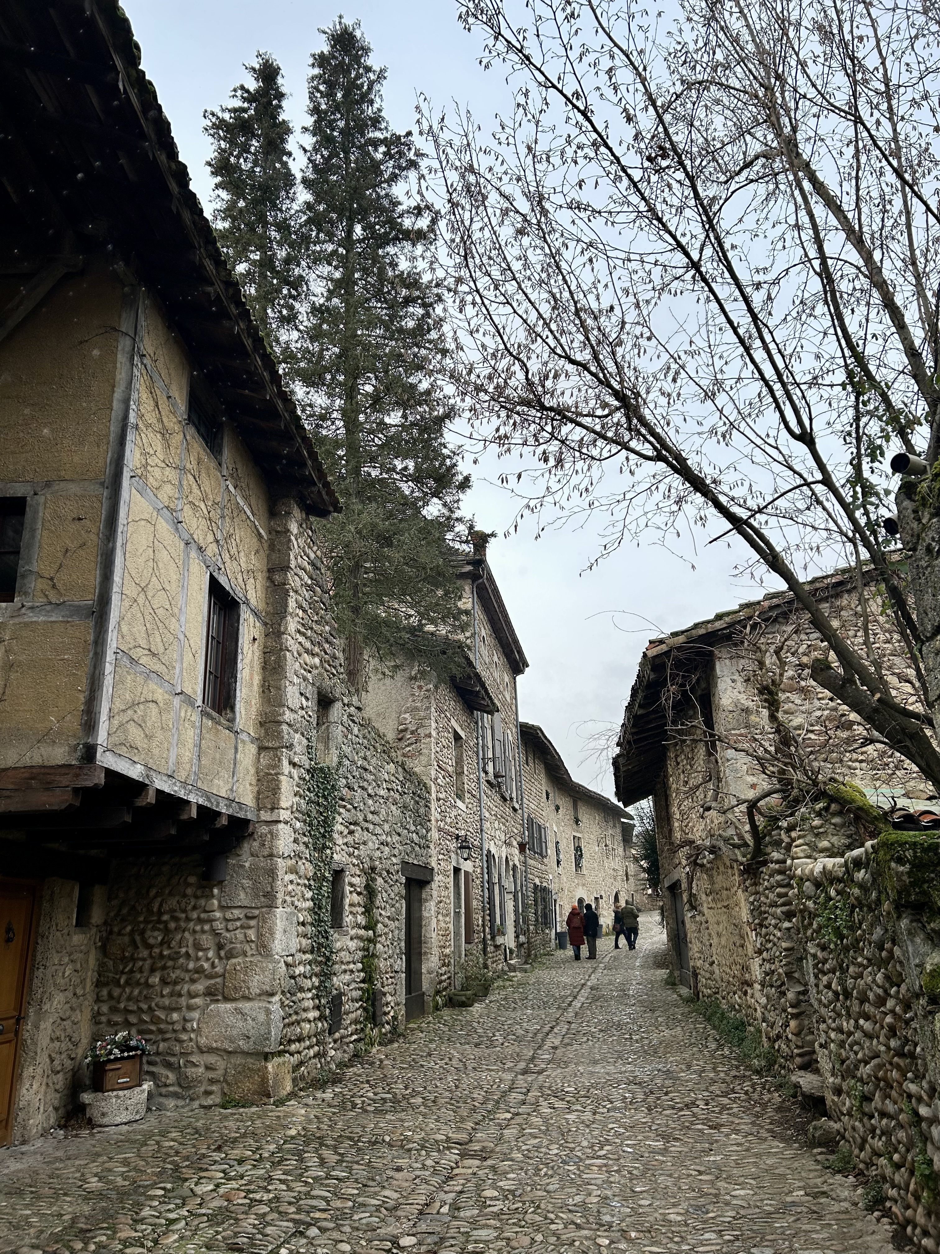 Em Pérouges, é surpreendente a preservação da maioria das casas. A sensação é de que o visitante está fazendo parte de um filme e isso é verdadeiro, porque uma das versões de Os Três Mosqueteiros teve a cidadela como cenário. A aldeia tem 19 quilômetros quadrados e o ponto central é a Place du Tilleul, a principal praça de Pérouges e bem próxima da Hostellerie du Vieux Pérouges, o único restaurante aberto no dia da nossa visita.