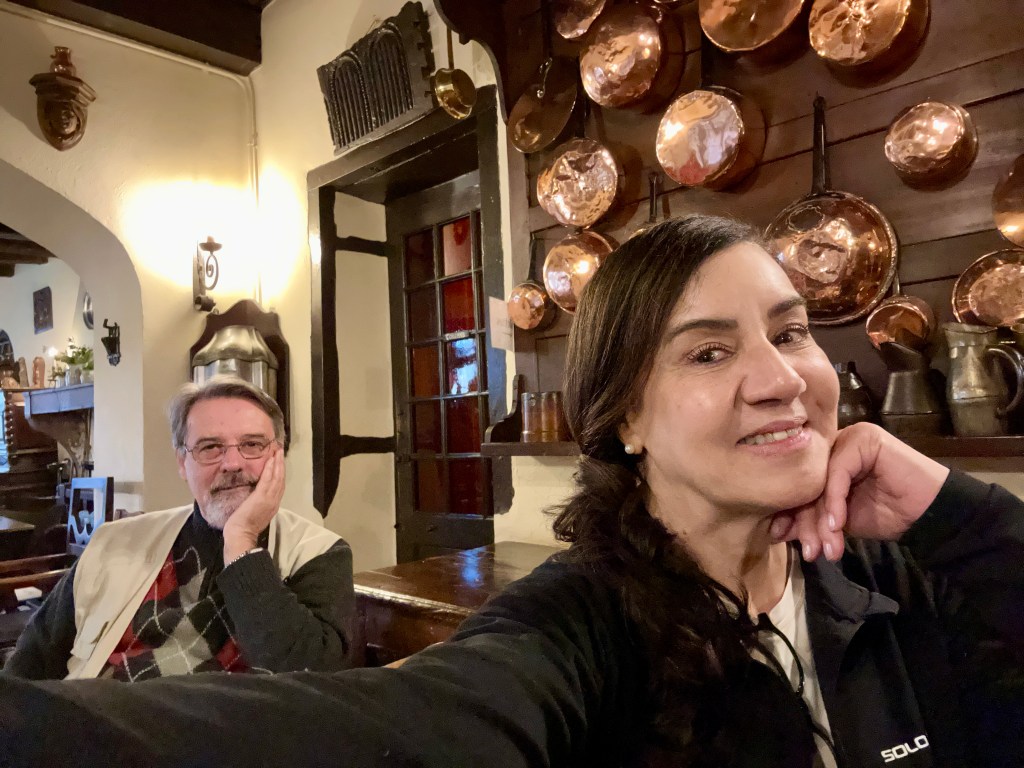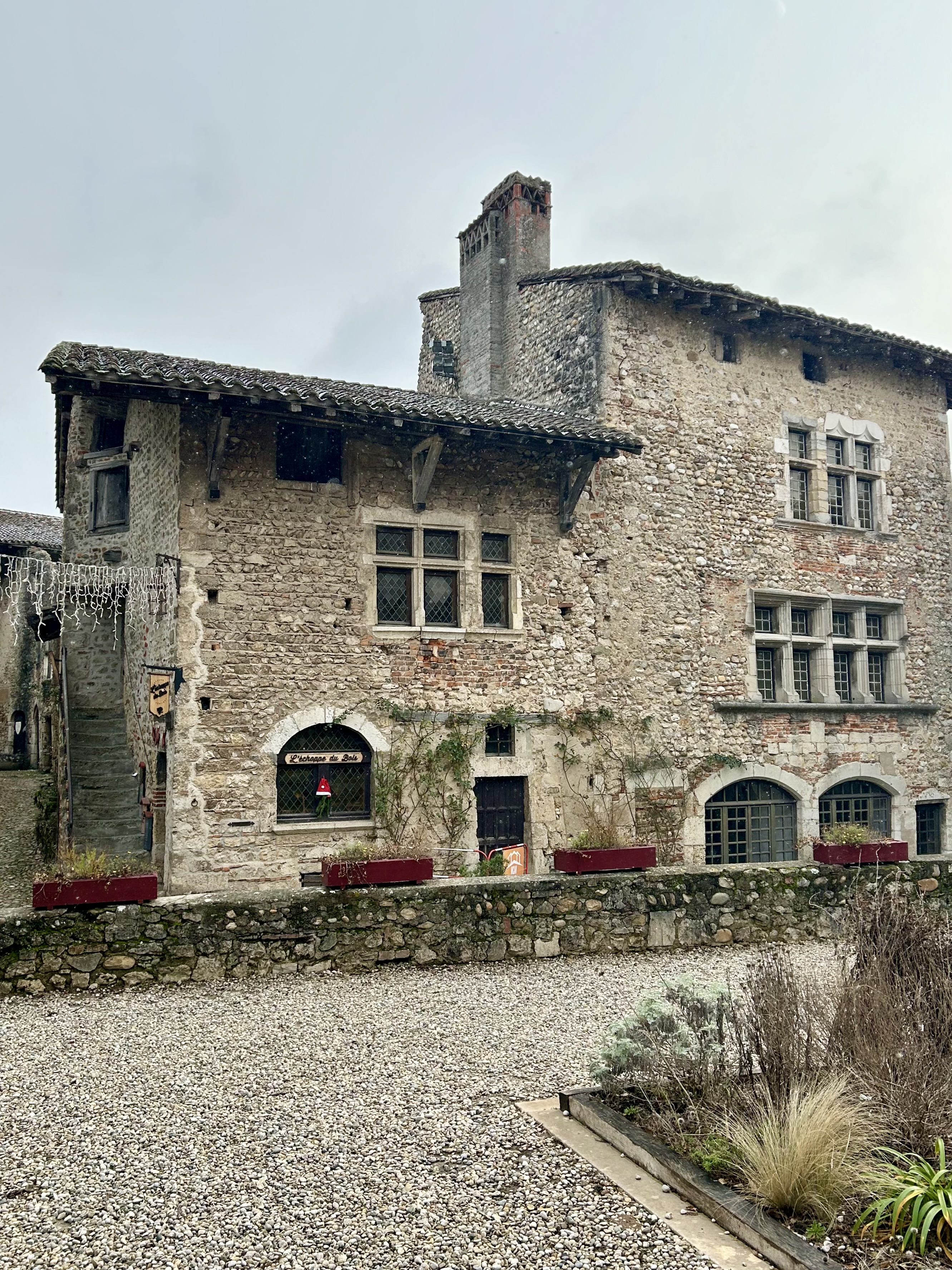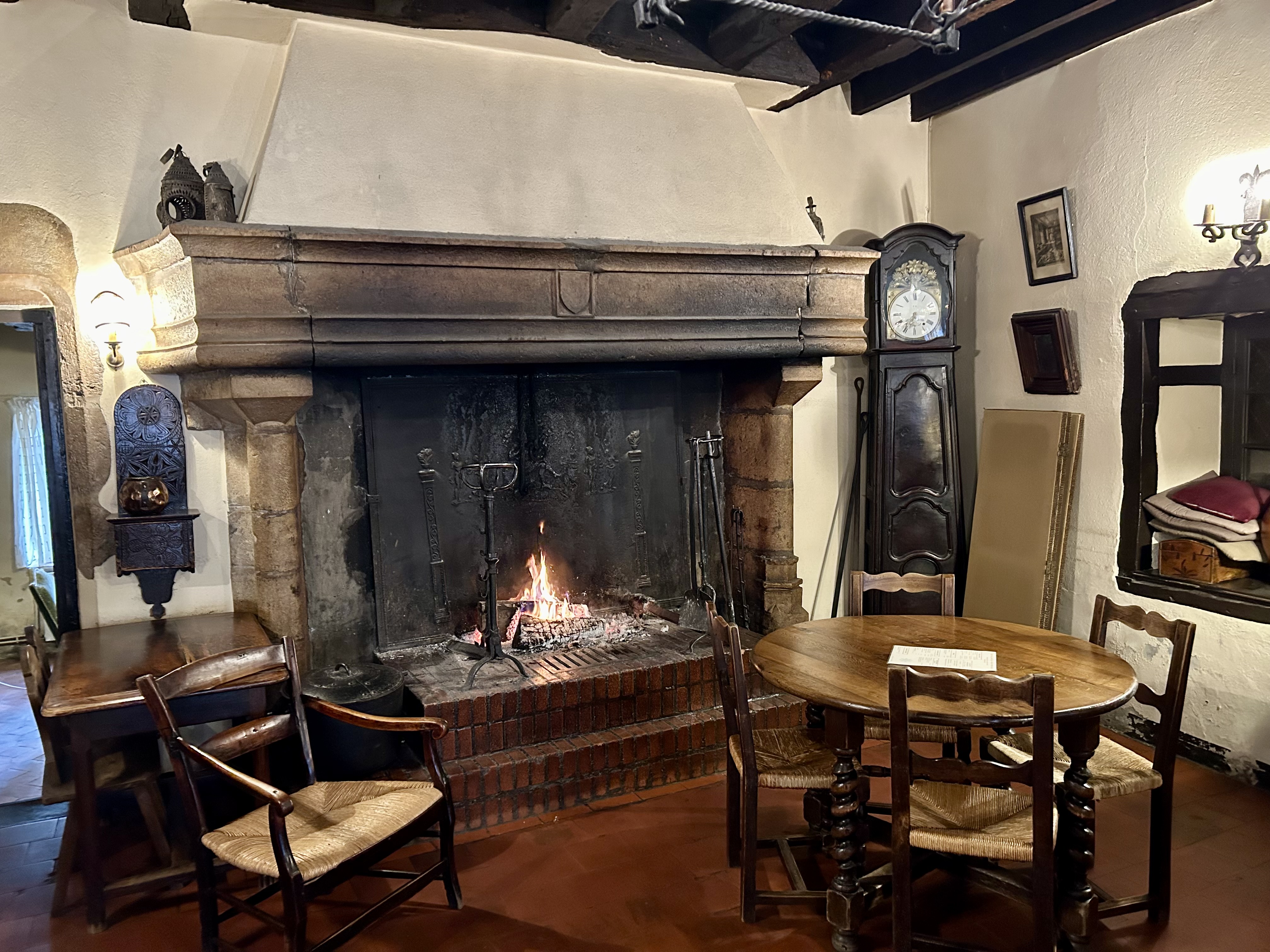 Depois de percorrer praticamente duas vezes todas as ruelas, resolvemos aproveitar para fugir por um tempo do frio e saborear a tradicional Gallete de Pérouges, na Hostellerie. Uma grande lareira aquecia o ambiente, onde além do restaurante também funciona um hotel. Na primavera e no verão, com certeza, deve ser difícil caminhar pelas estreitas ruas e conseguir um lugar nos restaurantes, mas quando fomos estava muito tranquilo. Além de nós, havia apenas mais dois casais no local.