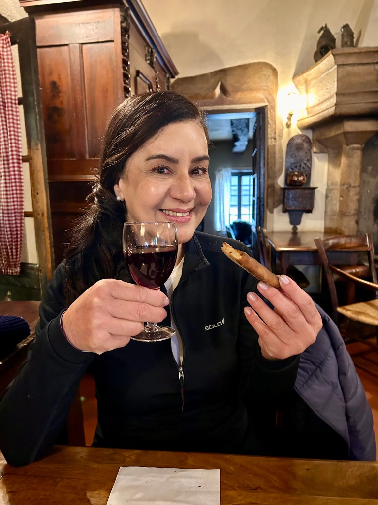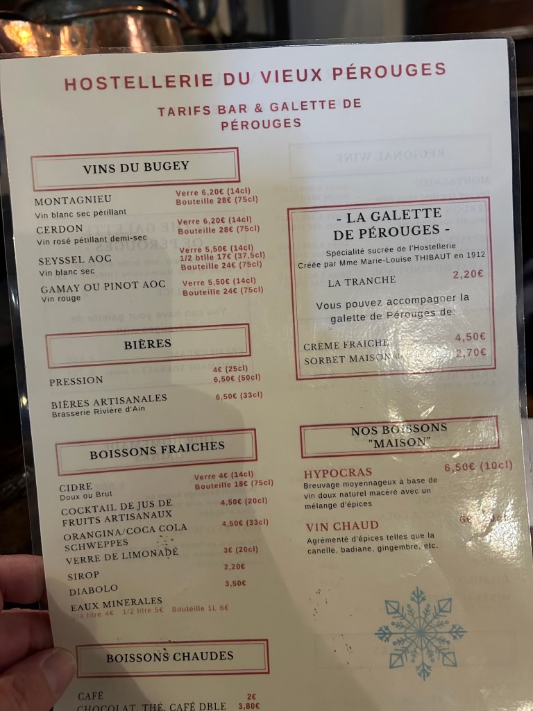 A Rossani, que adora doces, aprovou mais esse clássico da culinária francesa. Cinco Galletes e quatro taças de vinho saíram por 41,00 Euros, mas como sempre lembra a minha parceira de viagens, valeu a pena, porque, afinal, quando iremos visitar novamente Pérouges. Foi o que ela me disse, e estava certa, quando gastamos 74,00 Euros por duas taças de vinho e duas omeletes, especialidade do célebre restaurante La Mère Poulard, em Mont-Saint-Michel, em 2018. Essa história também está no blog Bloco de Viagens dos Thomas.