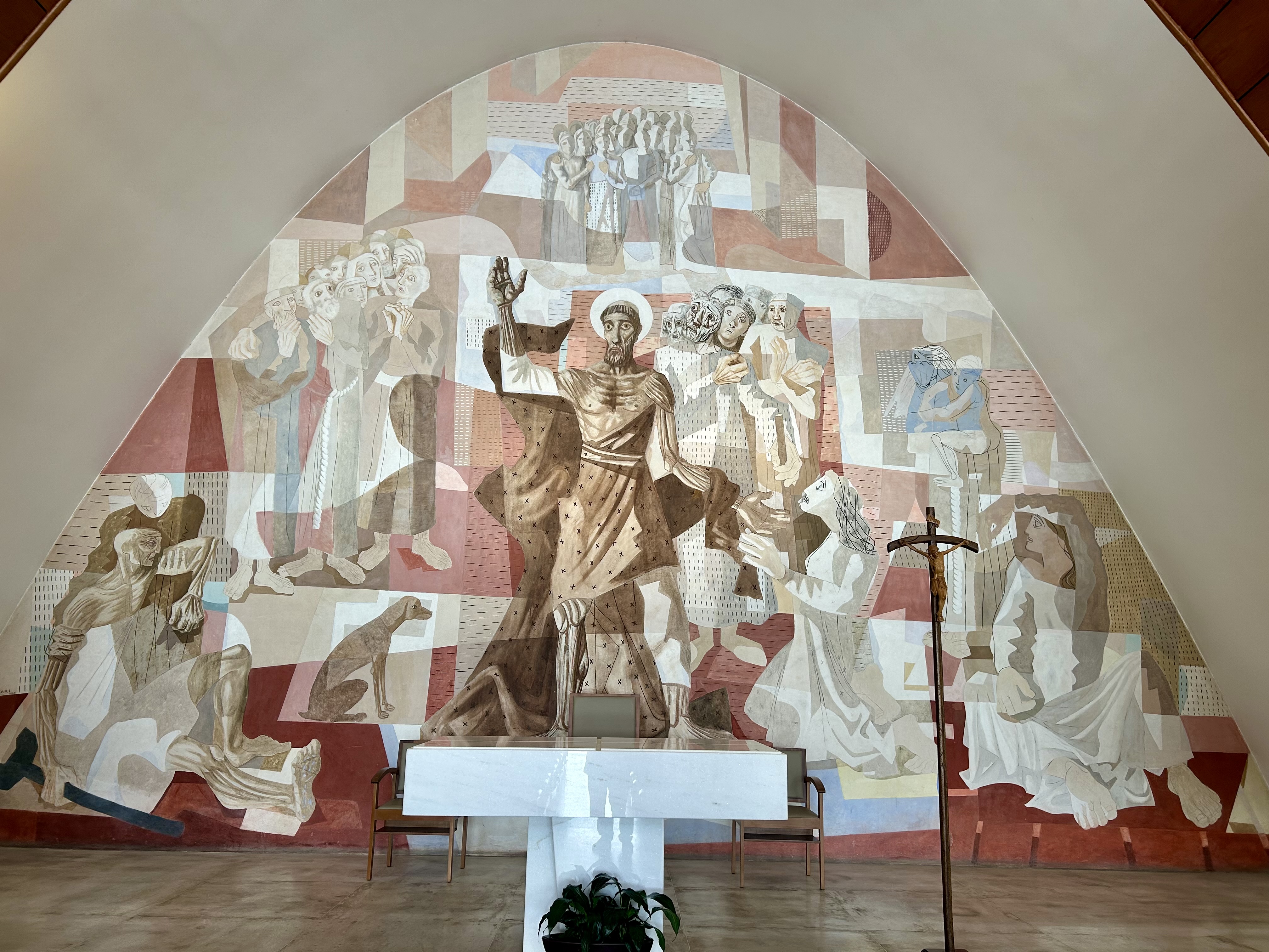 Além da estrutura totalmente inovadora da igreja, chama a atenção o altar com mural de Cândido Portinari, de 1945. Nas laterais, pinturas de Portinari sobre telas de madeira apresentam a Via Crucis de Jesus Cristo. Na parte externa, o artista criou o painel em azulejos pintados em azul e branco retratando cenas da vida de São Francisco.