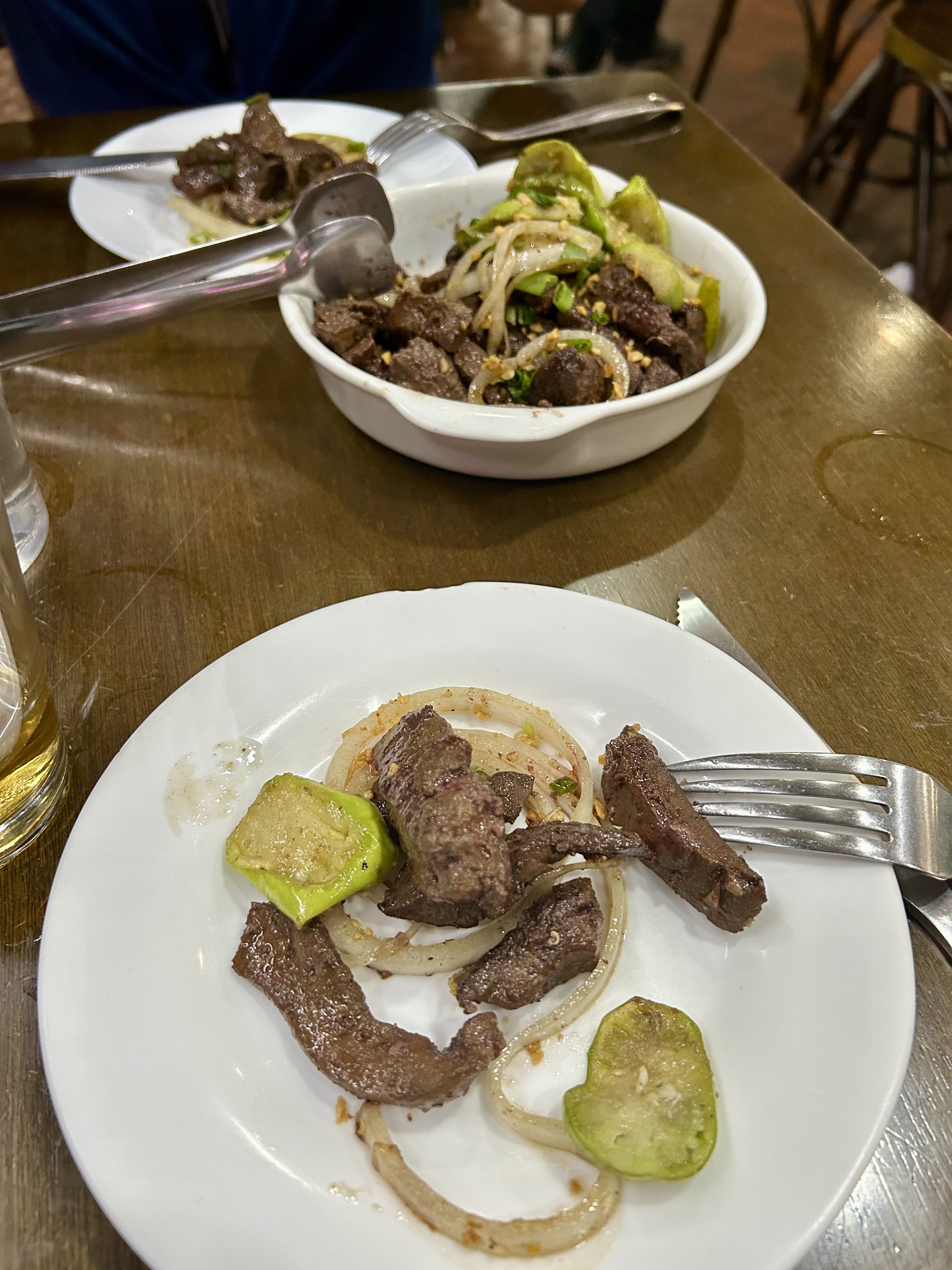 Nosso terceiro prato foi o famoso fígado bovino acebolado com jiló, um ícone local que nem sempre agrada os paladares, mas que caiu no nosso gosto e bolso, por R$ 42.