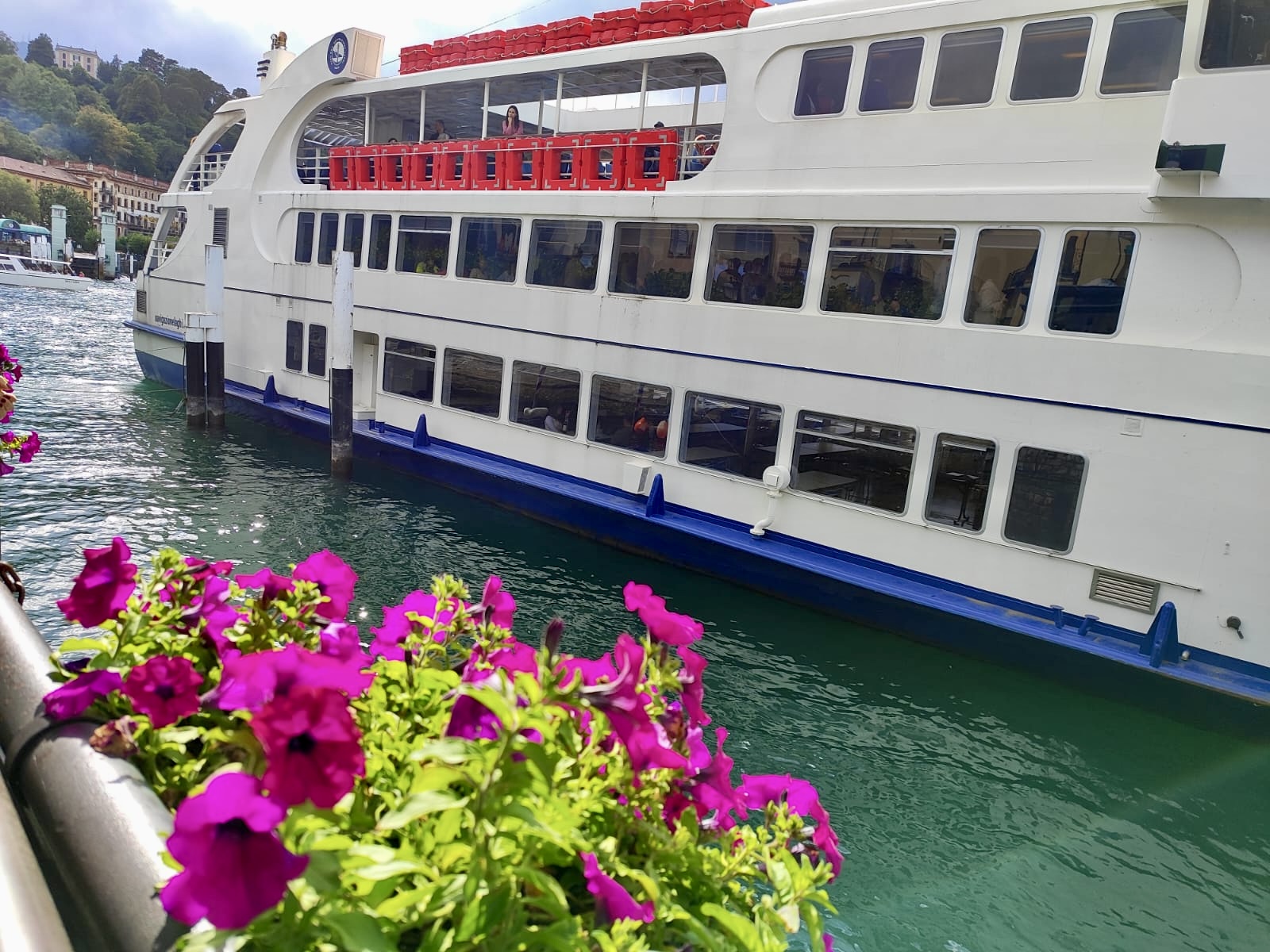 A viagem no barco, de dois andares, demorou quase duas horas. Havia a opção de um barco mais rápido (e mais caro), mas aproveitamos a viagem para apreciar as belas casas, palácios e jardins localizados às margens do lago, além da natureza exuberante da região.