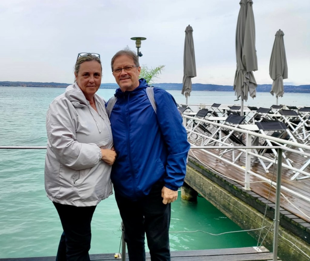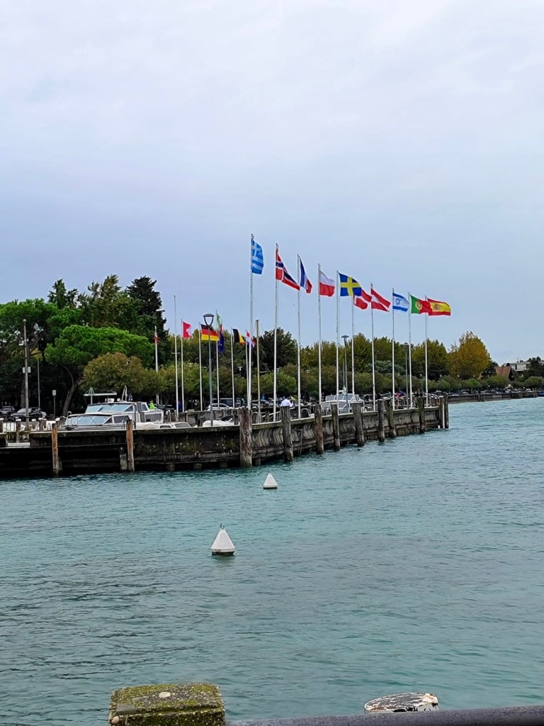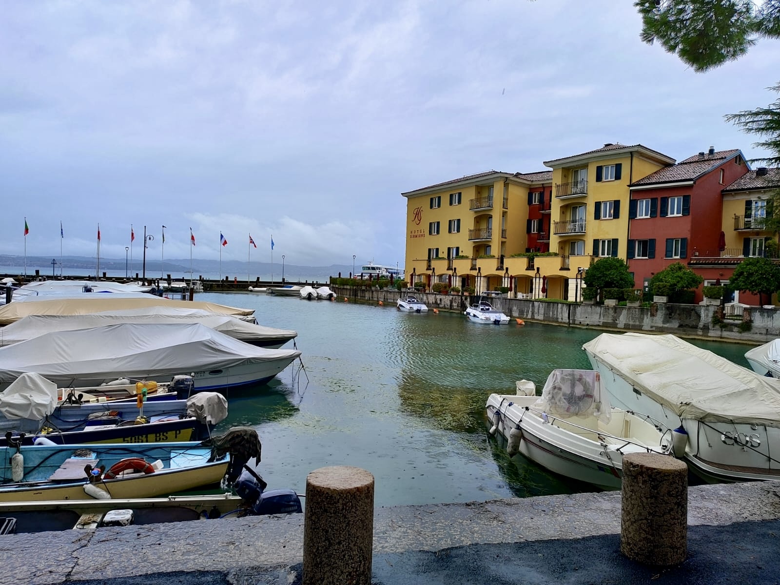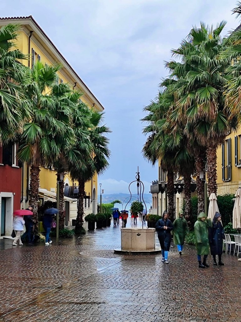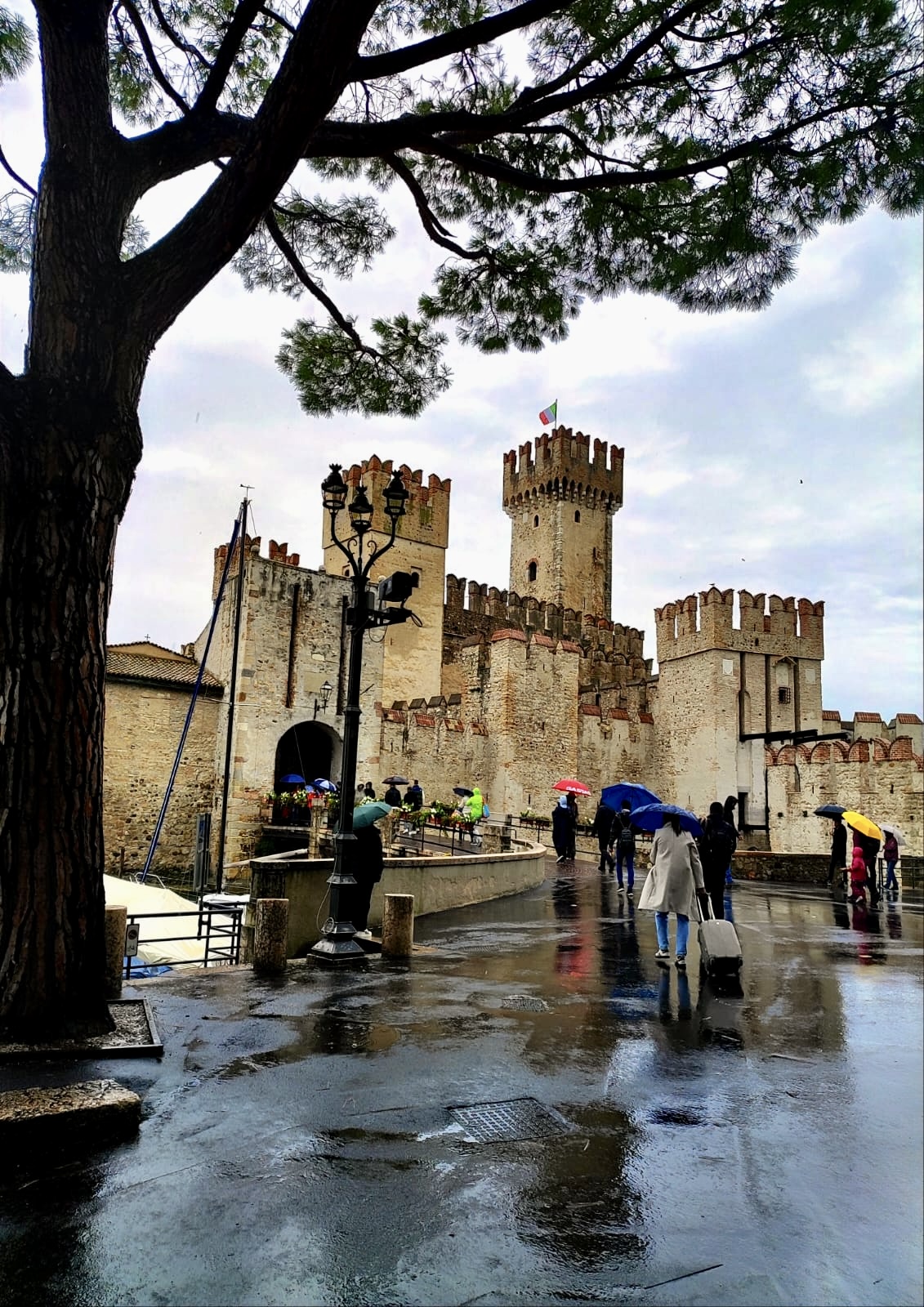 Nós estávamos hospedados em Verona. Pegamos um trem na Estação Puorta Nova e descemos na pequena e charmosa cidade de Peschiera del Garda. A viagem é rápida, não mais do que 15 minutos. Da estação já dava para ver a beleza do lago. Não contávamos, porém, com a mudança repentina do tempo na madrugada anterior ao passeio. Quando chegamos lá chovia cântaros!