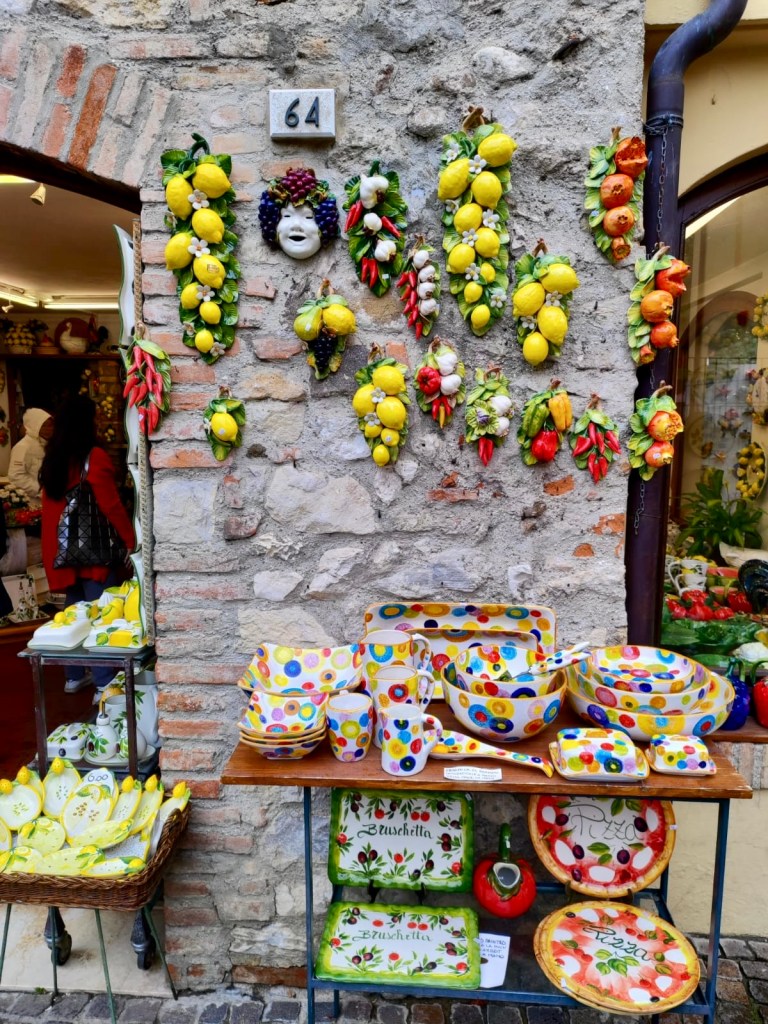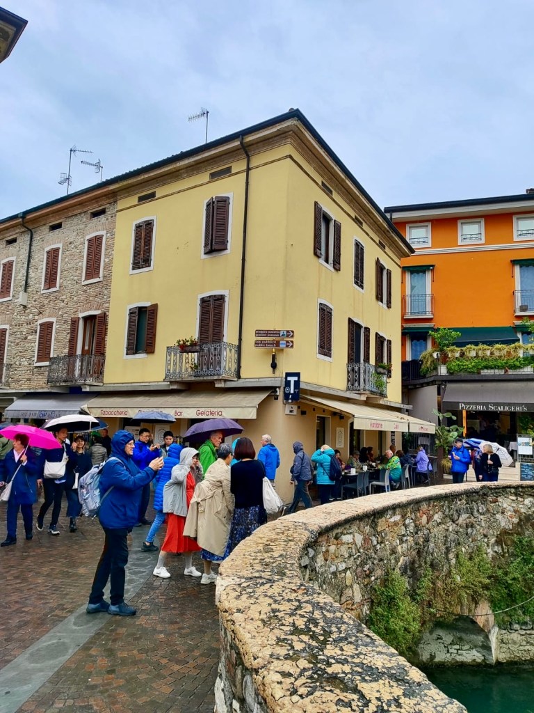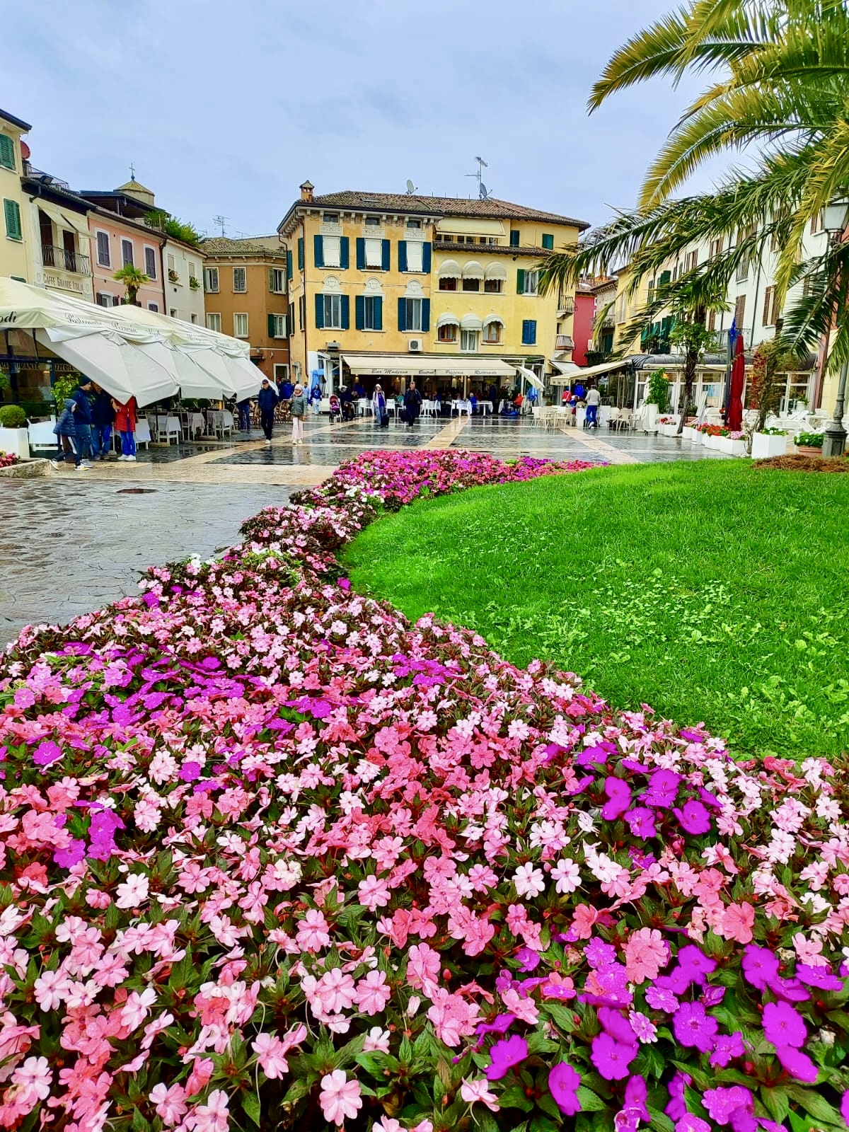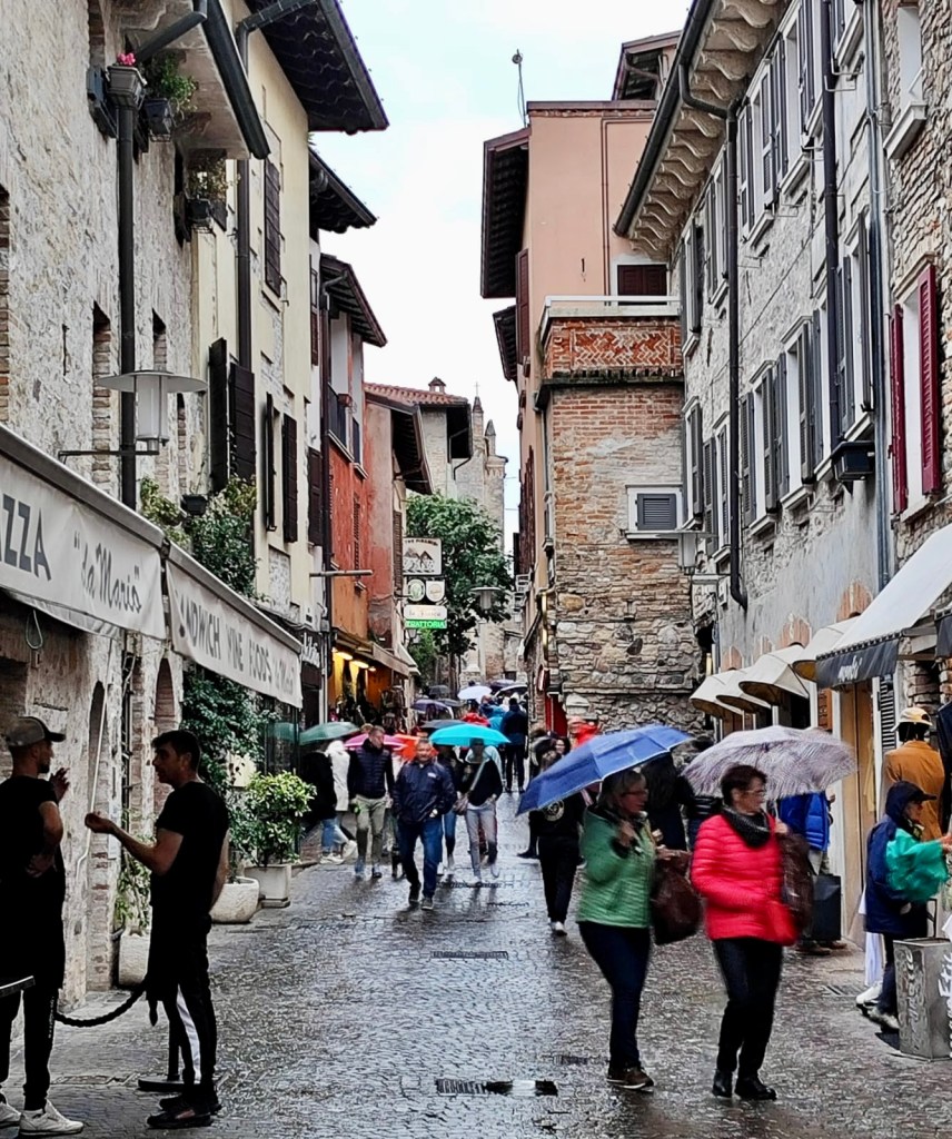 Sirmione é a “queridinha” do Lago di Garda, e um dos principais destinos de quem visita a região. Como a chuva havia amenizado, colocamos nossas capas plásticas compradas por três euros cada em uma lojinha de esquina e fomos, enfim, bater pernas nas ruas estreitas do Centro Histórico, com seus cafés, gelaterias, restaurantes típicos e lojas, tudo enfeitado com canteiros de flores multicoloridas. Uma lindeza!