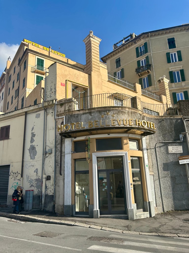 Descemos na Estação Príncipe, no Centro Histórico. Pelo Booking, escolhemos o hotel Bellevue, que fica ao lado da estação, a cerca de 70 metros de distância. Um hotel muito mais simples do que constava no site e que não faz jus a 1 estrela sequer, embora esteja ranqueado com 3, com uma péssima rede de wifi e um café tão pobre em opções que o custo de 6 Euros por pessoa não compensa.