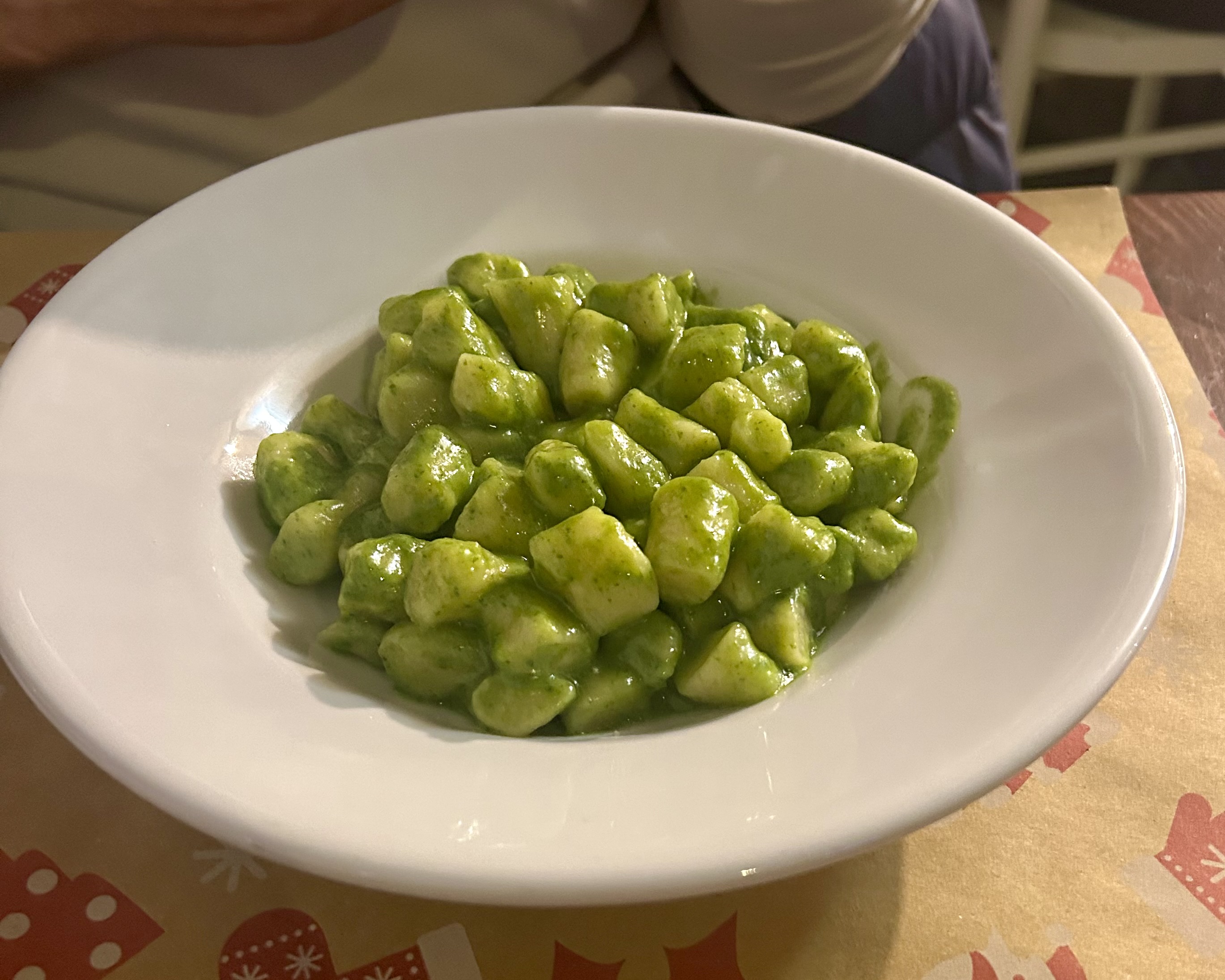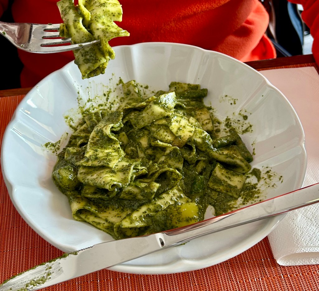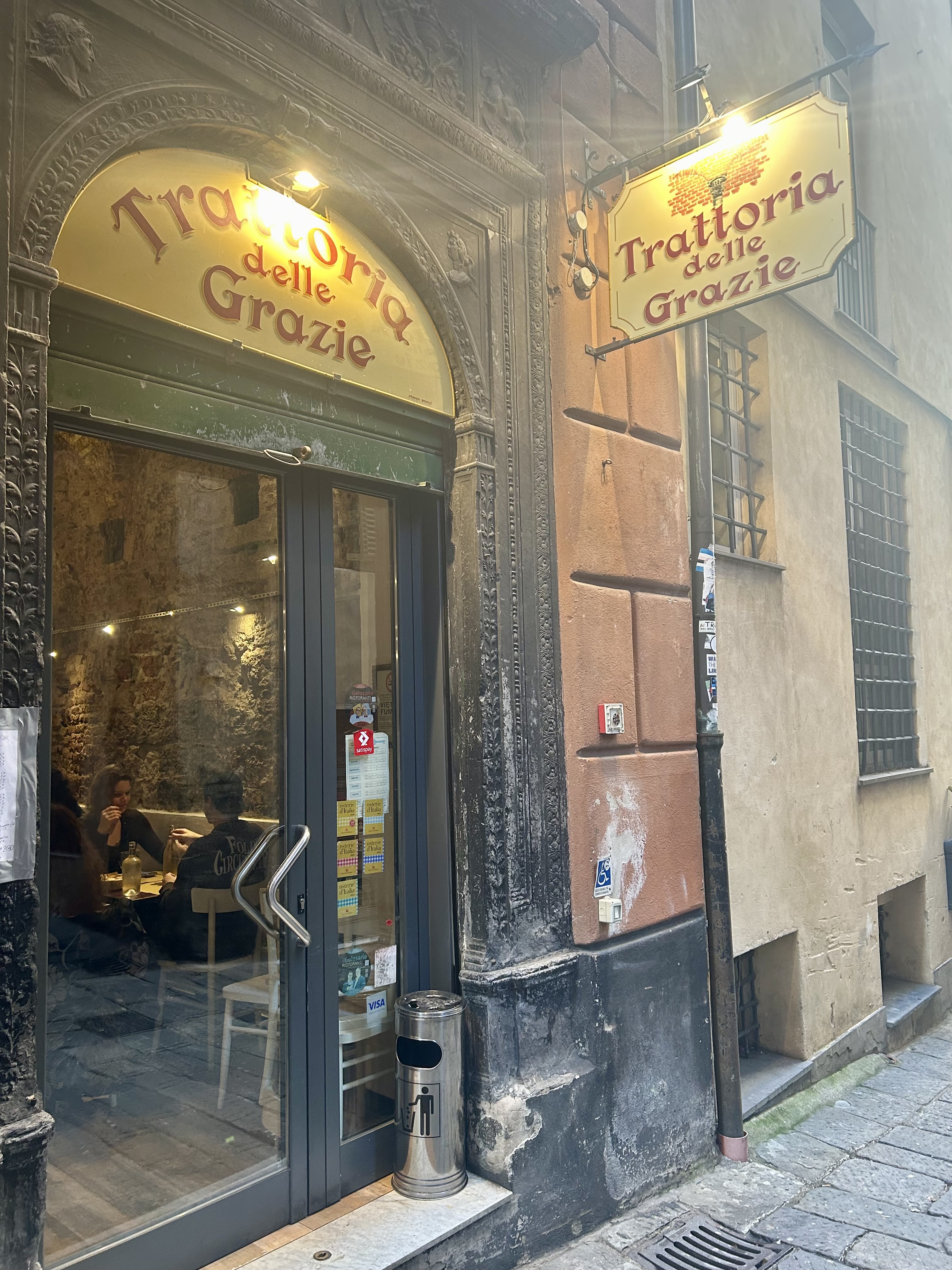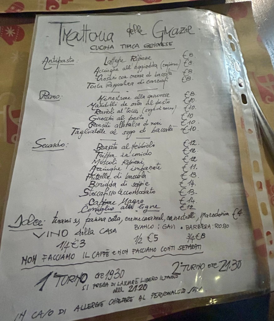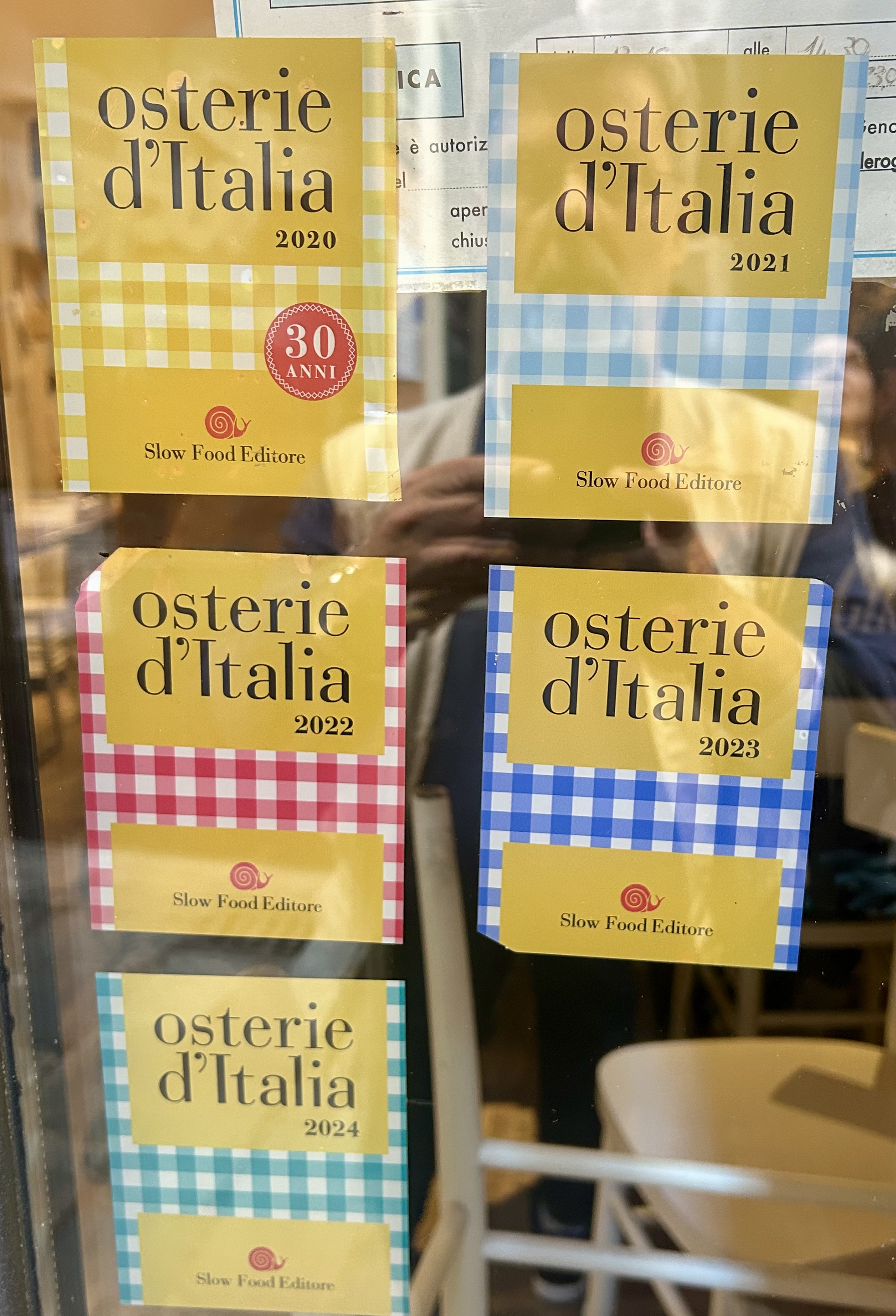 Sempre buscamos pontos diferentes nas nossas viagens. Na nossa caminhada pelas vielas do Centro Histórico chamou a atenção uma aglomeração de pessoas na frente de um pequeno restaurante, a Trattoria della Grazie, na Via S. Giorgio quase em frente a Vico di S. Cosimo. Fomos conferir e verificamos que a casa tinha cinco selos de reconhecimento da Slow Food Editore. Foi o sinal para a nossa parada de almoço no dia 10/01/25 – um ravioli à bolonhesa e um nhoque ao pesto, acompanhados de pão e vinho da casa ao custo de 30 Euros. O cardápio de opções é bem simples e está escrito à mão.