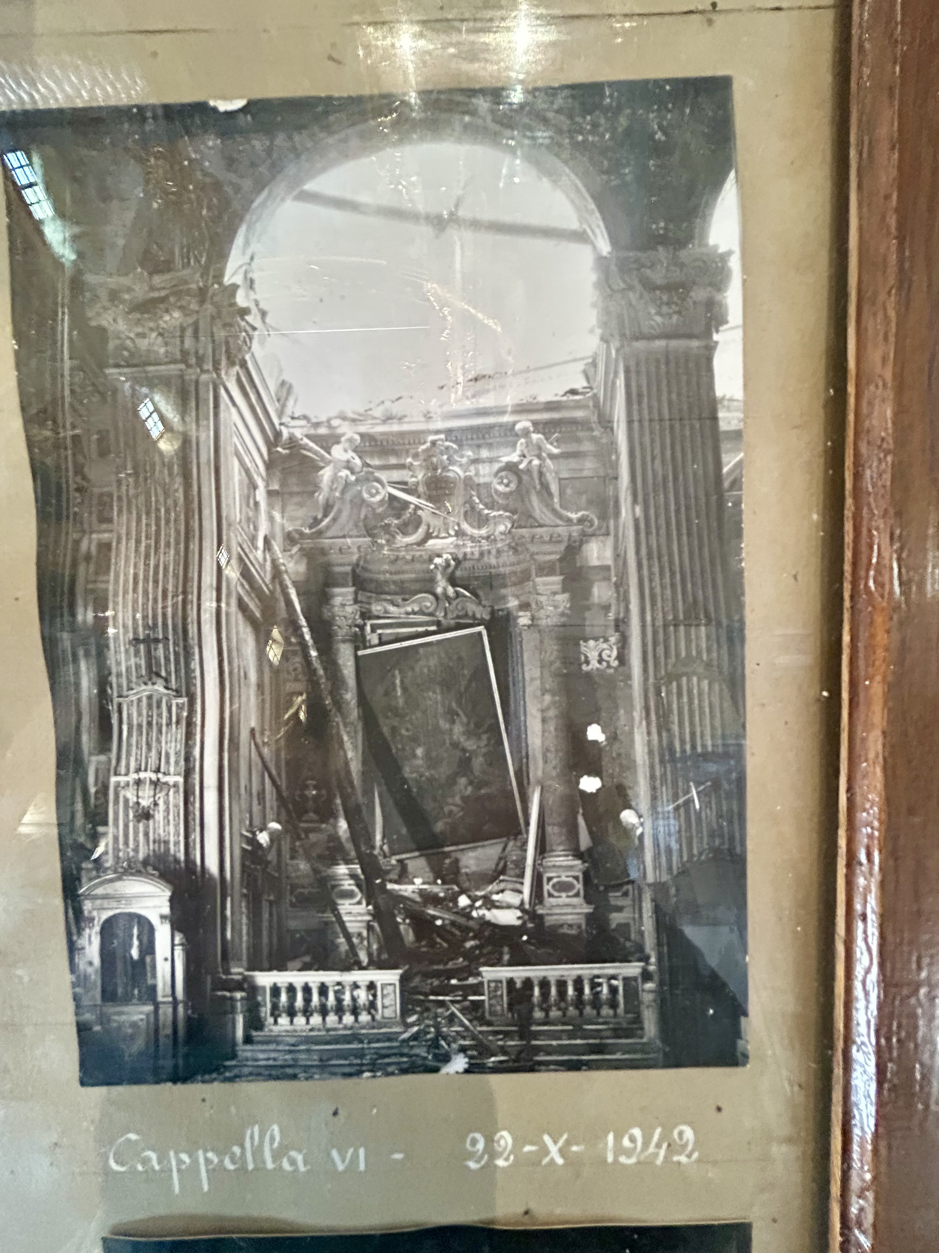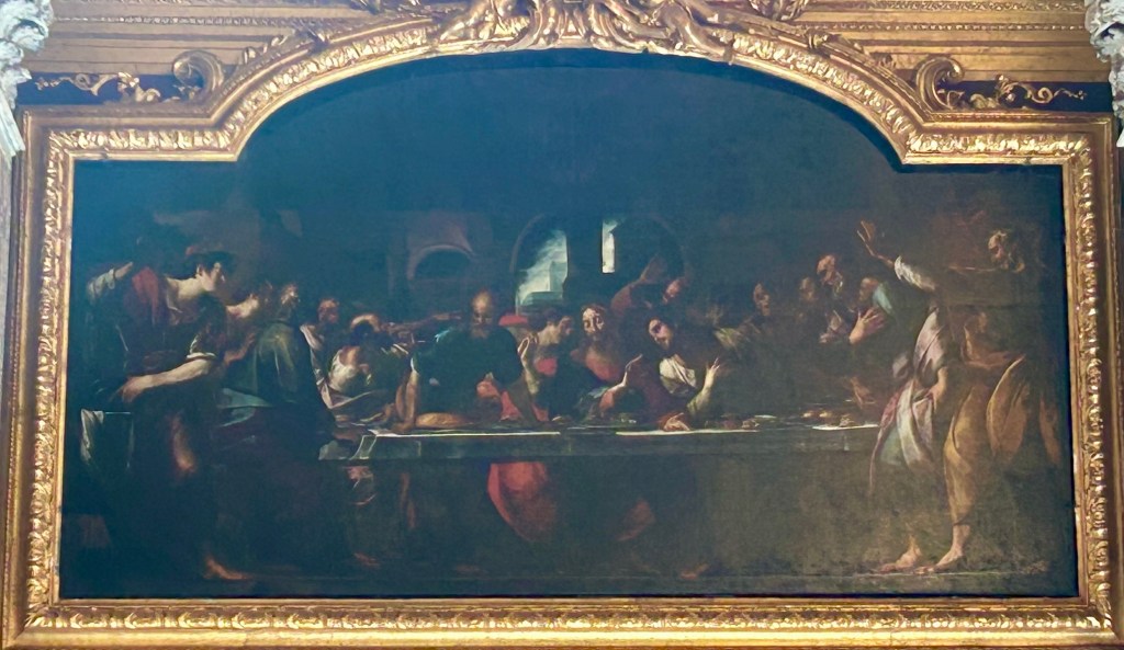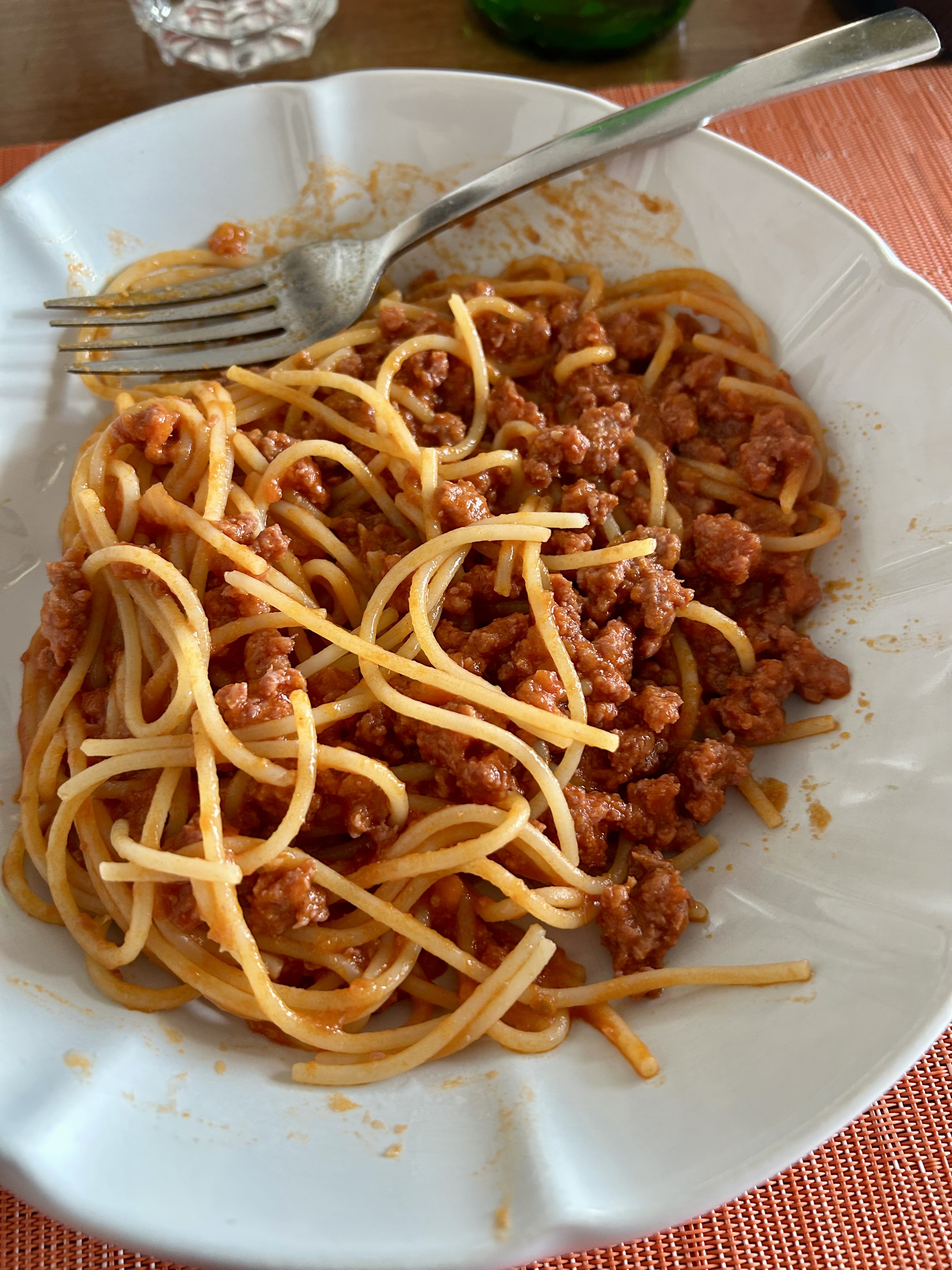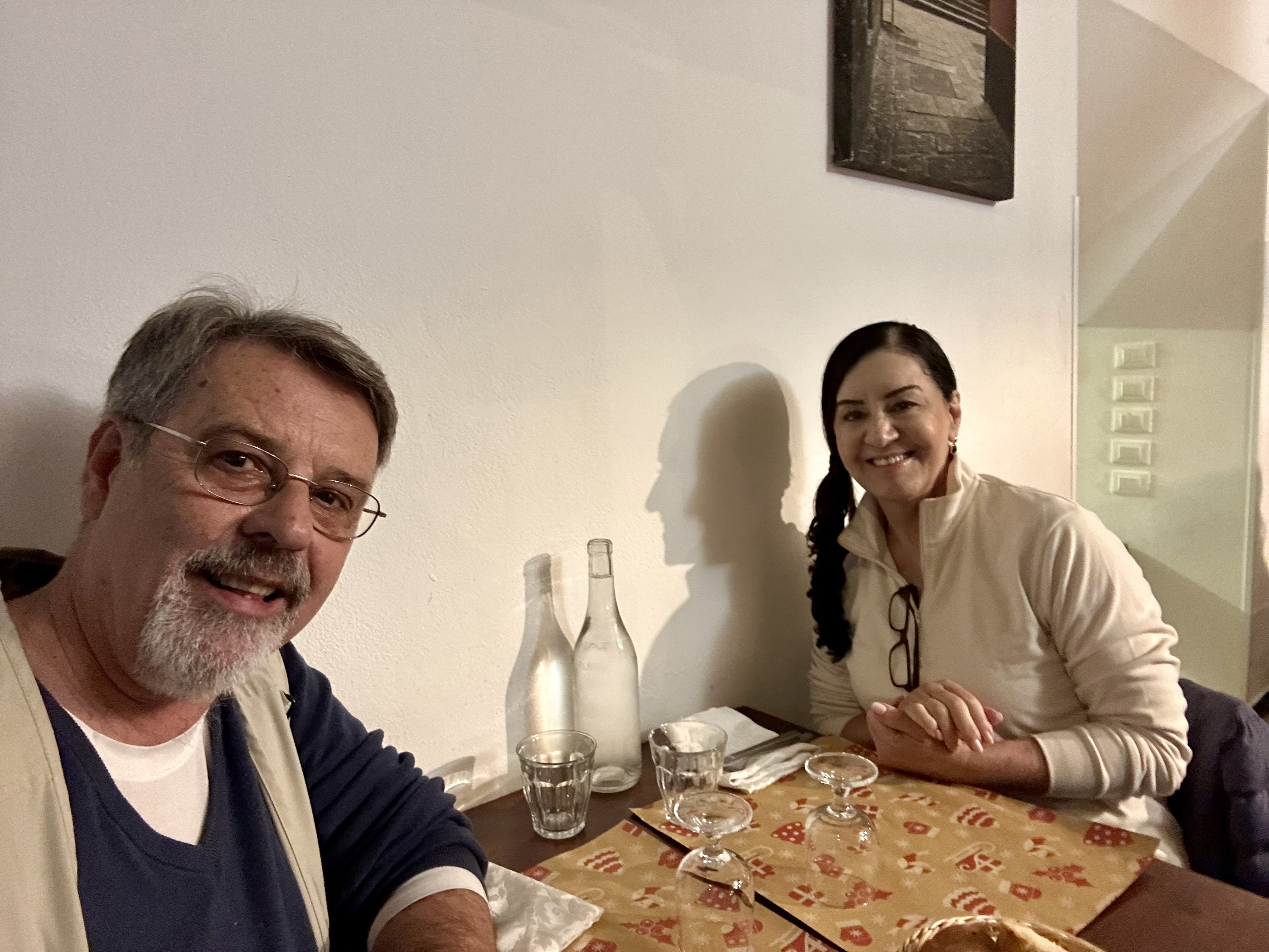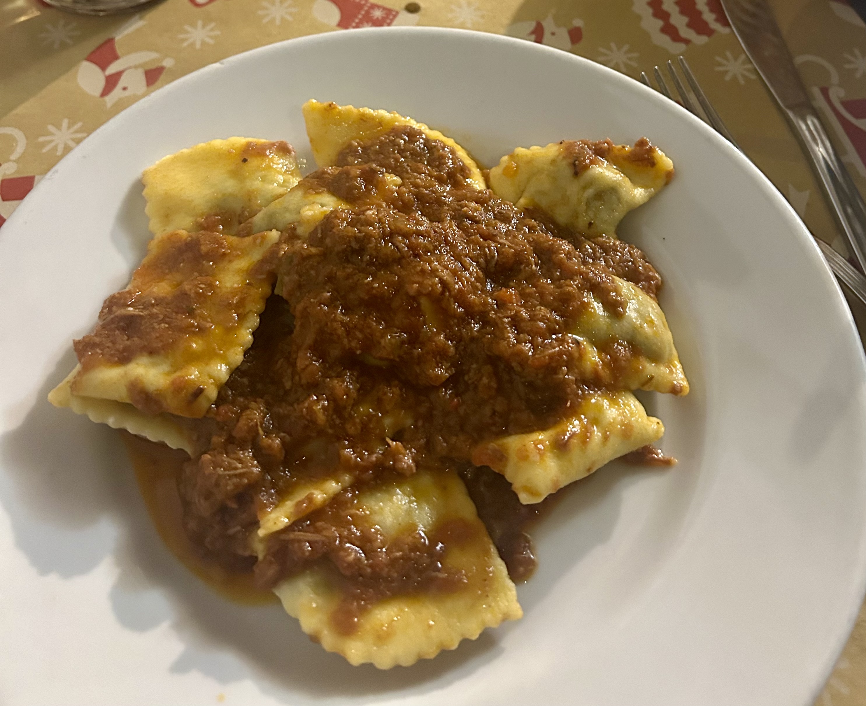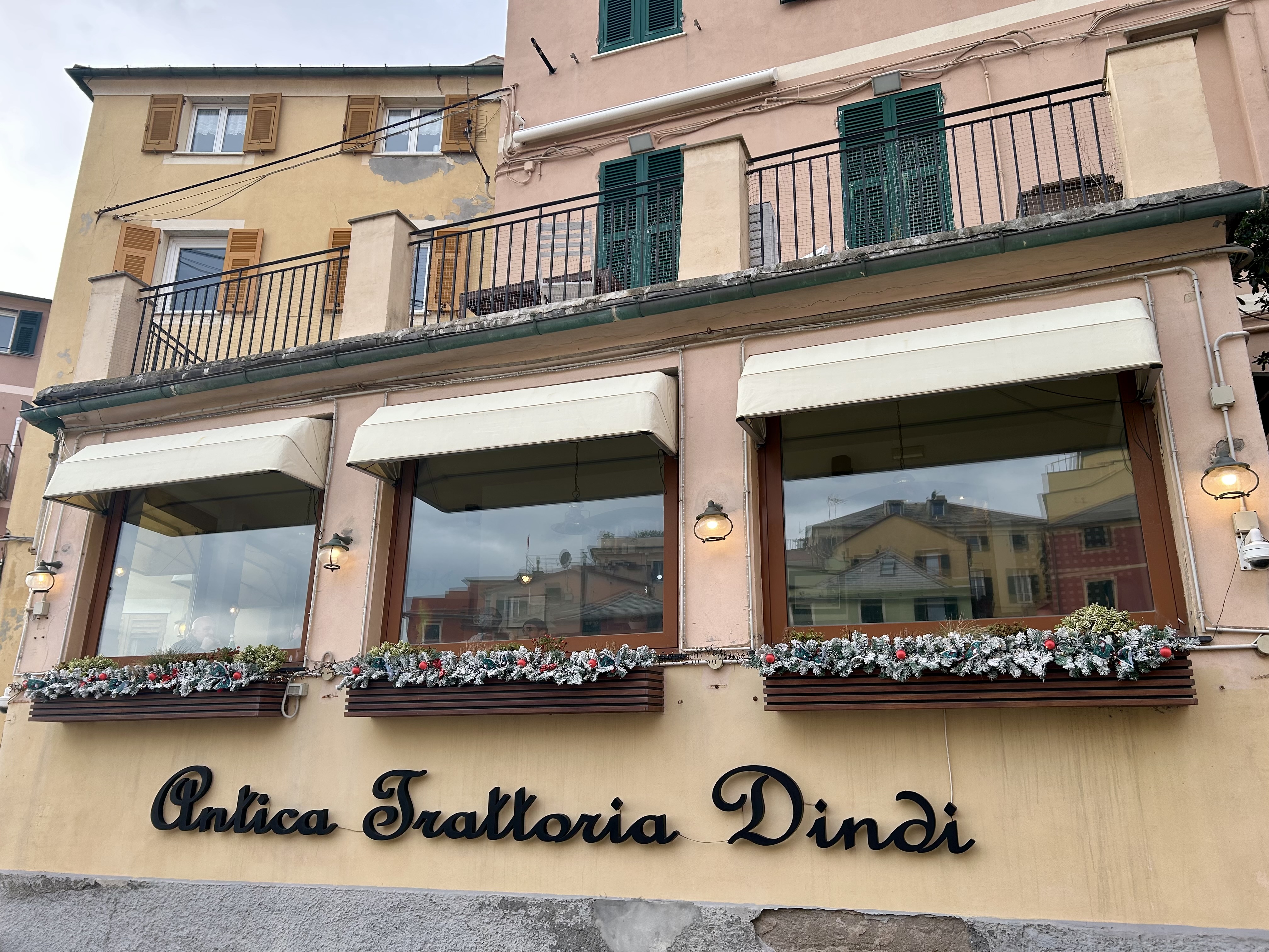 Sempre buscamos pontos diferentes nas nossas viagens. Na nossa caminhada pelas vielas do Centro Histórico chamou a atenção uma aglomeração de pessoas na frente de um pequeno restaurante, a Trattoria della Grazie, na Via S. Giorgio quase em frente a Vico di S. Cosimo. Fomos conferir e verificamos que a casa tinha cinco selos de reconhecimento da Slow Food Editore. Foi o sinal para a nossa parada de almoço no dia 10/01/25 – um ravioli à bolonhesa e um nhoque ao pesto, acompanhados de pão e vinho da casa ao custo de 30 Euros. O cardápio de opções é bem simples e está escrito à mão.