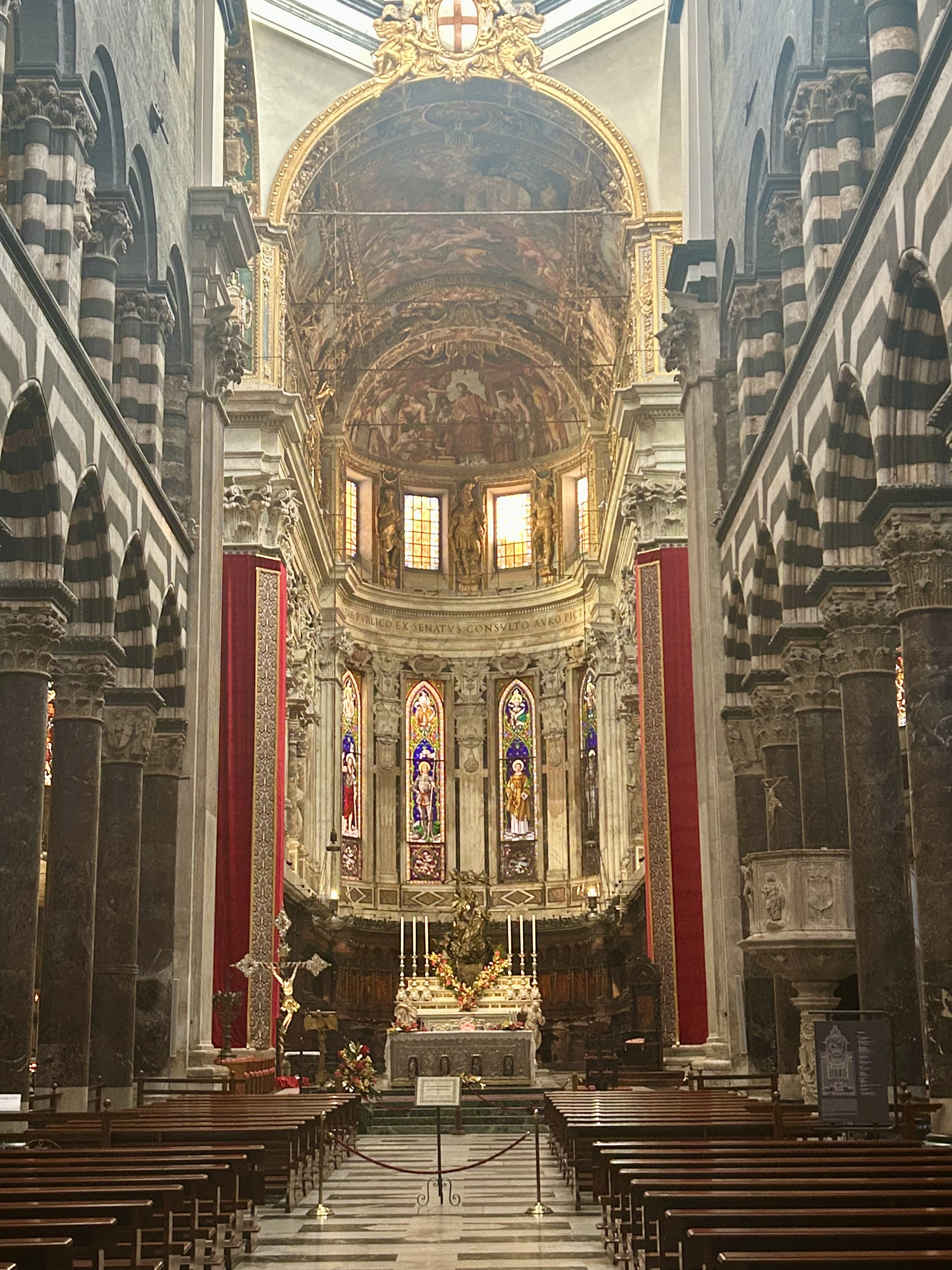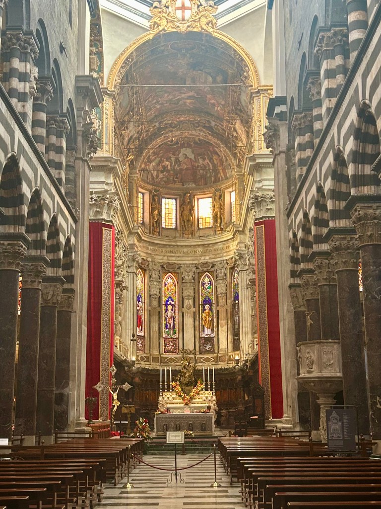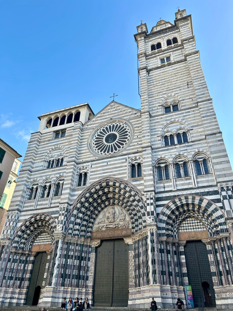 Foi construída por volta de 1098 numa região onde escavações arqueológicas identificaram ruínas do período romano. A Catedral abriga as cinzas de San Giovanni Battista, padroeiro da cidade, que chegou a Gênova no final da Primeira Cruzada. A igreja é uma obra prima gótica e românica, toda em mármore preto e branco em bandas alternadas. A arte e a arquitetura revelam a riqueza histórica e o poder da antiga república marítima.