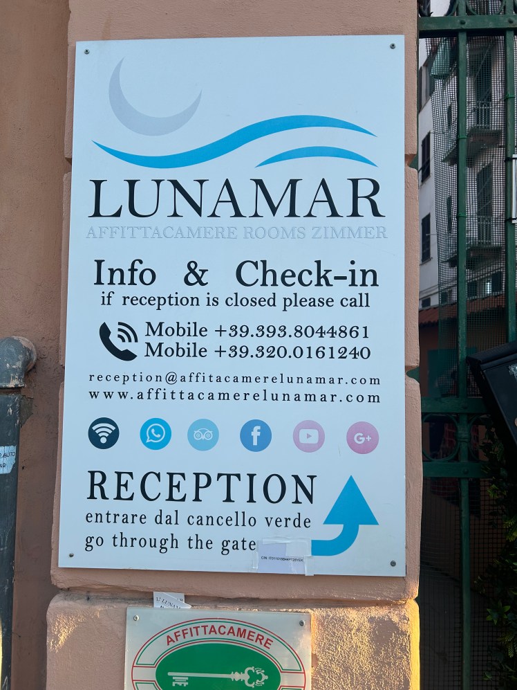 La Spezia oferece um excelente conjunto de hoteis e de affitacamares, que é uma estrutura composta por um quarto de apartamento com banheiro privativo. Tem ingresso autônomo. Escolhemos pelo Booking o Affittacamere Lunamar, que ficava a menos de 200 metros da Estação La Spezia Centrale. Da janela do quarto era possível avistar os trens. O único ponto fraco é que o café da manhã estava disponível a uns 300 metros do prédio, no calçadão principal da cidade.