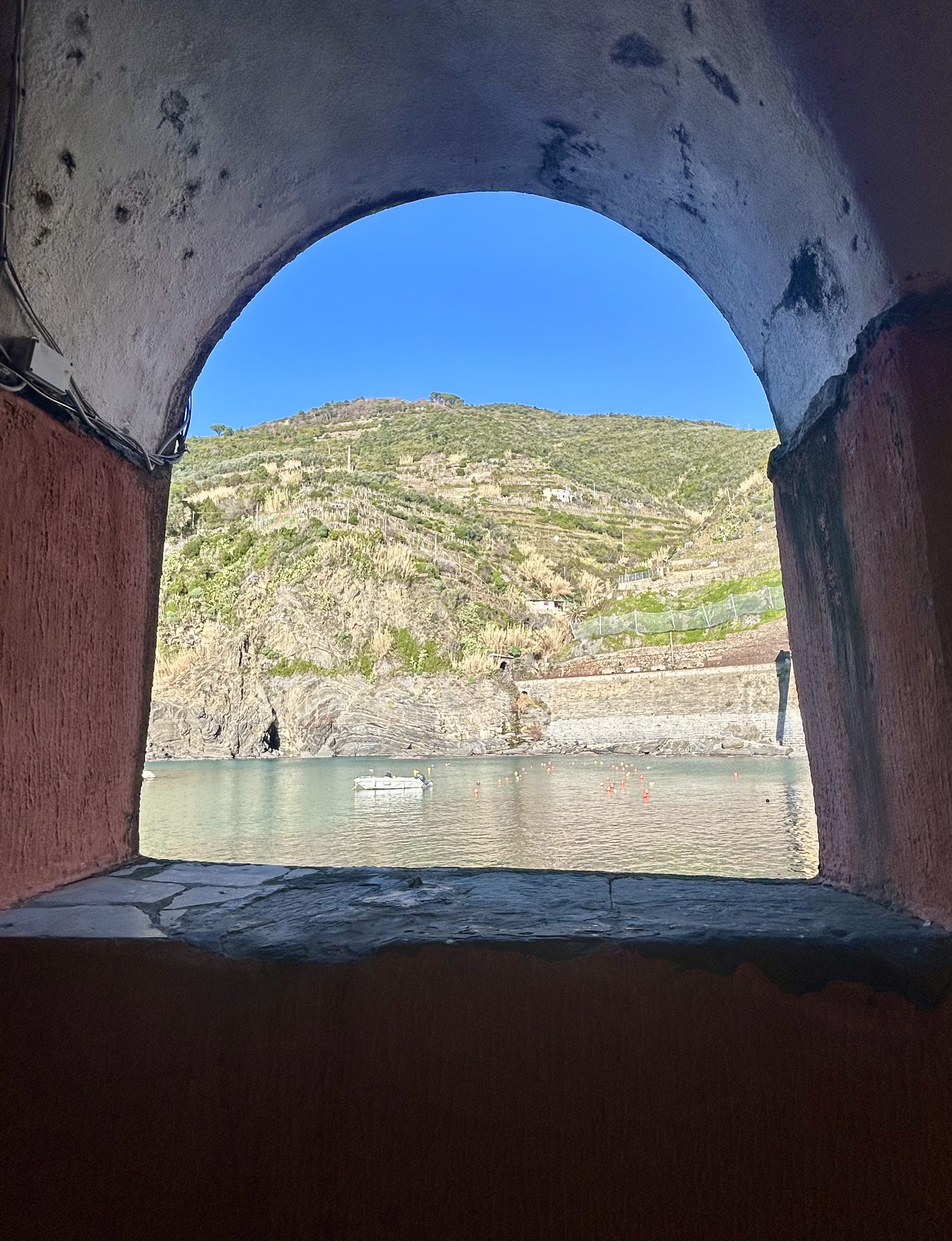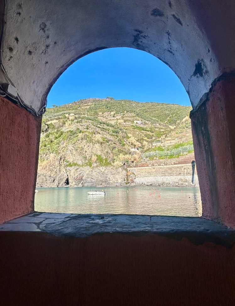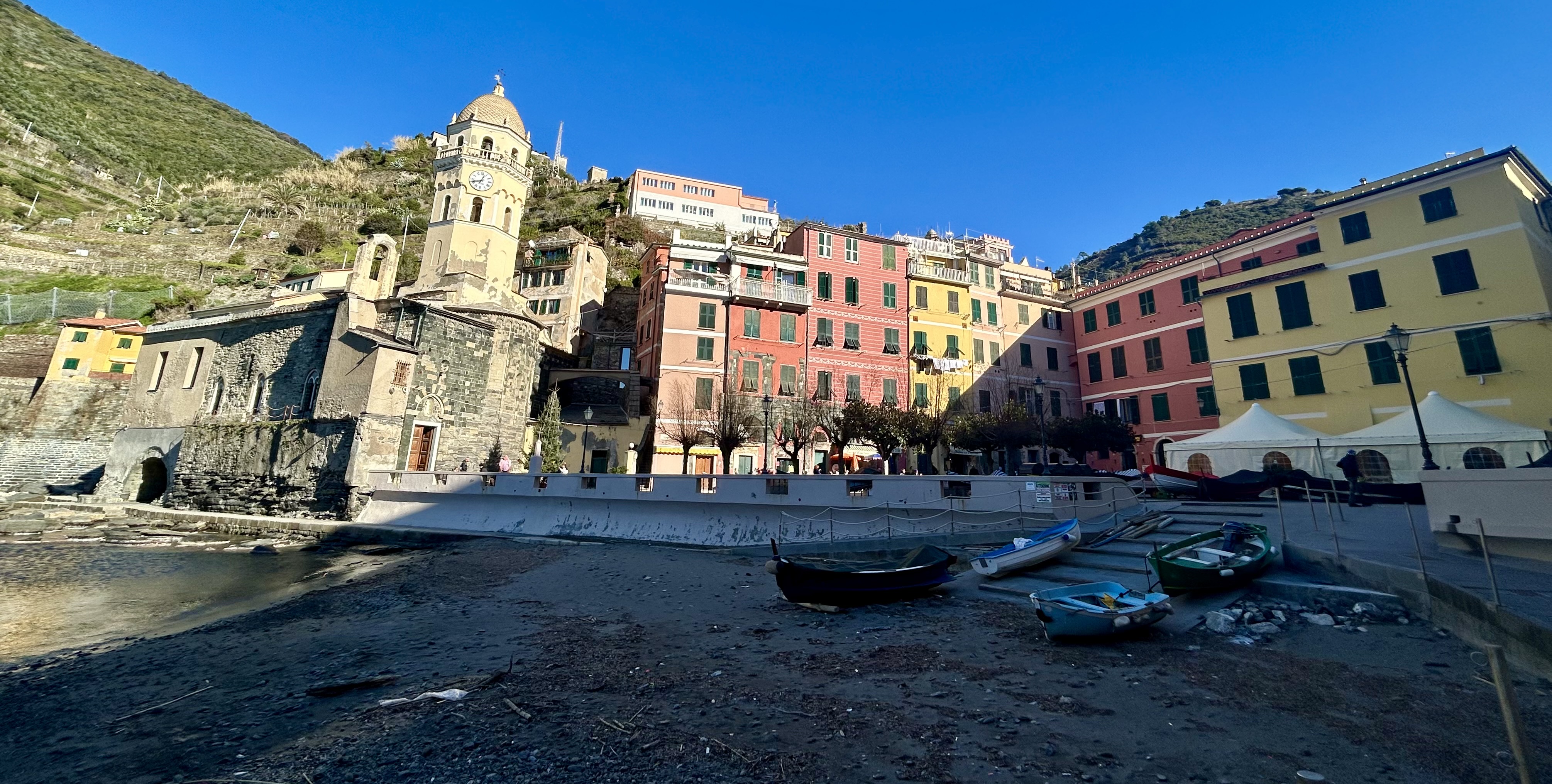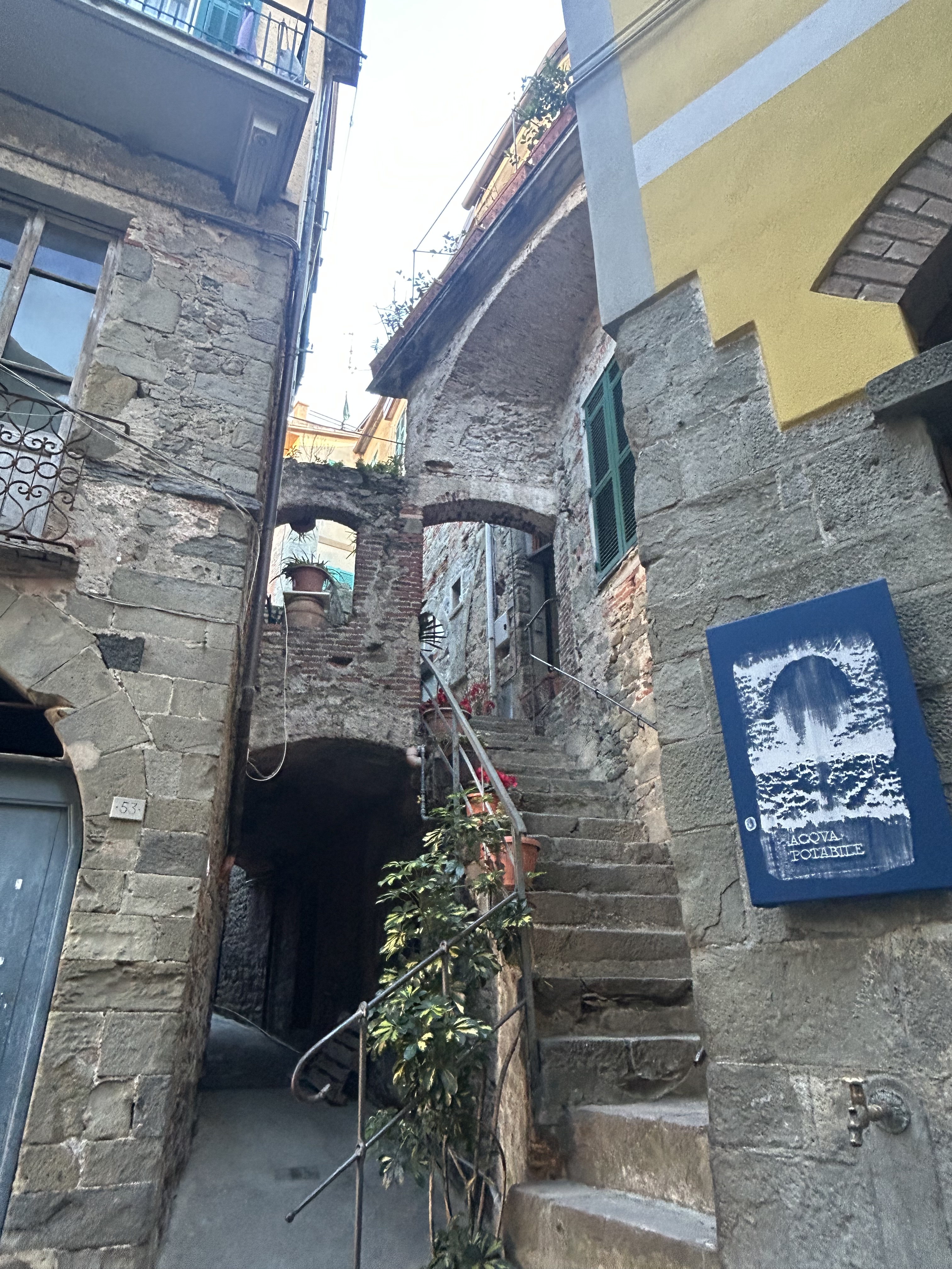 A aldeia não tem praia, mas um pequeno porto, onde diversas canoas estão “estacionadas” na calçada. As informações indicam que a aldeia é do século 7. Um longo túnel de quase 200 metros liga a estação de trem até a cidadela. Eram tantas pessoas disputando espaço no túnel que nos impressionamos. Faz muitos anos que viajamos nesta época do ano e geralmente é um período de baixa temporada por conta do frio. Já chegamos em cidadezinhas que era somente nós, eu e a Rossani, os turistas vagueando pelas ruas. Mas a sensação que ficamos visitando a região, desde Gênova a La Spezia, é que neste ano o inverno não espantou os turistas.