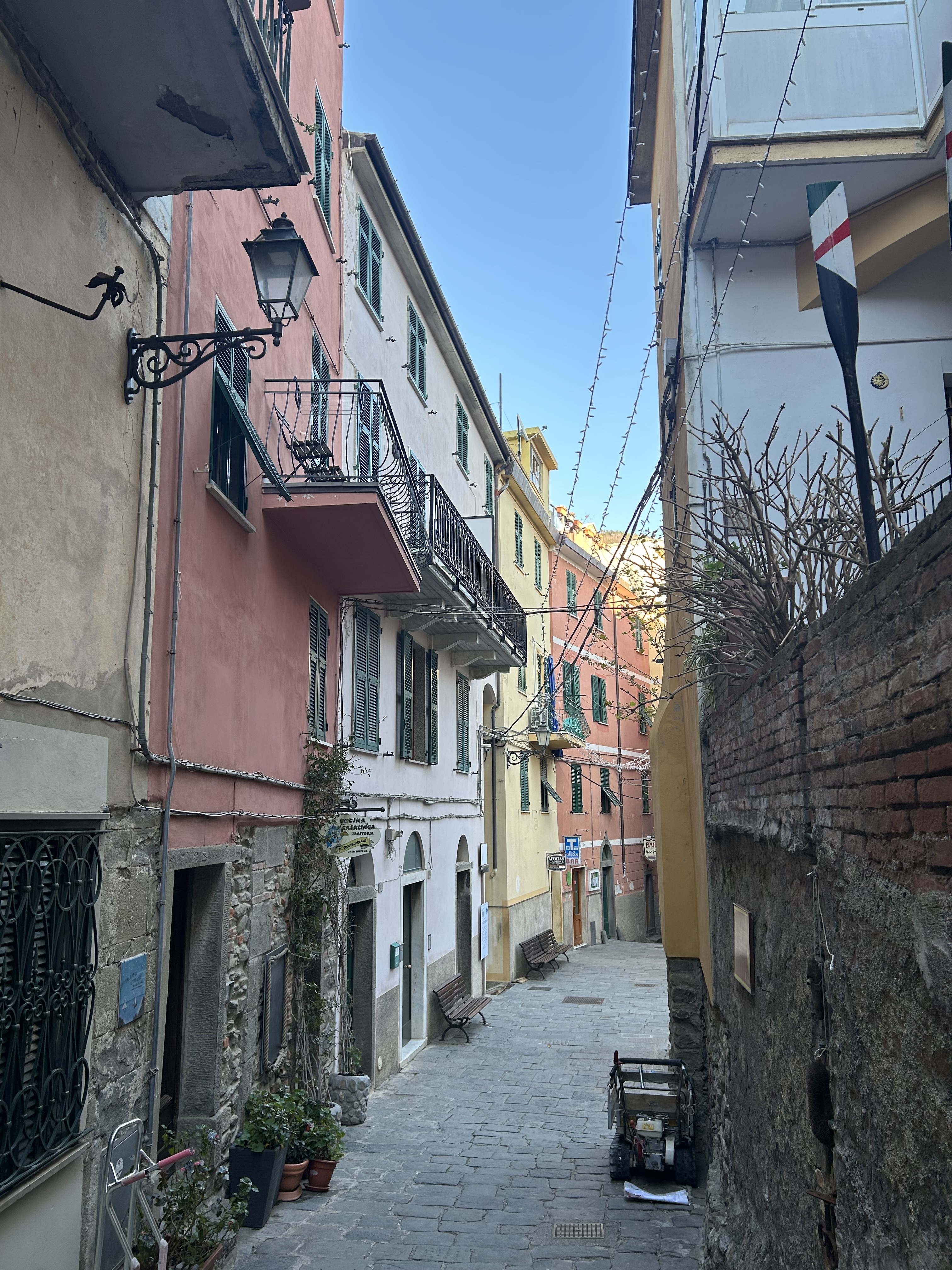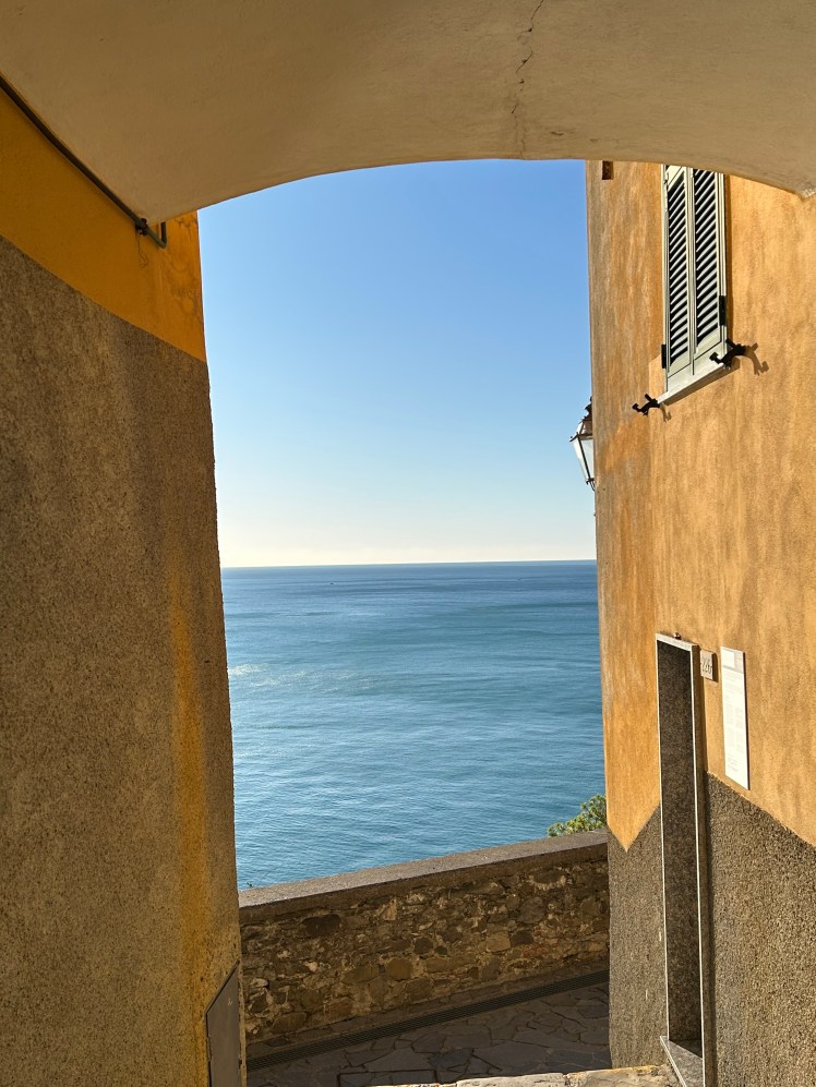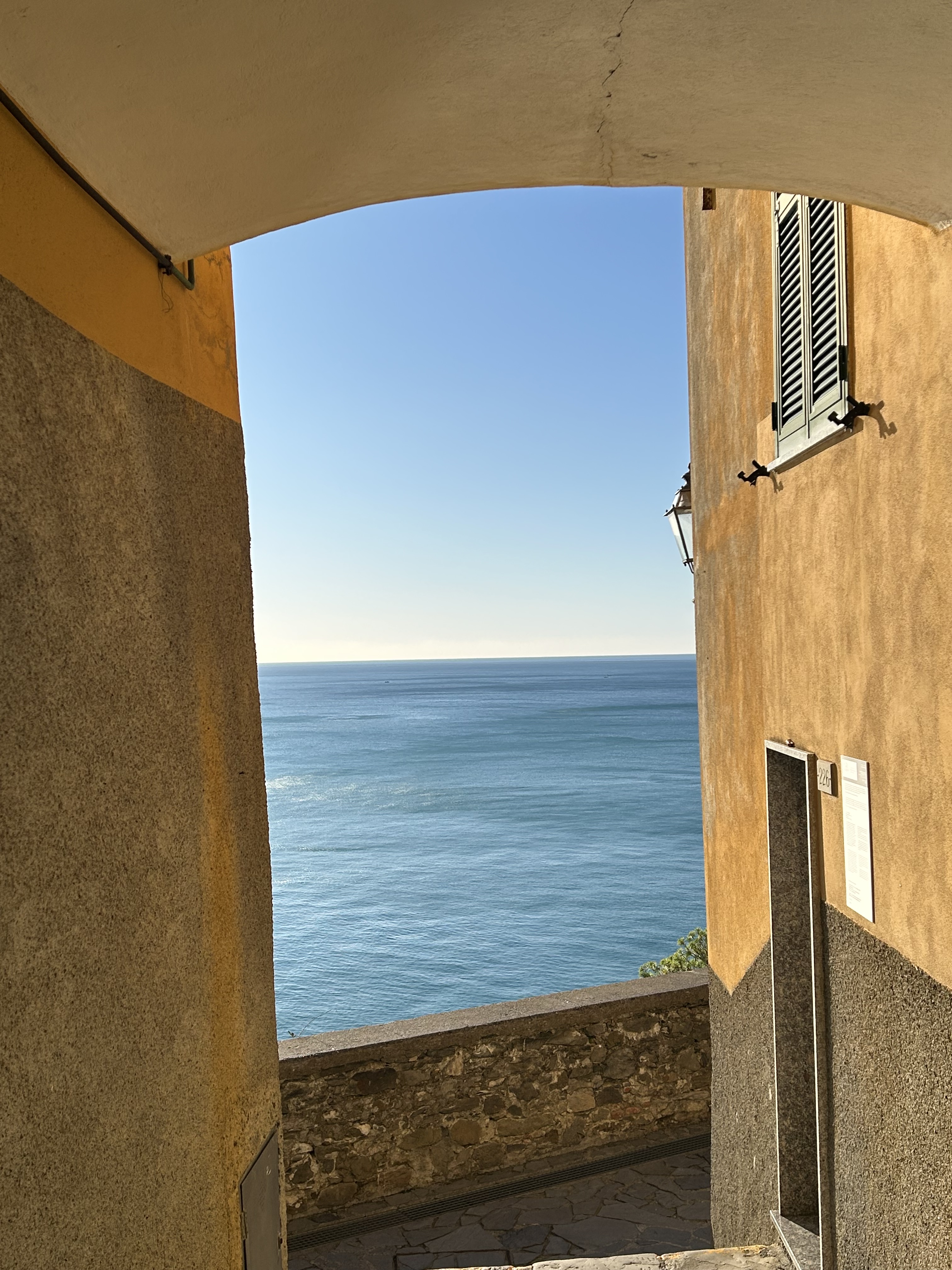 Corniglia tem pelo menos dois pontos de onde se pode olhar a imensidão do Mediterrâneo. A vila tem muitas ruelas estreitas. Caminhamos pela cidadela, subimos e descemos as ruelas, e encontramos apenas um bar aberto. Pela dificuldade de acesso, Corniglia é o menos visitado entre os cinco vilarejos, mas justamente pela localização, um dos mais pitorescos Assim como as demais terras, as primeiras informações sobre Corniglia datam de 1254. Saímos de cidadela com uma curiosidade: mais ou menos uns 200 (ou mais) metros acima de Corniglia, avistamos outra comunidade, mas que sequer é citada nos mapas turísticos. Imaginamos quem seriam aqueles intrépidos moradores de um local tão inóspito e pouco acessível.