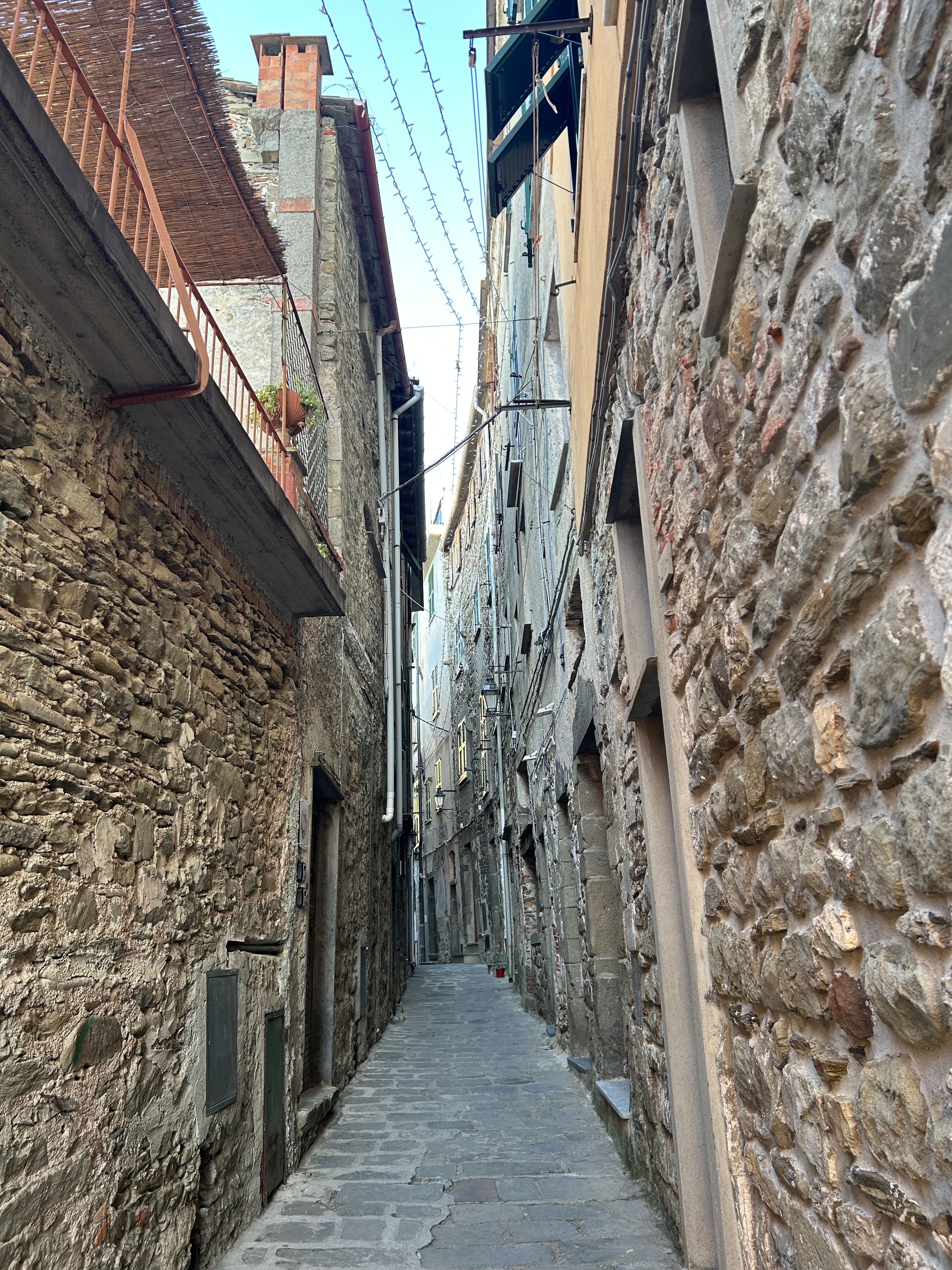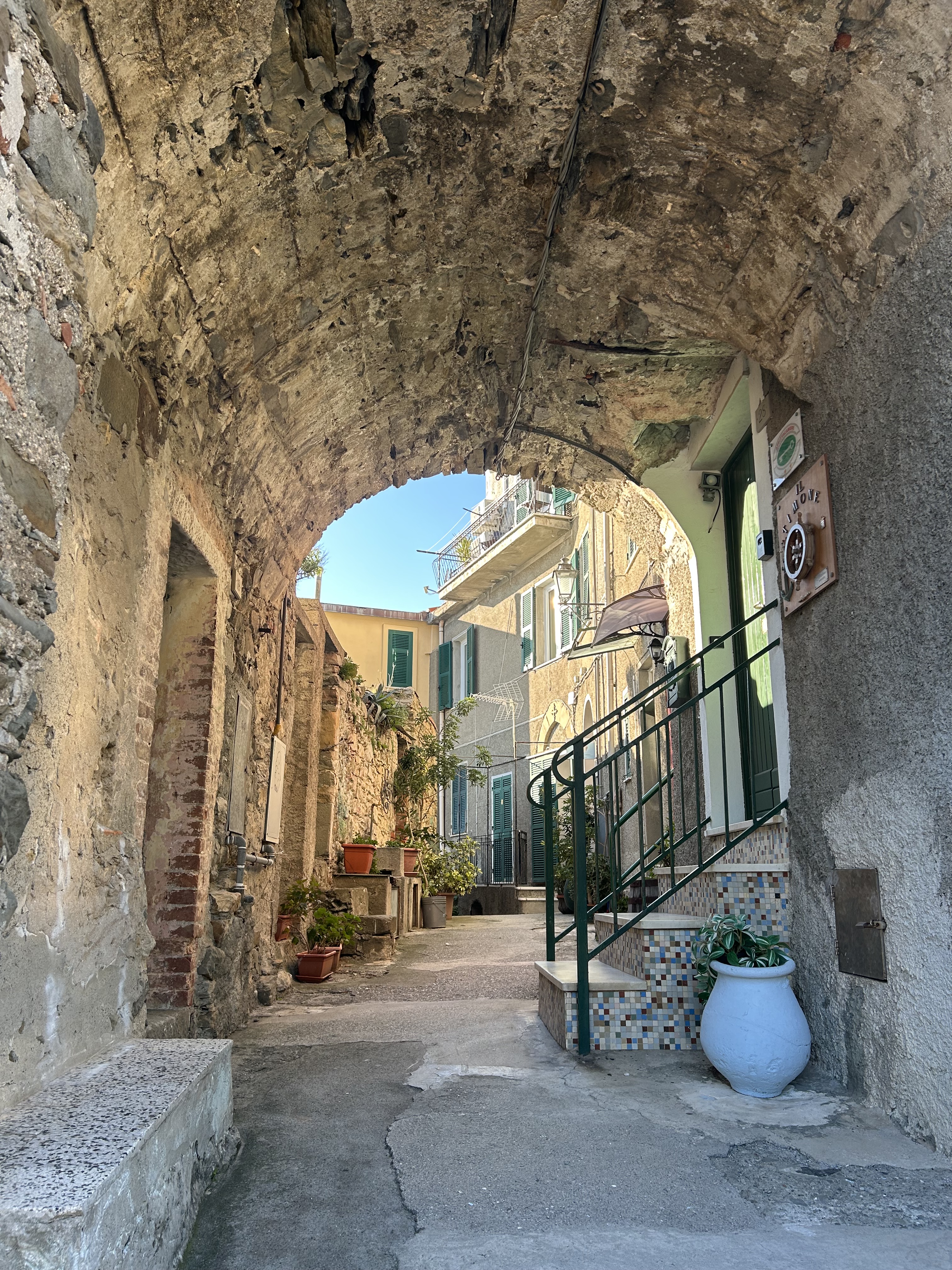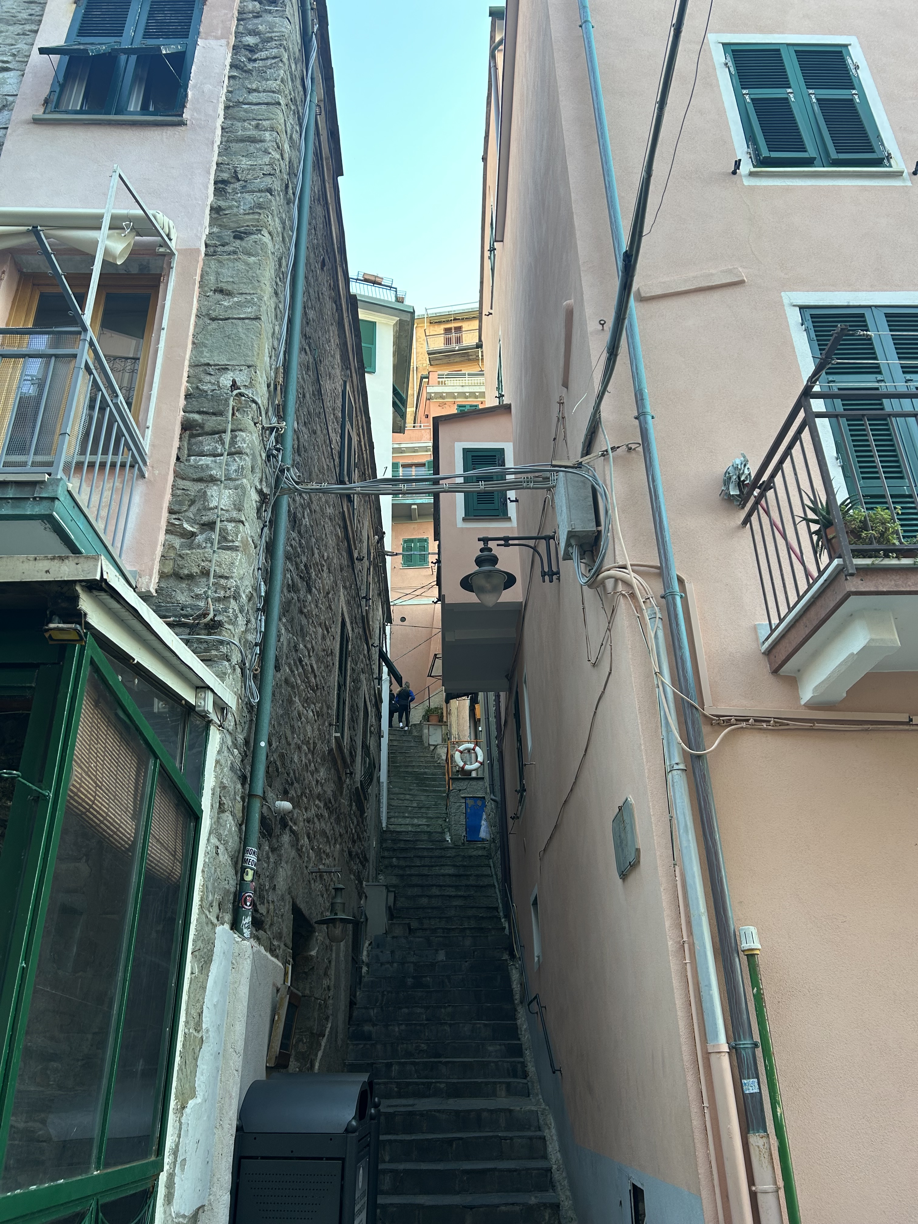 Corniglia tem pelo menos dois pontos de onde se pode olhar a imensidão do Mediterrâneo. A vila tem muitas ruelas estreitas. Caminhamos pela cidadela, subimos e descemos as ruelas, e encontramos apenas um bar aberto. Pela dificuldade de acesso, Corniglia é o menos visitado entre os cinco vilarejos, mas justamente pela localização, um dos mais pitorescos Assim como as demais terras, as primeiras informações sobre Corniglia datam de 1254. Saímos de cidadela com uma curiosidade: mais ou menos uns 200 (ou mais) metros acima de Corniglia, avistamos outra comunidade, mas que sequer é citada nos mapas turísticos. Imaginamos quem seriam aqueles intrépidos moradores de um local tão inóspito e pouco acessível.