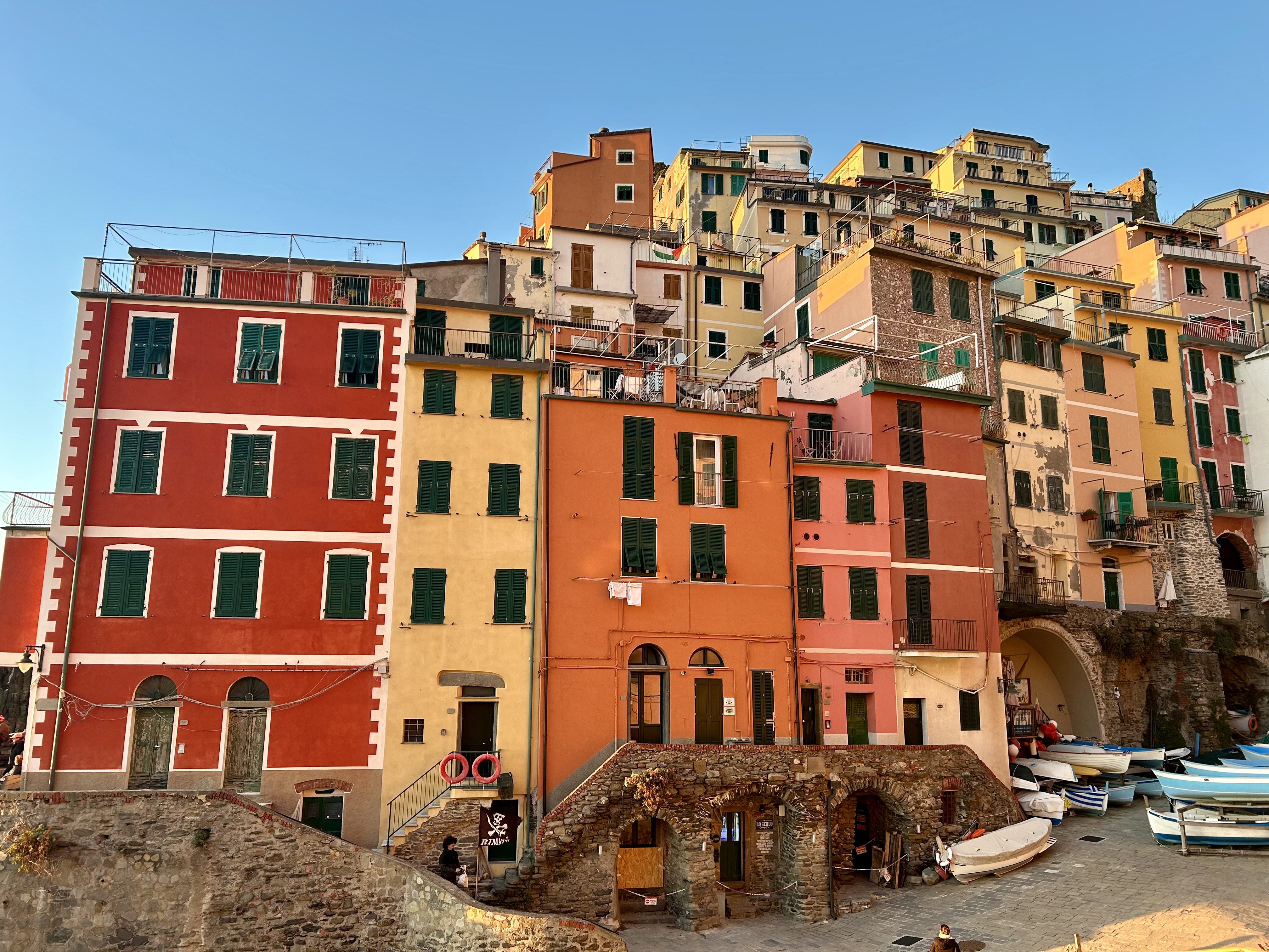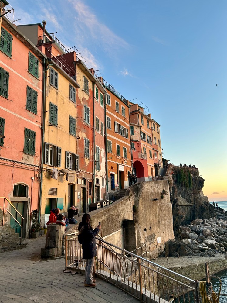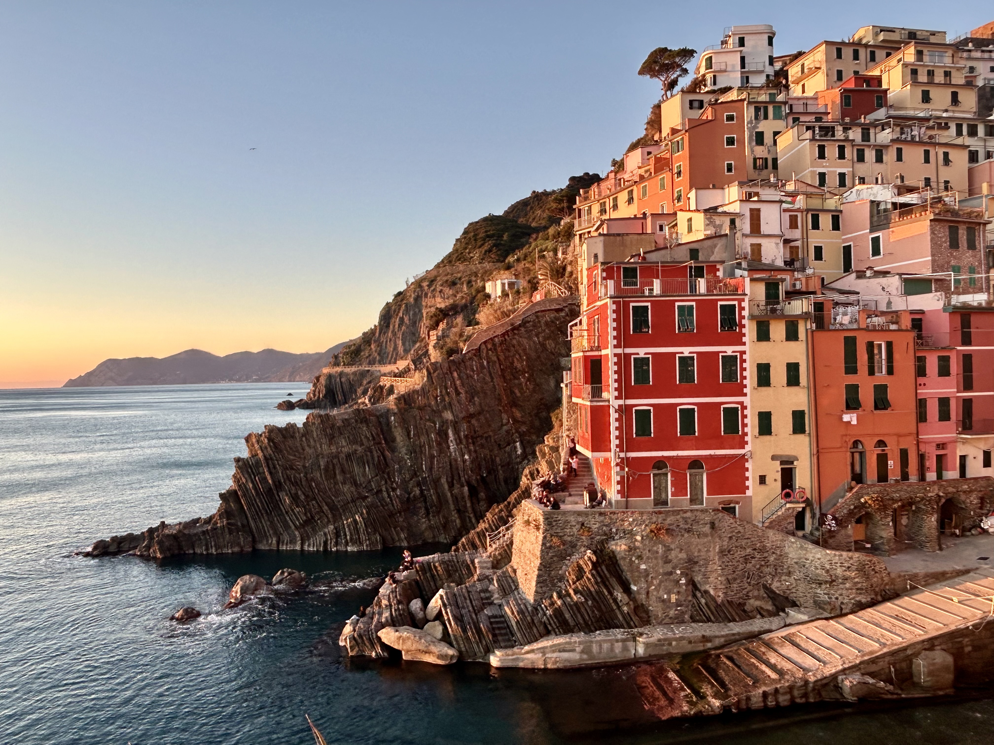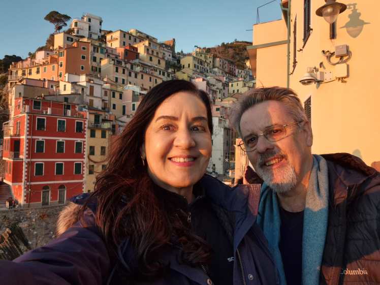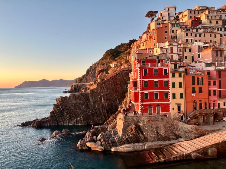 Para nós, ficou difícil decidir qual das aldeias de Cinque Terre é a mais bonita: ficamos entre Manarola e Riomaggiore. Sem dúvida, uma resposta difícil, porque elas são simplesmente fascinantes. Chegamos em Riomaggiore próximo ao por do sol, acompanhados de uma multidão de turistas disputando espaço pelas escadarias até um belvedere, onde o visual do entardecer era simplesmente espetacular. Ninguém arredou pé até que o sol se escondeu totalmente deixando o céu pintado de um alaranjado indescritível. O visual é impactante, as cores vivas das casas ficam ainda mais vibrantes durante o poente. É uma pintura em tons dourados que poderia adornar qualquer parede.