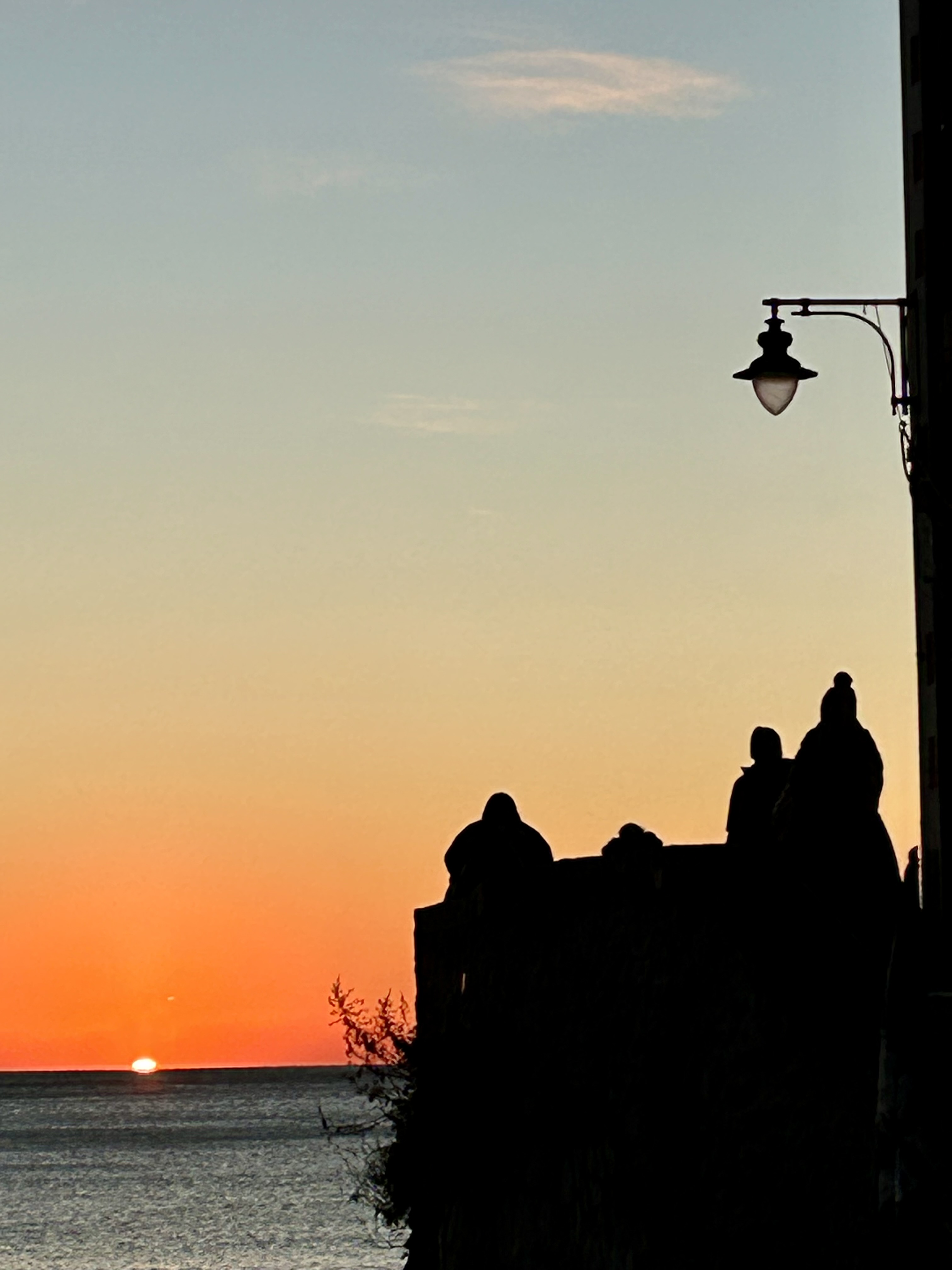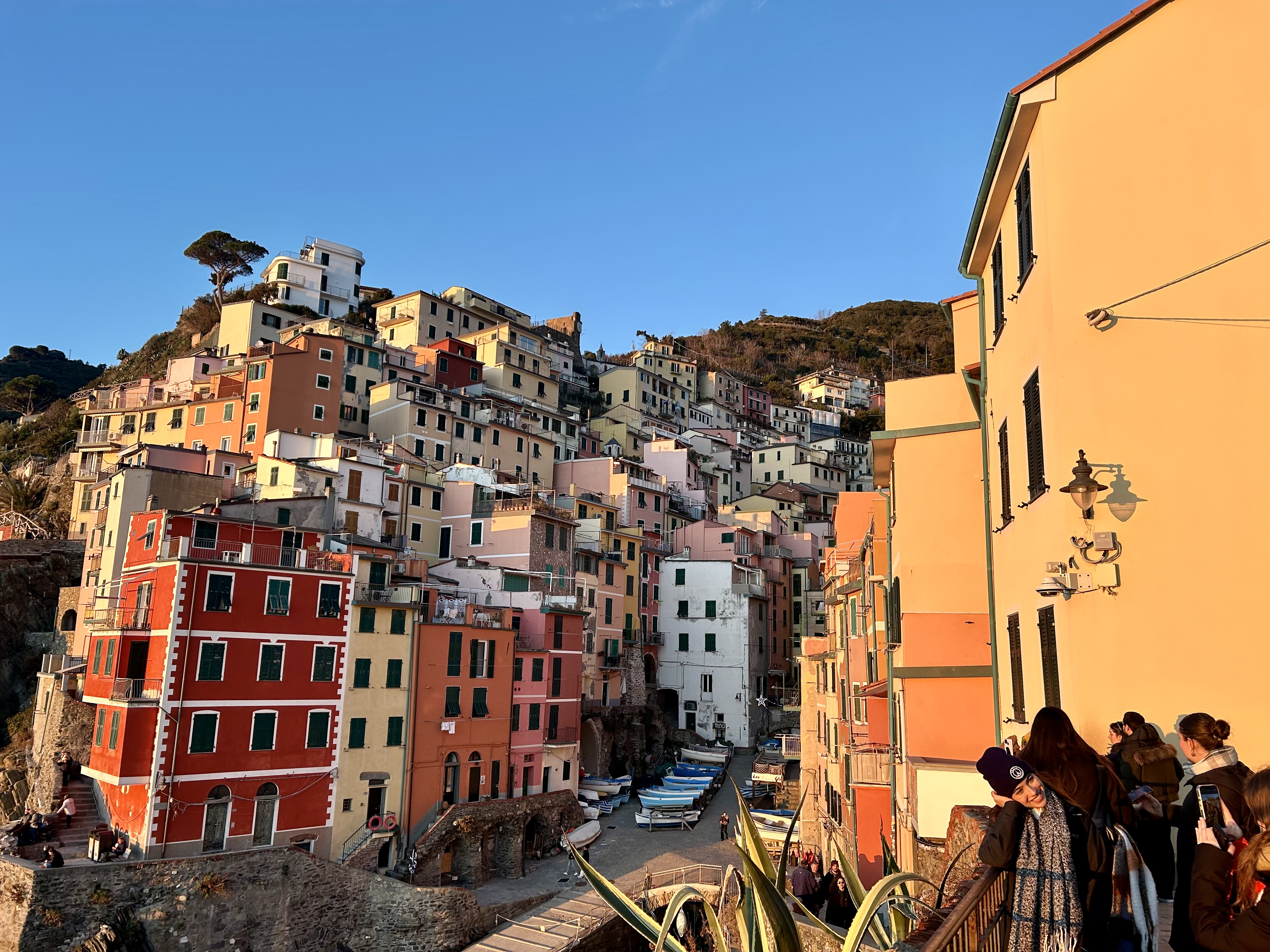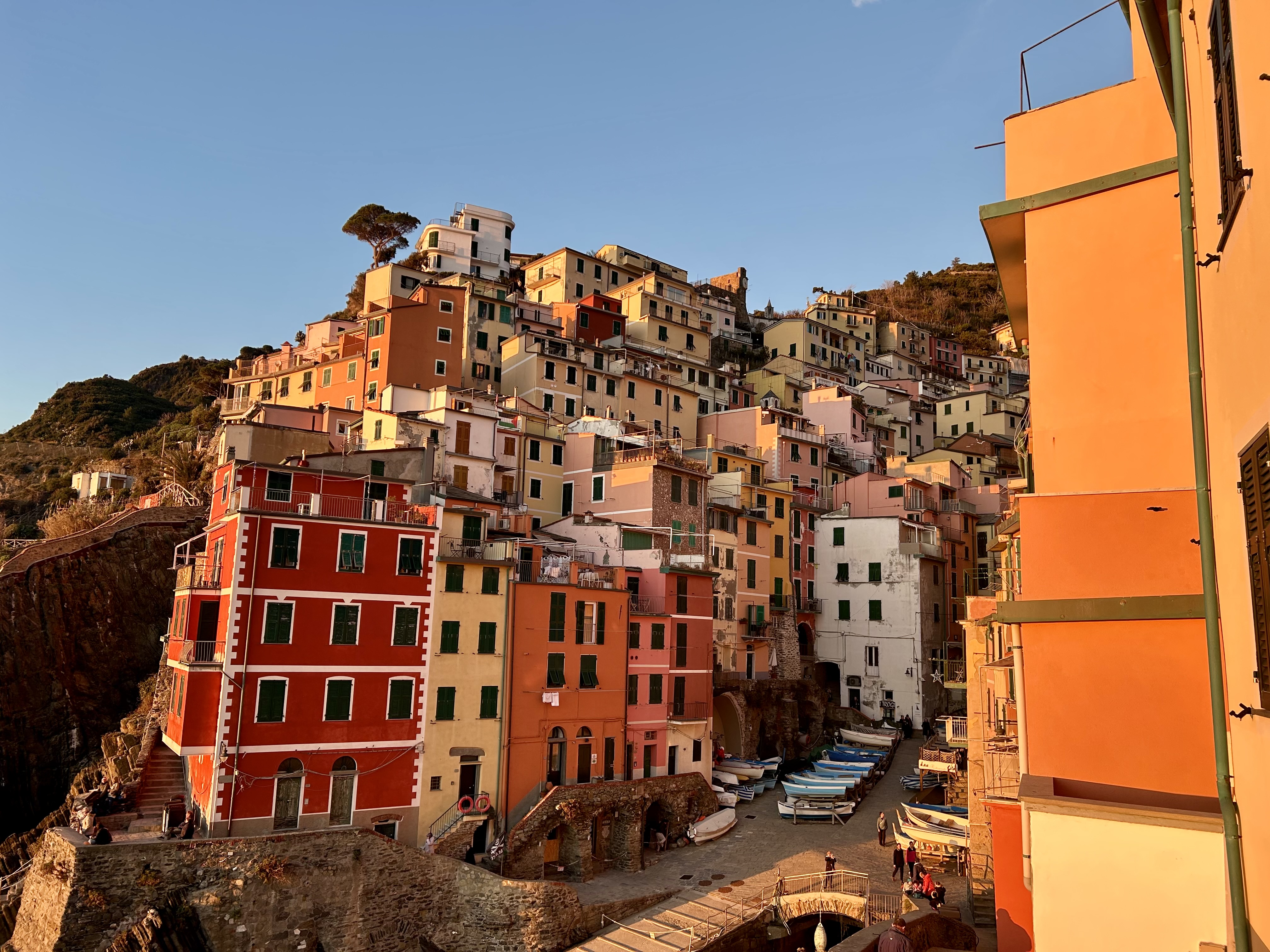 Para nós, ficou difícil decidir qual das aldeias de Cinque Terre é a mais bonita: ficamos entre Manarola e Riomaggiore. Sem dúvida, uma resposta difícil, porque elas são simplesmente fascinantes. Chegamos em Riomaggiore próximo ao por do sol, acompanhados de uma multidão de turistas disputando espaço pelas escadarias até um belvedere, onde o visual do entardecer era simplesmente espetacular. Ninguém arredou pé até que o sol se escondeu totalmente deixando o céu pintado de um alaranjado indescritível. O visual é impactante, as cores vivas das casas ficam ainda mais vibrantes durante o poente. É uma pintura em tons dourados que poderia adornar qualquer parede.