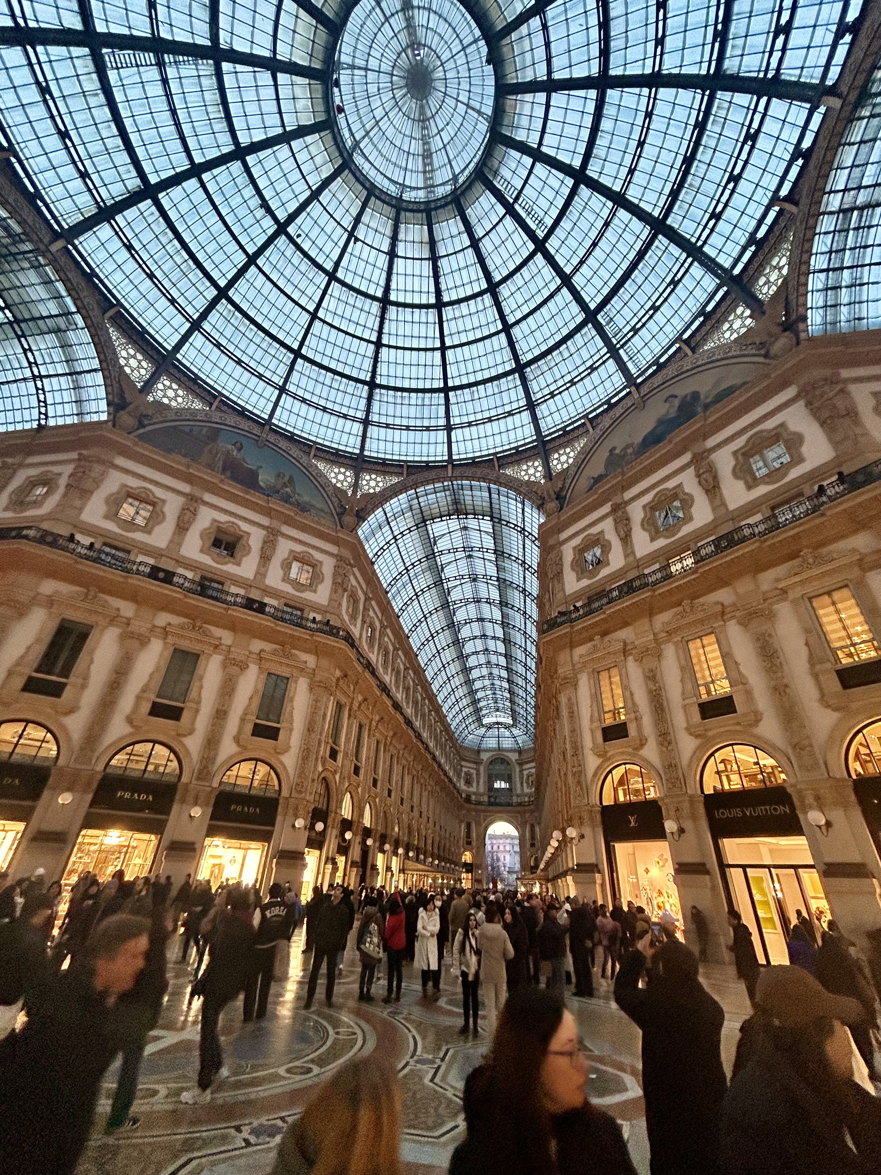 A Galeria Vittorio Emanuele II fica ao lado do Duomo. É um centro comercial histórico e com arquitetura deslumbrante, com lojas de luxo e restaurantes que avançam pelo corredor. Os preços são um pouco superiores aos cobrados em outros locais da cidade. No vão central, um mosaico com a figura de um touro chama a atenção pelo número de pessoas em redor. Diz a lenda que quem pisa com o calcanhar direito e rodopia trës vezes sobre os testículos do bovino, tem sorte e retorna a Milão. Pra nós, deu certo. Outra atração interessante fica no final da galeria. Trata-se do museu O Mondo di Leonardo, com réplicas de projetos desenhados pelo gênio. Tem invenções que parecem com uma asa delta, um helicóptero, um balão a gás e muitas outras. É incrível.
