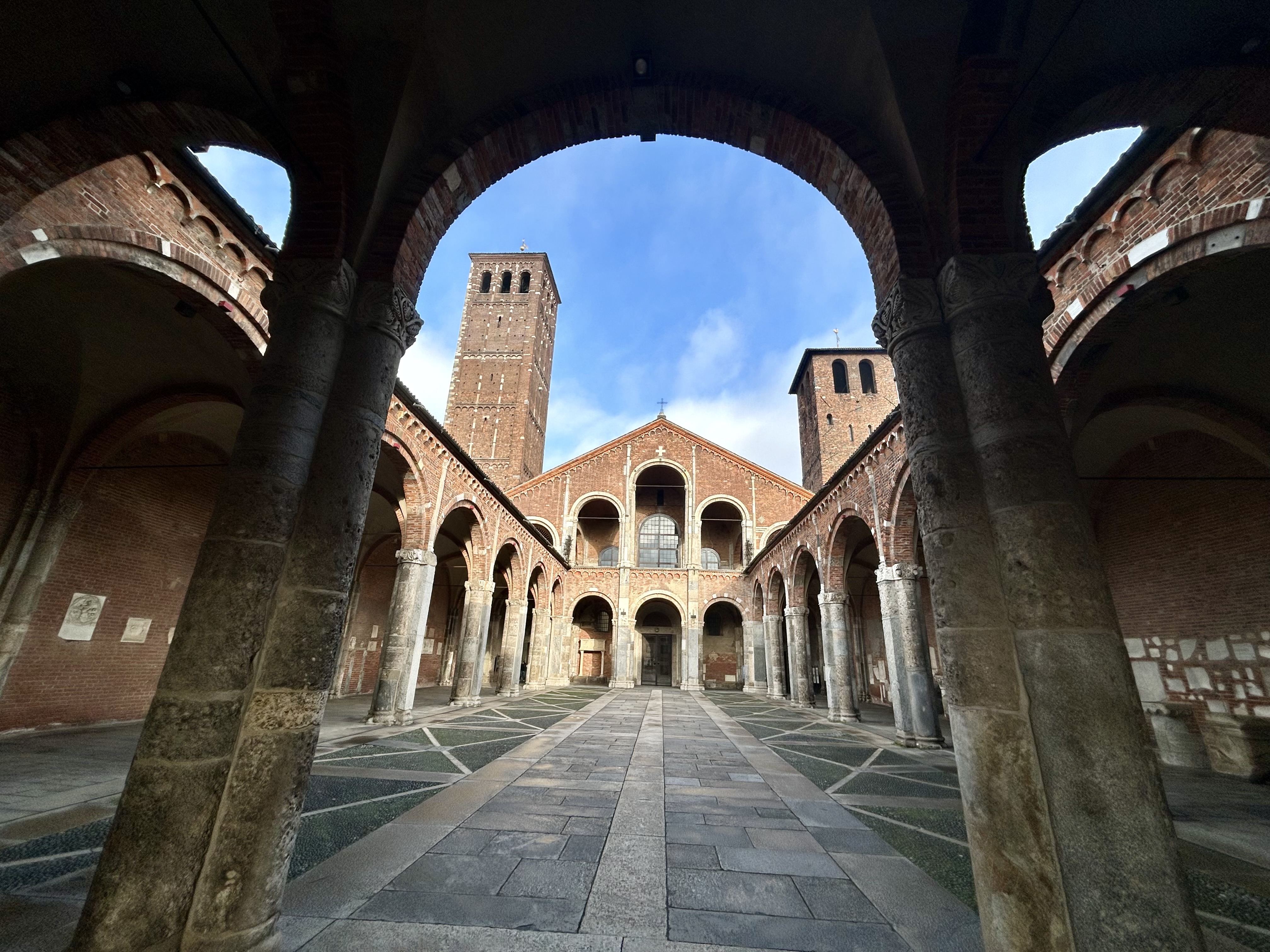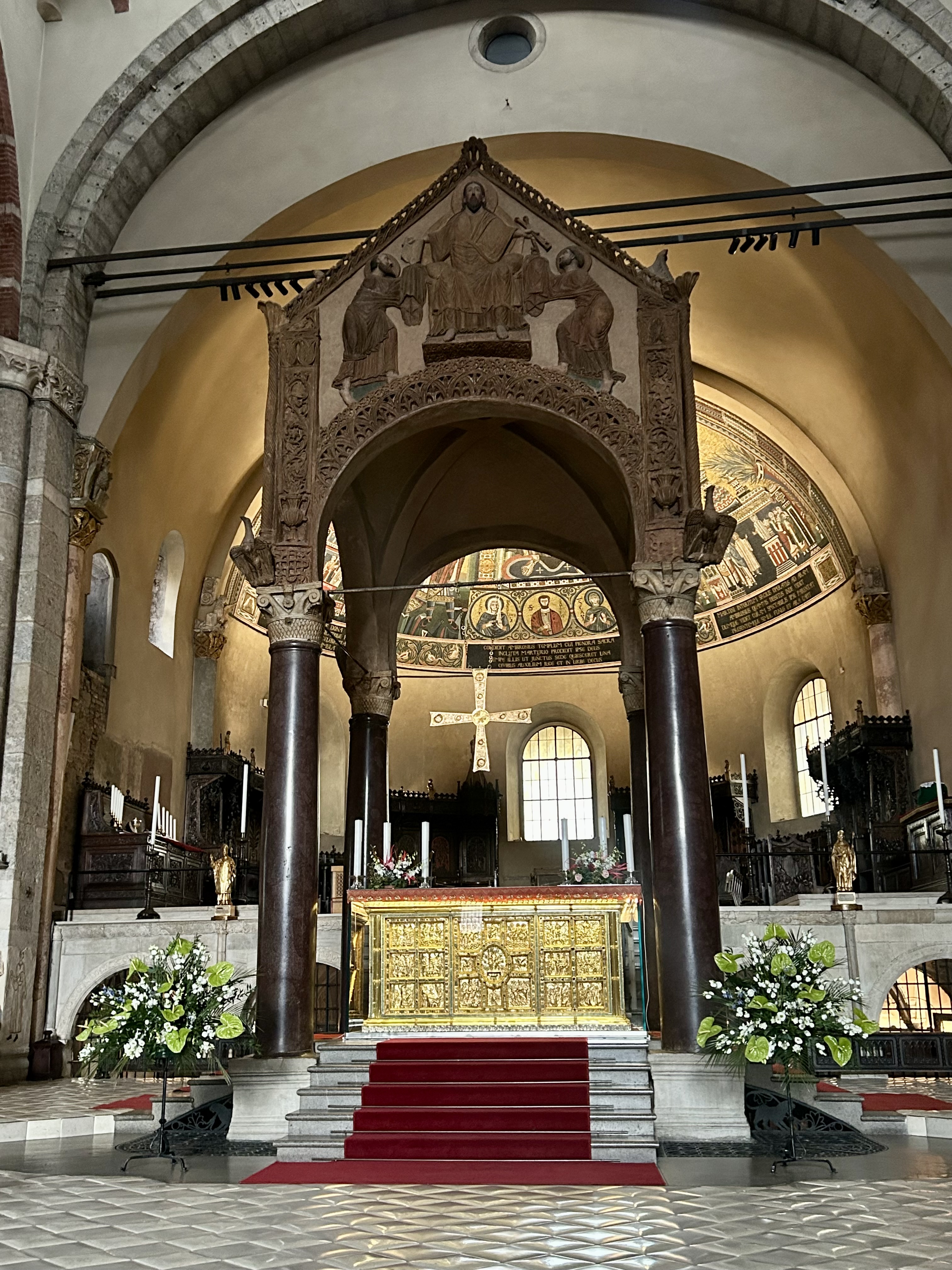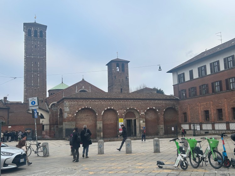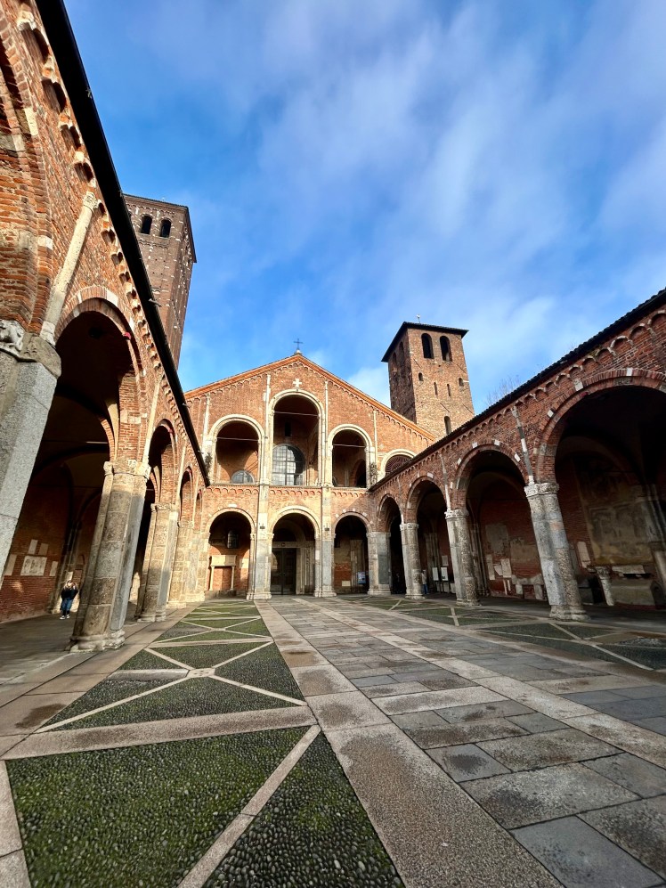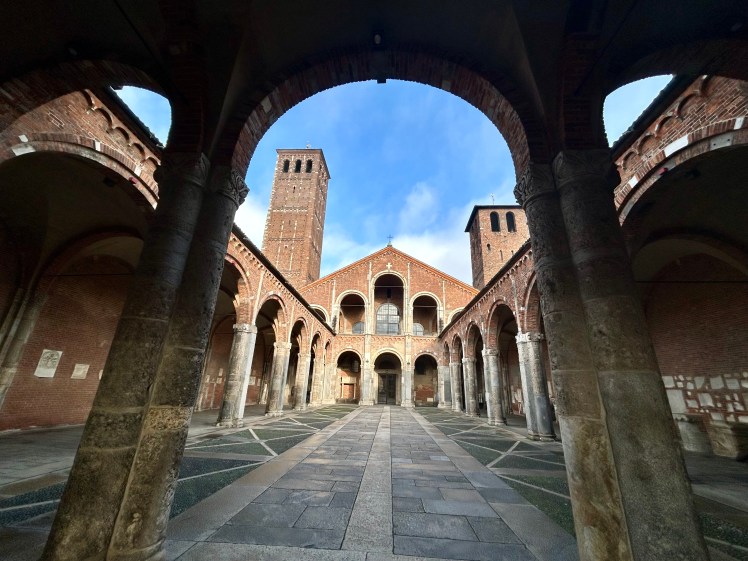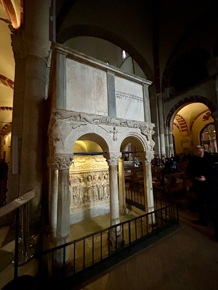 Do Arco da Paz, no Parque Sempione, caminhamos até um outro local que ainda não conhecíamos. A Basílica Santo Ambrósio é considerada a primeira igreja em estilo românico lombardo. Além de ser uma das primeiras igrejas de Milão, o prédio é um marco da arquitetura medieval e tem o nome do bispo que ordenou a sua construção entre 379 e 386. Foi reformada entre 1088 e 1099. A basílica tem as sepulturas de diversos mártires cristãos vítimas das perseguições romanas, além da sepultura do próprio Santo Ambrósio. O Altar Dourado com cenas esculpidas da vida de Cristo na frente e da vida de Ambrósio é simplesmente fantástico. Chama a atenção também o sarcófago romano no lado esquerdo da basílica.