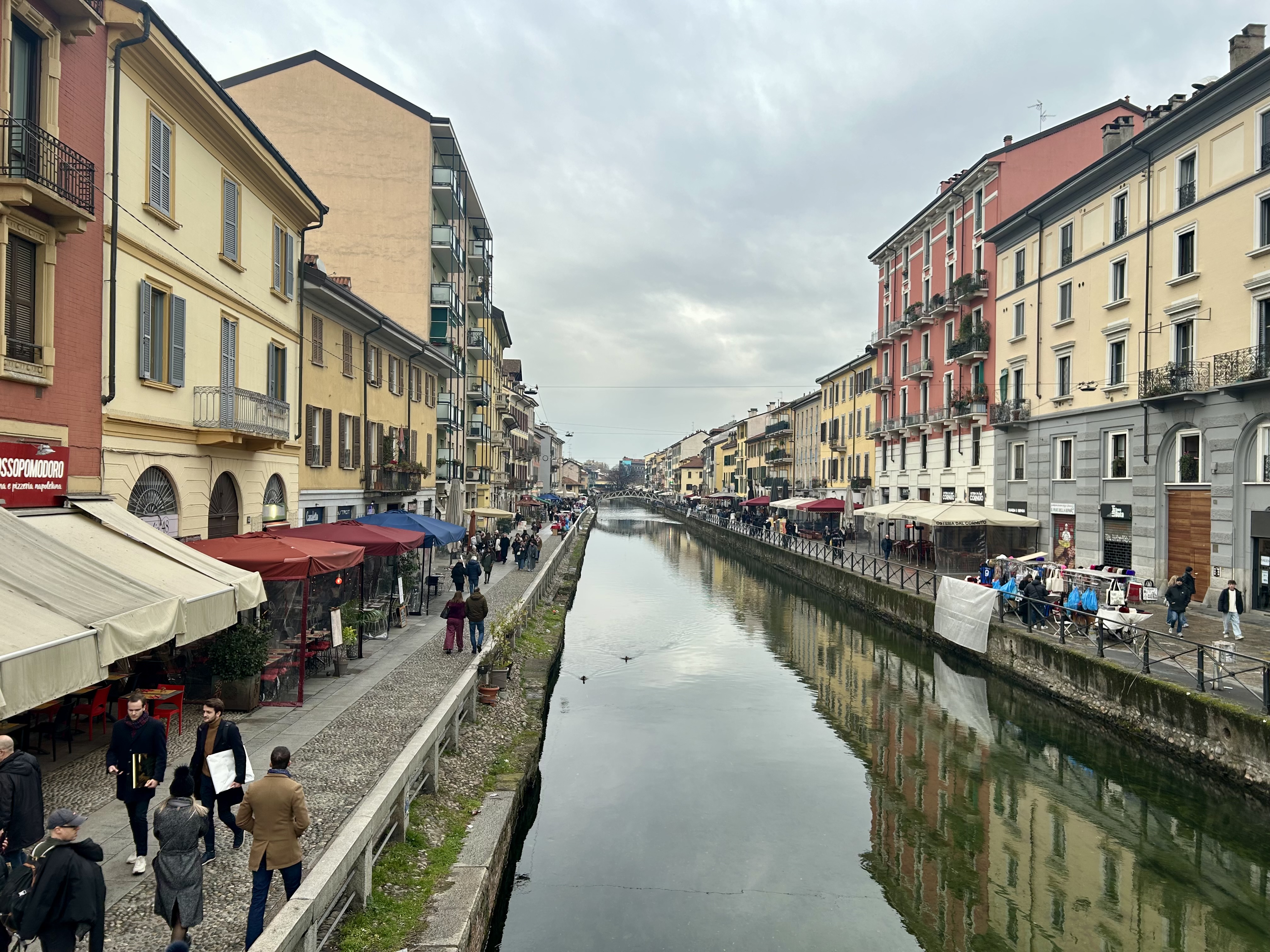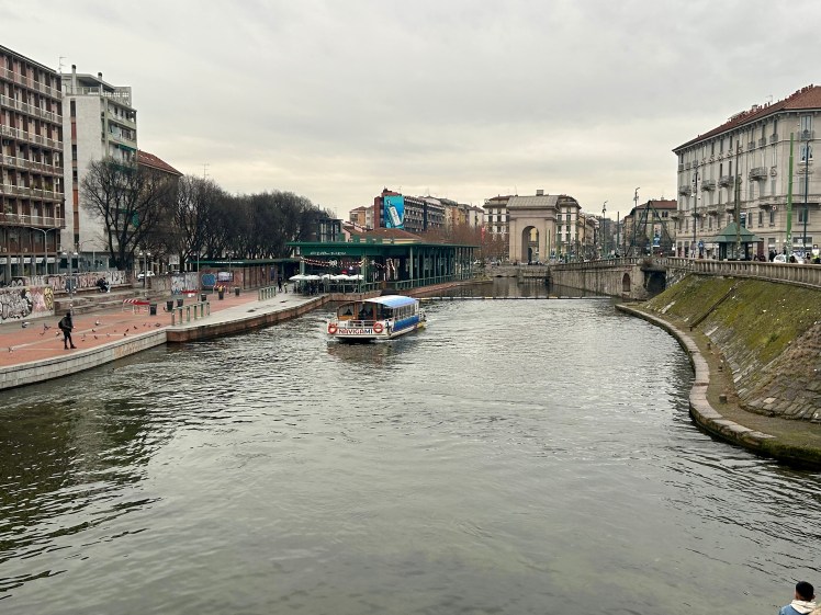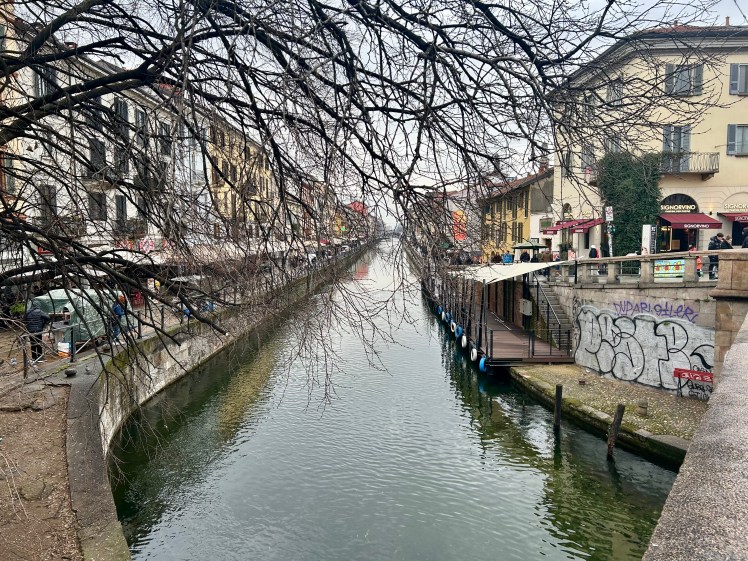 Outro passeio legal é pelo Naviglio, o bairro dos canais de Milão. Foi a primeira vez que estivemos nessa região da cidade. Cheio de bares e restaurantes, o local é charmoso e descolado. Fez parte de um conjunto de hidrovias que eram utilizadas para transporte de mercadorias e ligar Milão aos lagos próximos. Hoje existem apenas dois: Naviglio Grande e Naviglio Pavese. Aproveitamos o passeio e paramos para curtir o local e tomar um vinho.