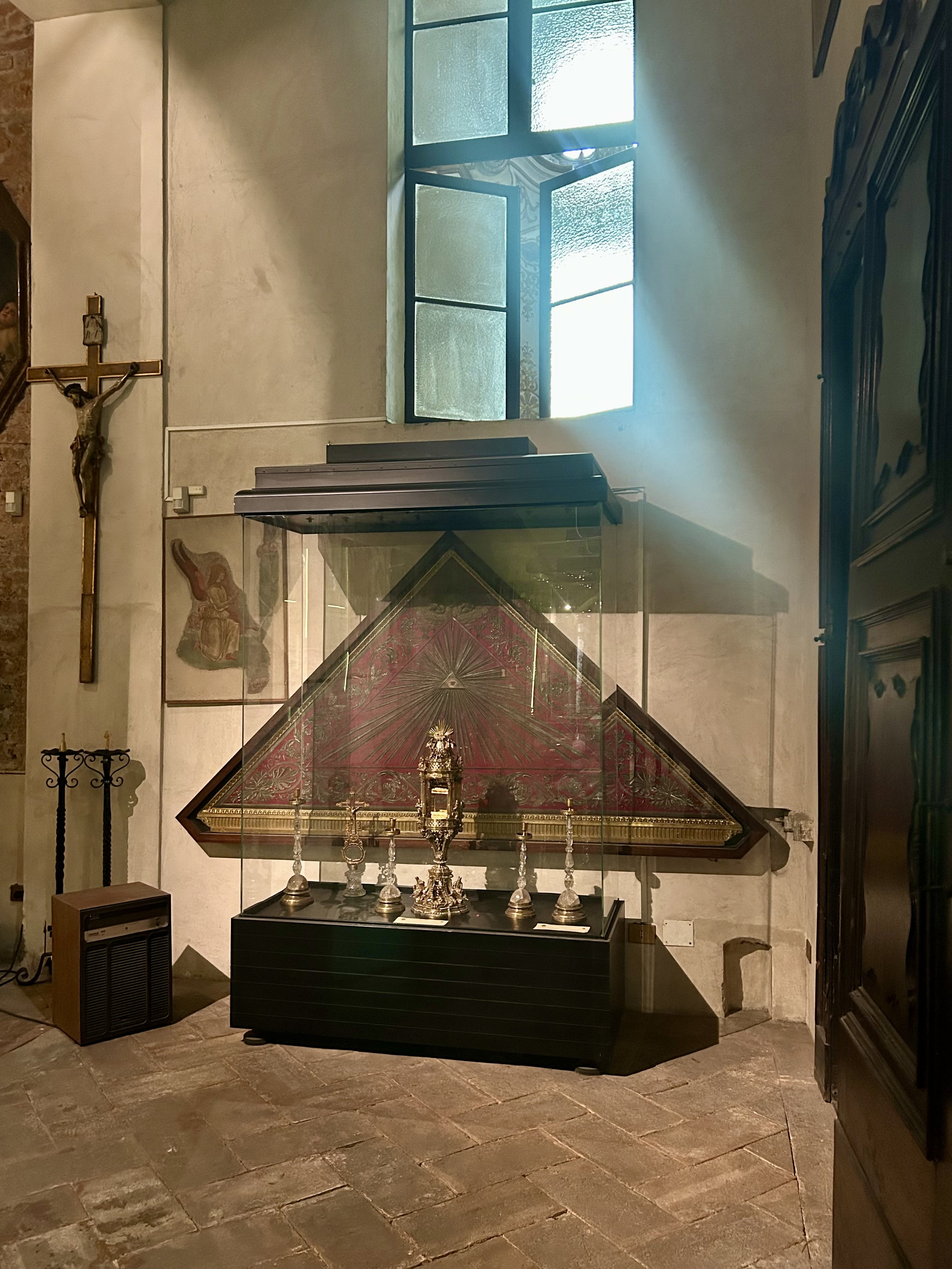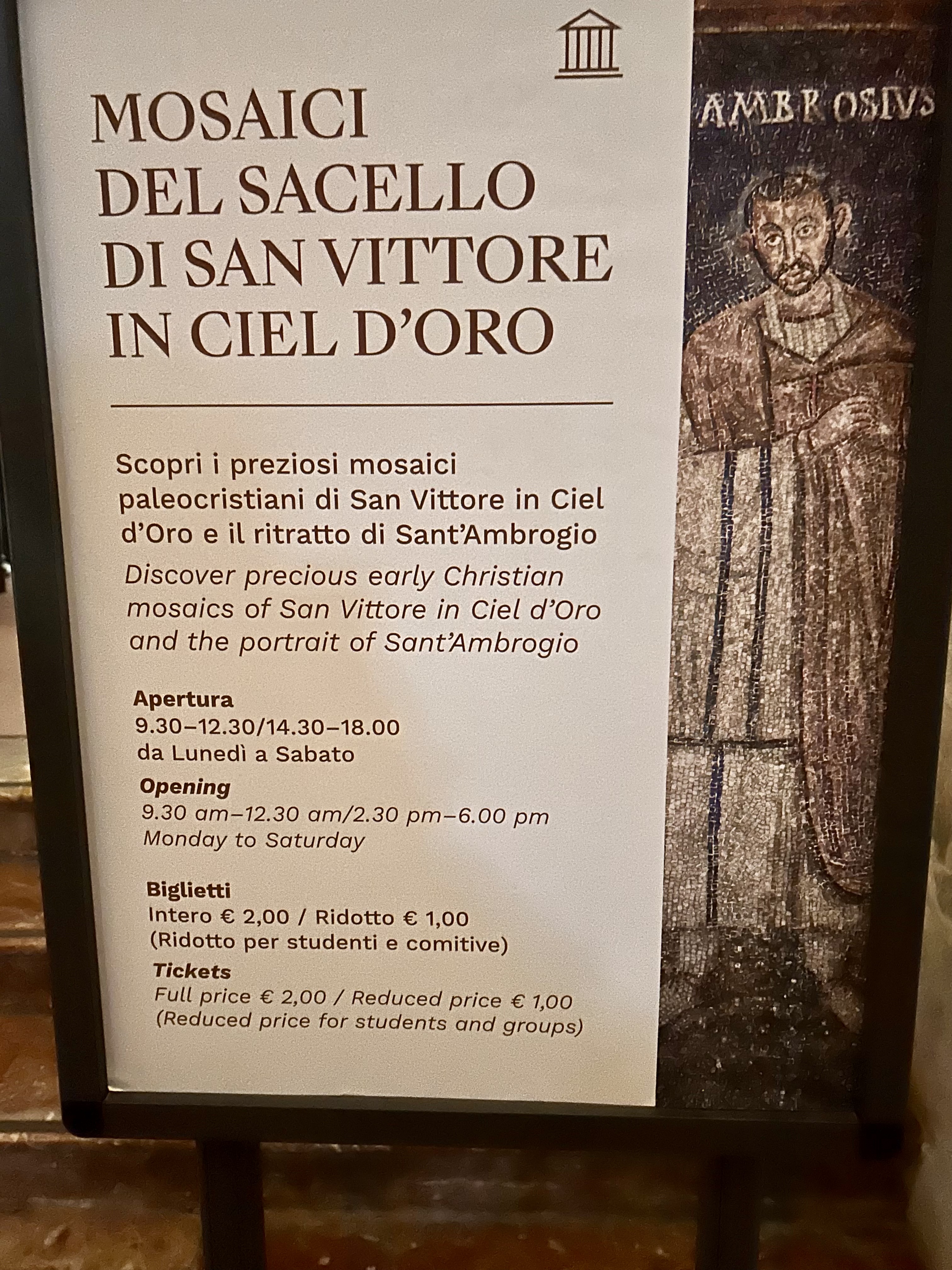 Com o ingresso de 2 Euros por pessoa, pode-se entrar na capela de San Vittore in Ciel d`Oro. Em uma pequena sala em forma de um trapézio – um quadrilátero com dois lados paralelos entre si -, tem uma cripta que era originalmente independente da basílica. O teto abobadado ostenta a representação antiga do bispo Ambrósio em forma de mosaico.